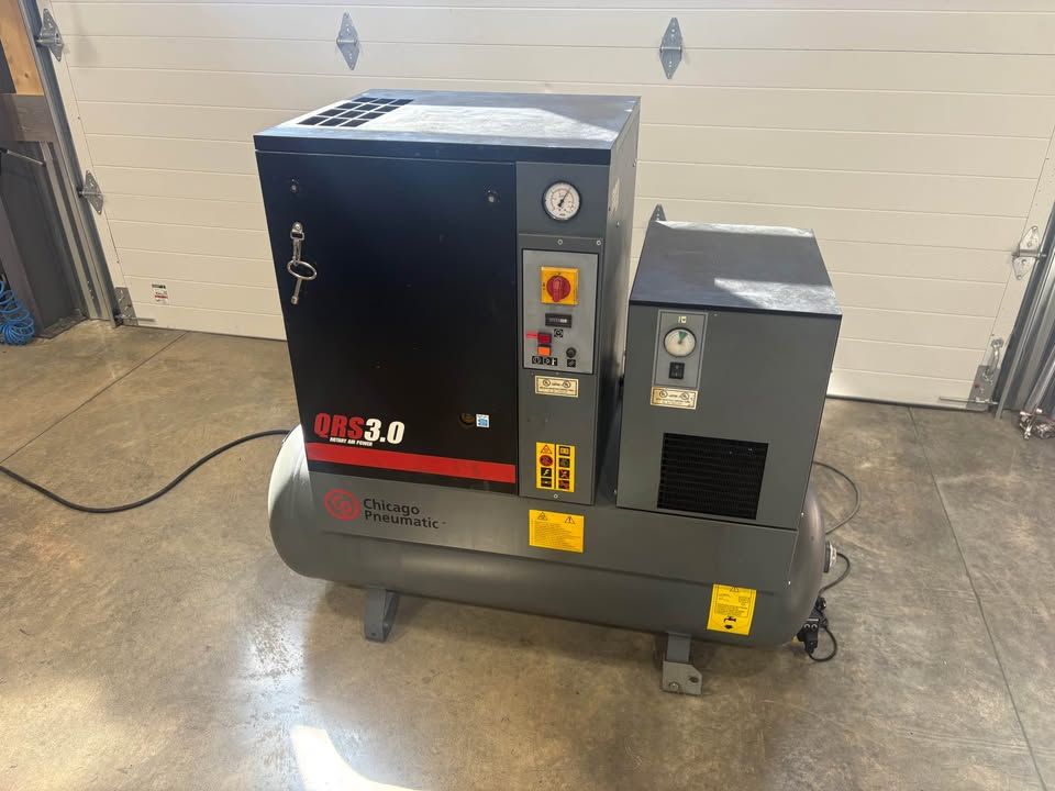 CP QRS 3.0 Rotary Screw Compressor with on board dryer. Super quite unit. Only 4500 hours (this is very low for a rotary unit). Just fully serviced, new oil and filters and separator. Extra filters and separators included. This is the ultimate compressor for your home shop. Located in Heber. Can bring to SLC.