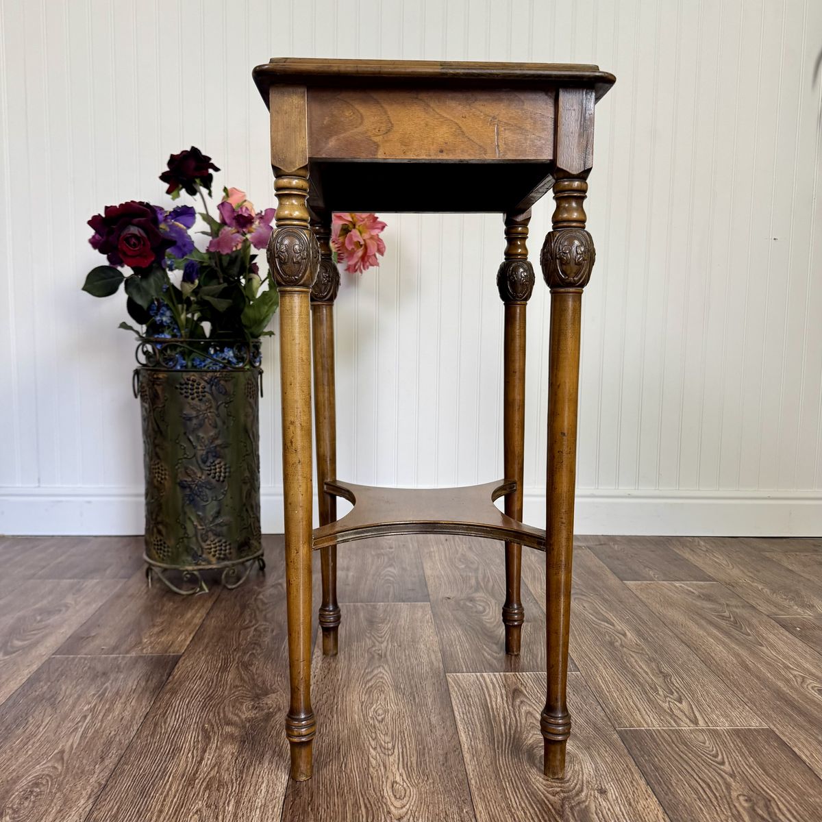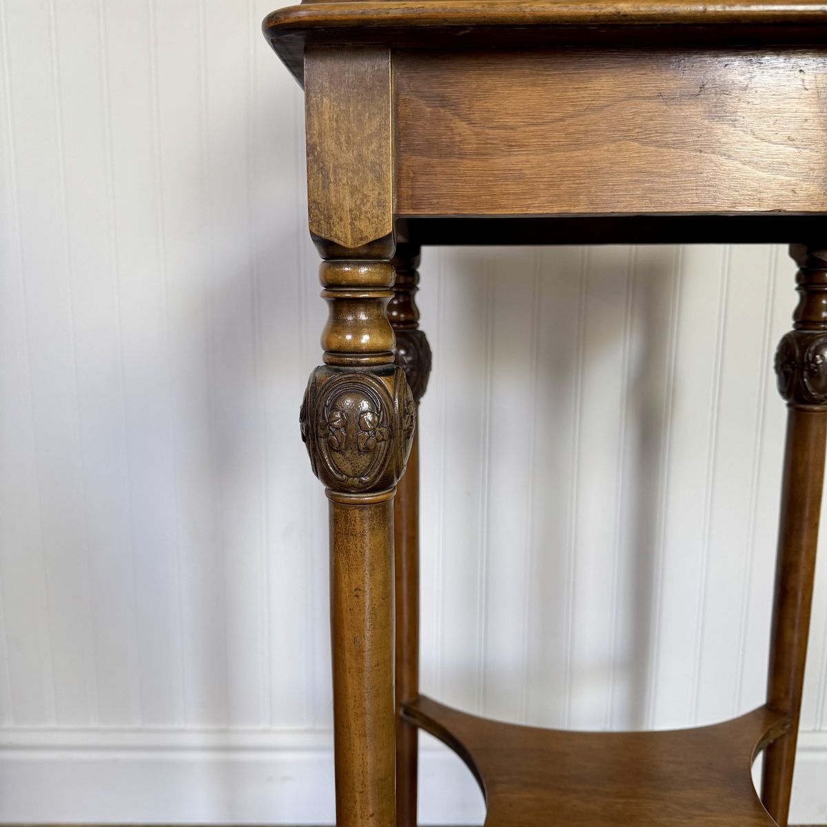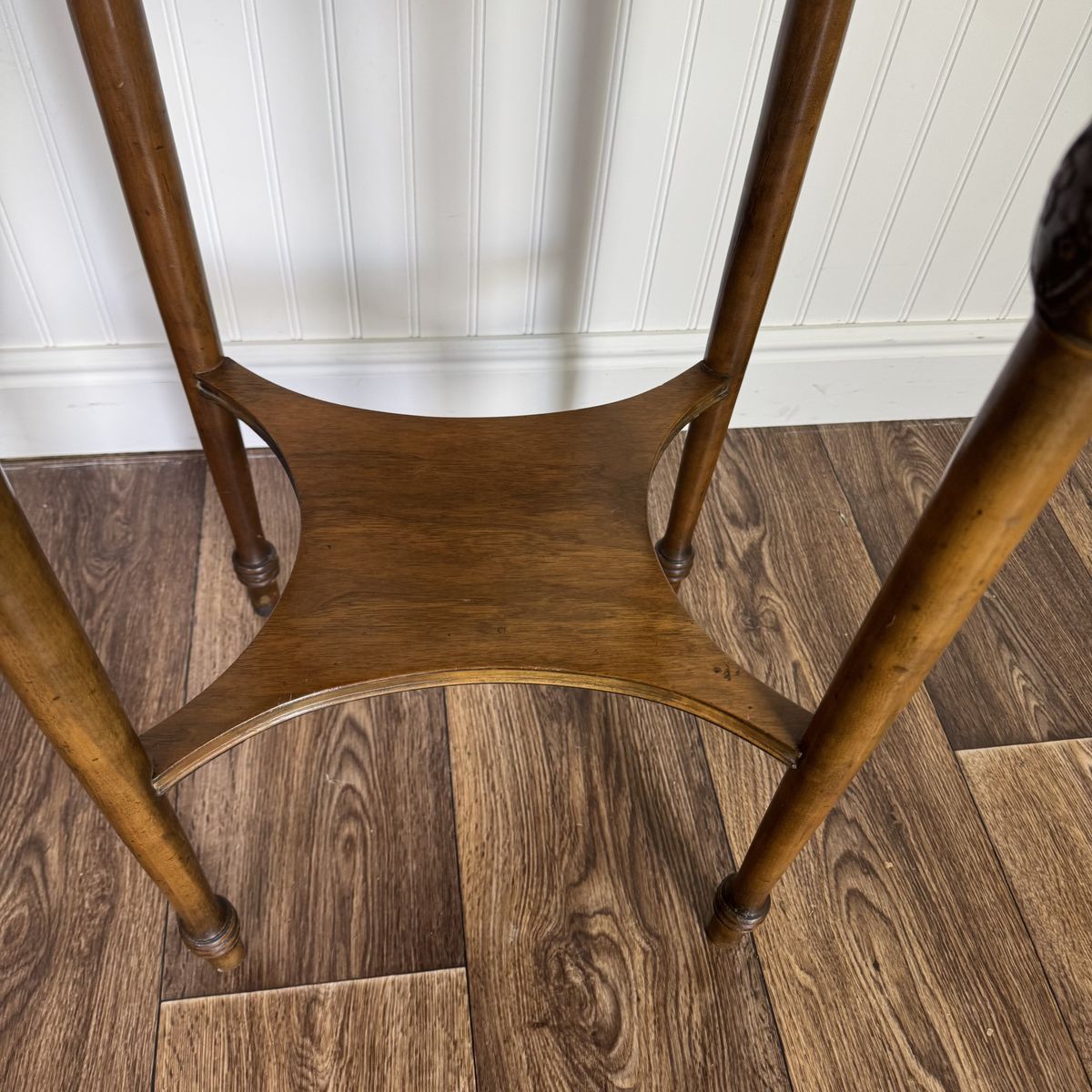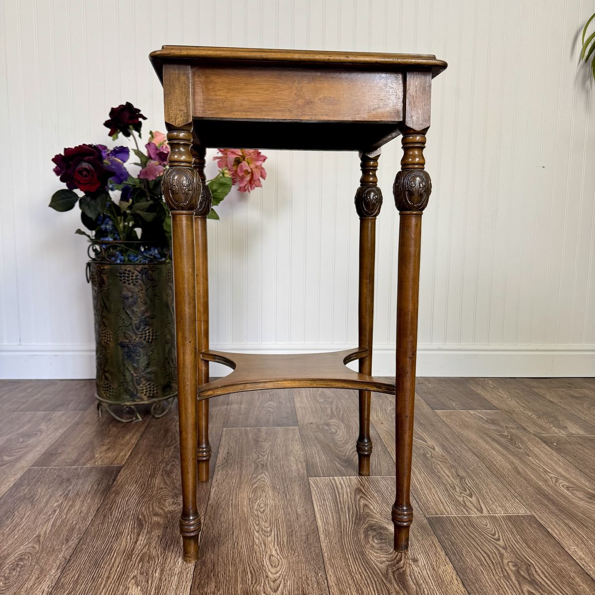 VenmoVintage carved wood plant stand featuring turned legs, carved medallion details, and a warm walnut finish that works beautifully in traditional, vintage, or eclectic interiors.