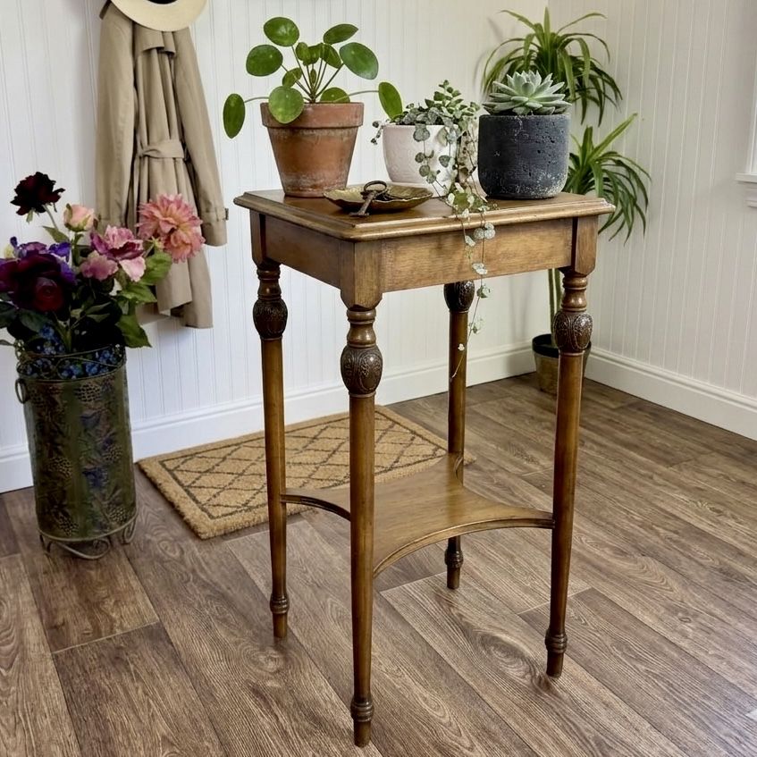 Perfect as a, plant stand, lamp table, small side table, or entryway accent piece. The lower shelf adds extra display space for a second plant, basket, or decorative objects.