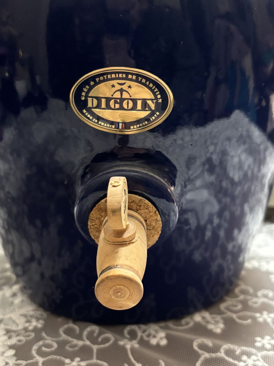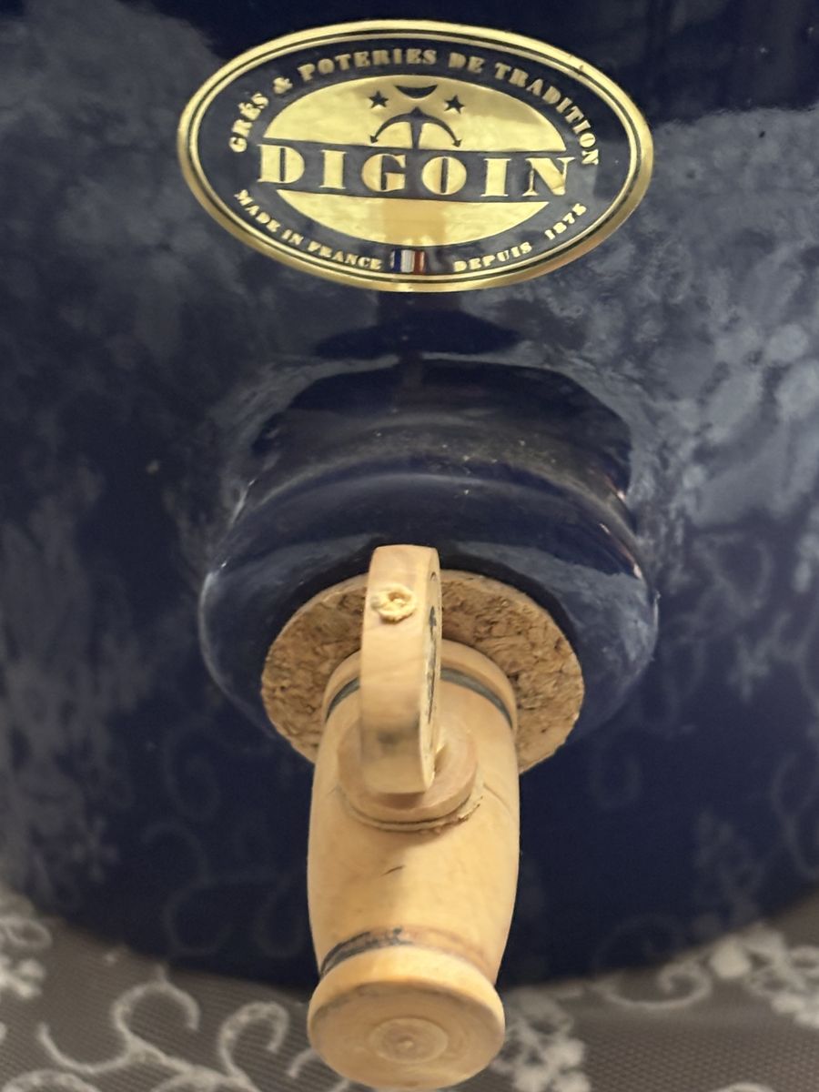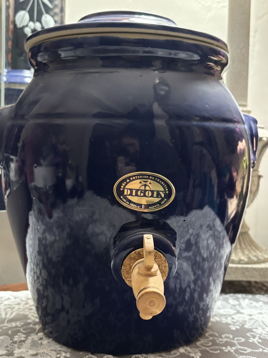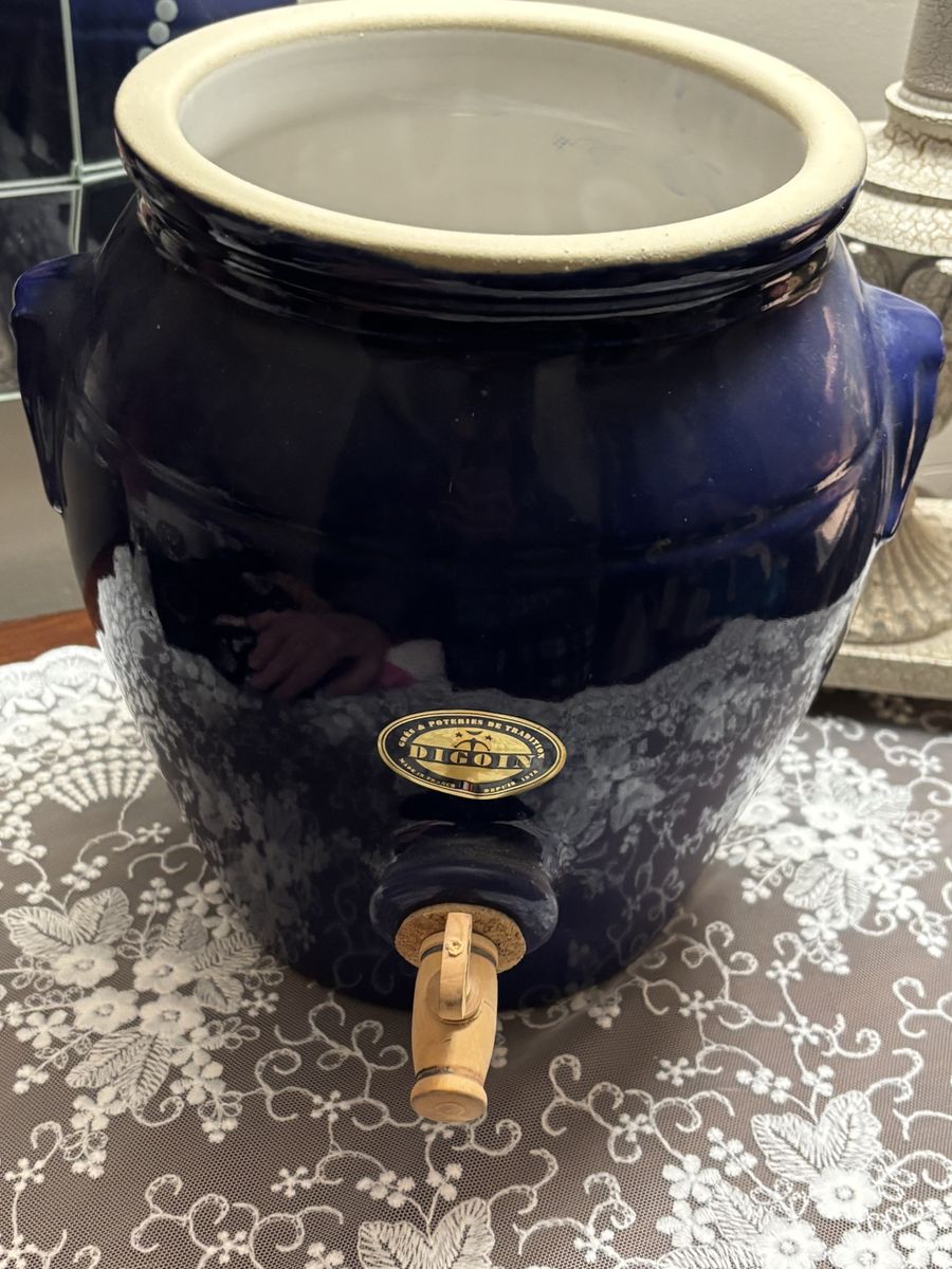ZelleThis vintage Digoin stoneware French "vinegar pot" with dispenser, is in a glorious cobalt blue salt glazed finish. This crock, a unique, rare, vintage French Vinegar Pot is heirloom quality! It's in pristine condition with the instructions in both English and French. A perfect addition to a French Country kitchen, French Farmhouse, Shabby Chic, or to your wine collection. French Farmhouse Pottery is exquisitely made, and will last for generations when cared for.
