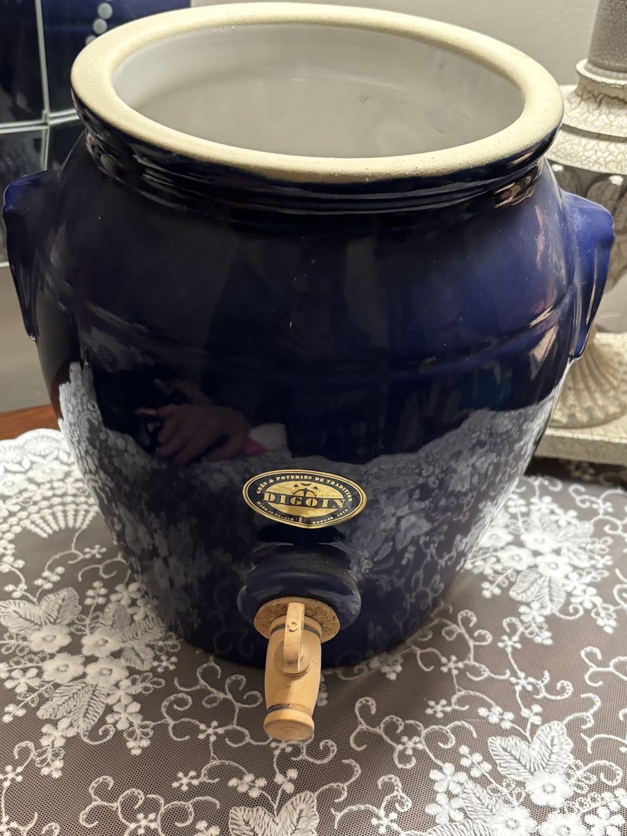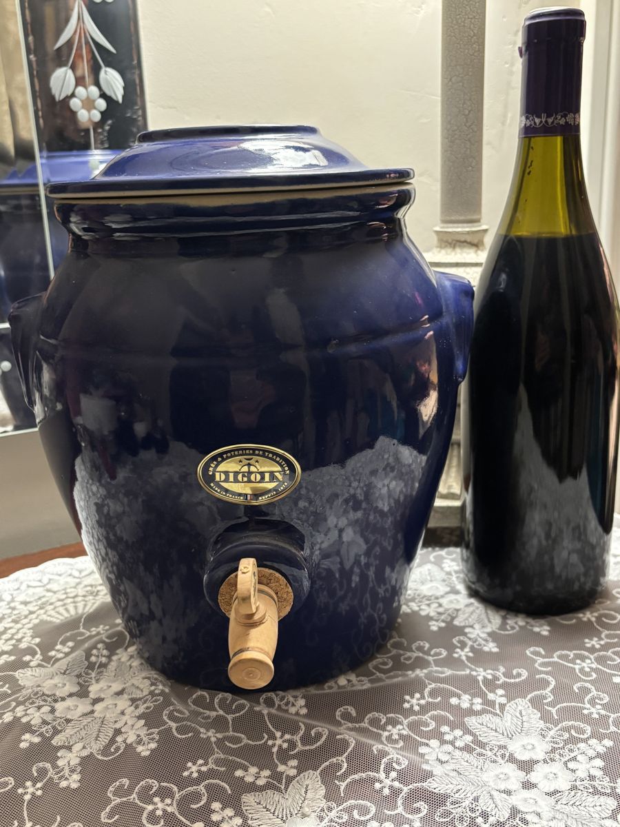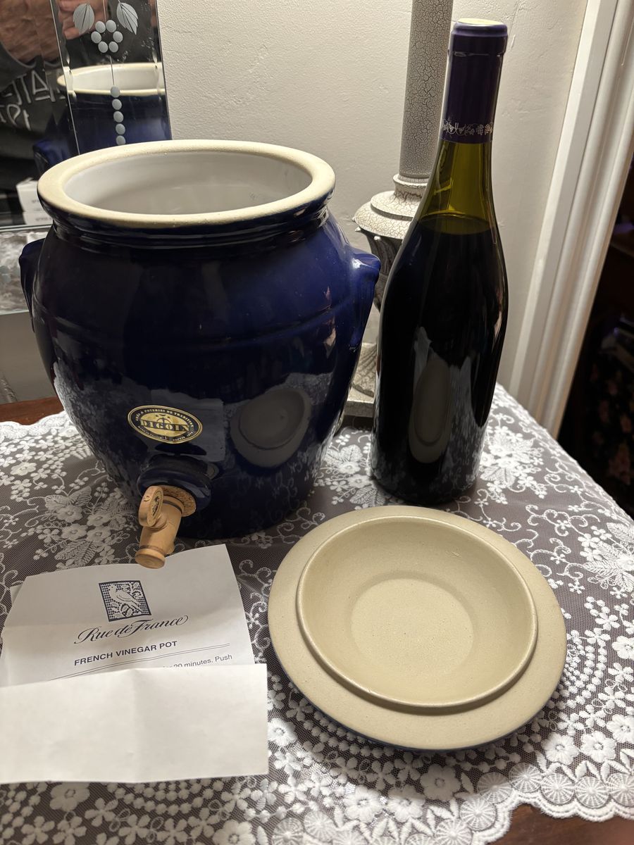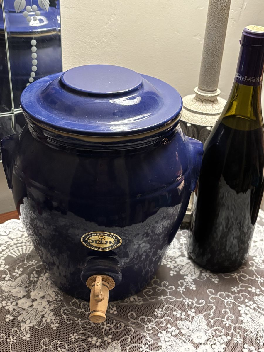 ZelleThis vintage Digoin stoneware French "vinegar pot" with dispenser, is in a glorious cobalt blue salt glazed finish. This crock, a unique, rare, vintage French Vinegar Pot is heirloom quality! It's in pristine condition with the instructions in both English and French. A perfect addition to a French Country kitchen, French Farmhouse, Shabby Chic, or to your wine collection. French Farmhouse Pottery is exquisitely made, and will last for generations when cared for.