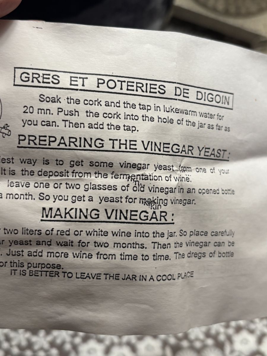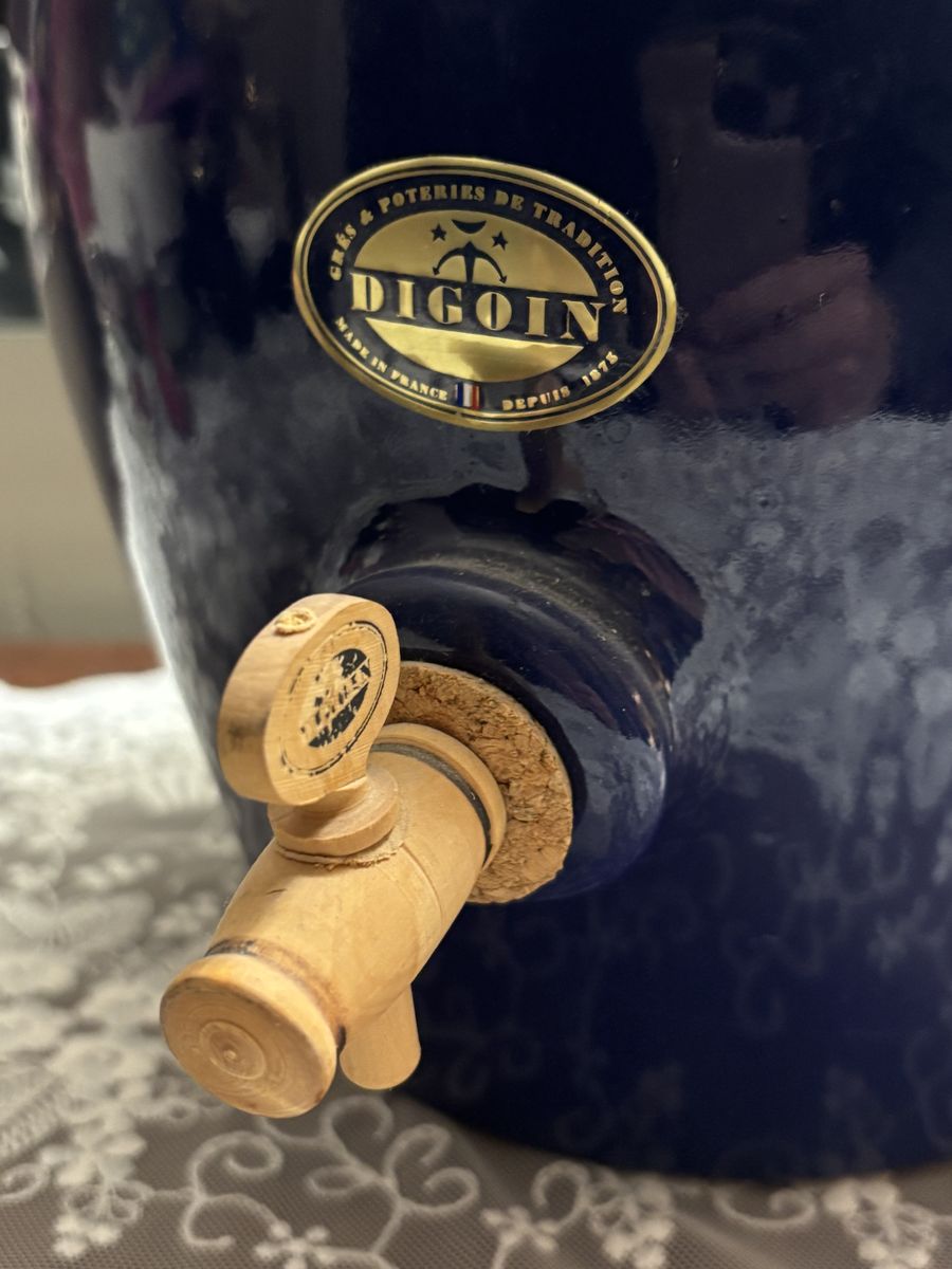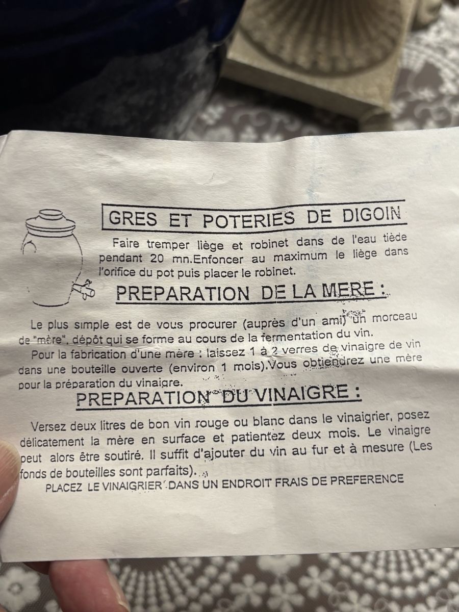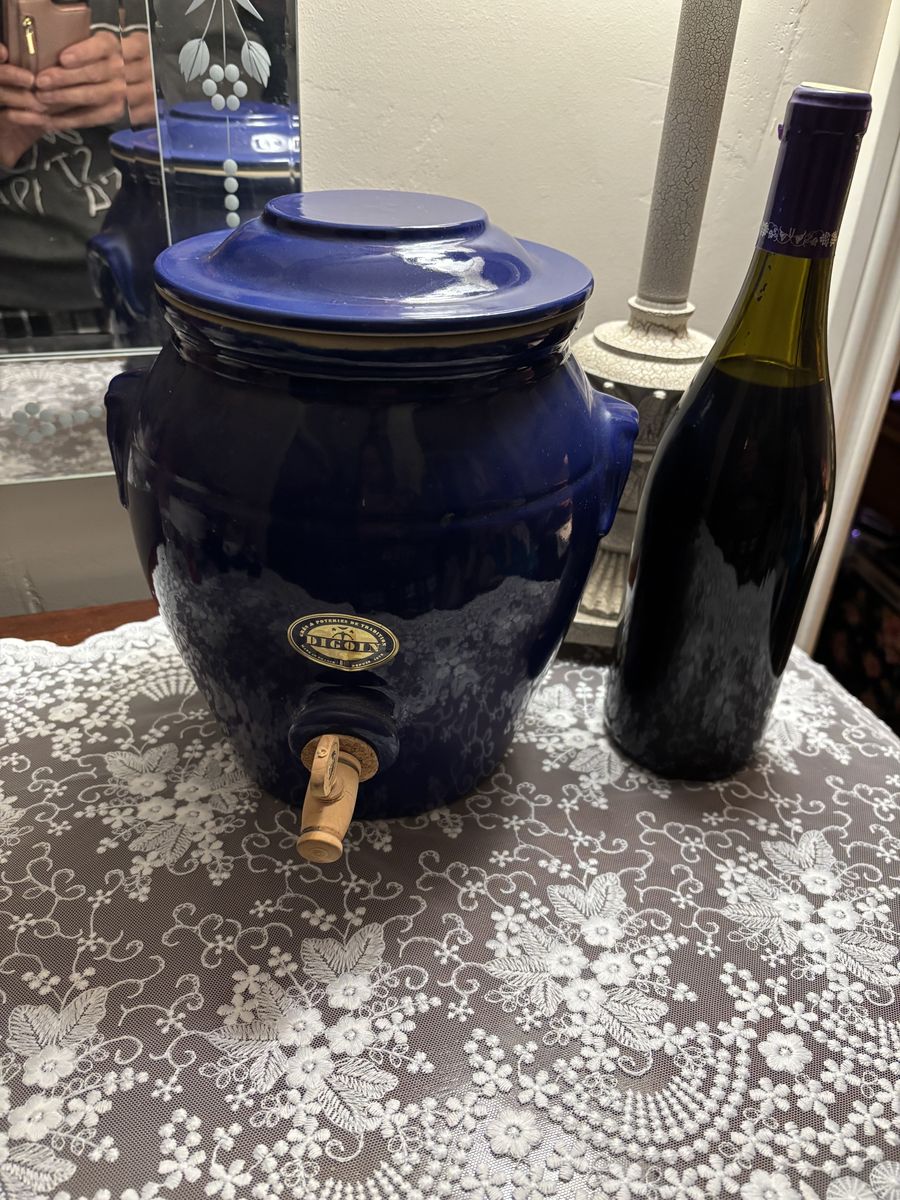 ZelleThis vintage Digoin stoneware French "vinegar pot" with dispenser, is in a glorious cobalt blue salt glazed finish. This crock, a unique, rare, vintage French Vinegar Pot is heirloom quality! It's in pristine condition with the instructions in both English and French. A perfect addition to a French Country kitchen, French Farmhouse, Shabby Chic, or to your wine collection. French Farmhouse Pottery is exquisitely made, and will last for generations when cared for.