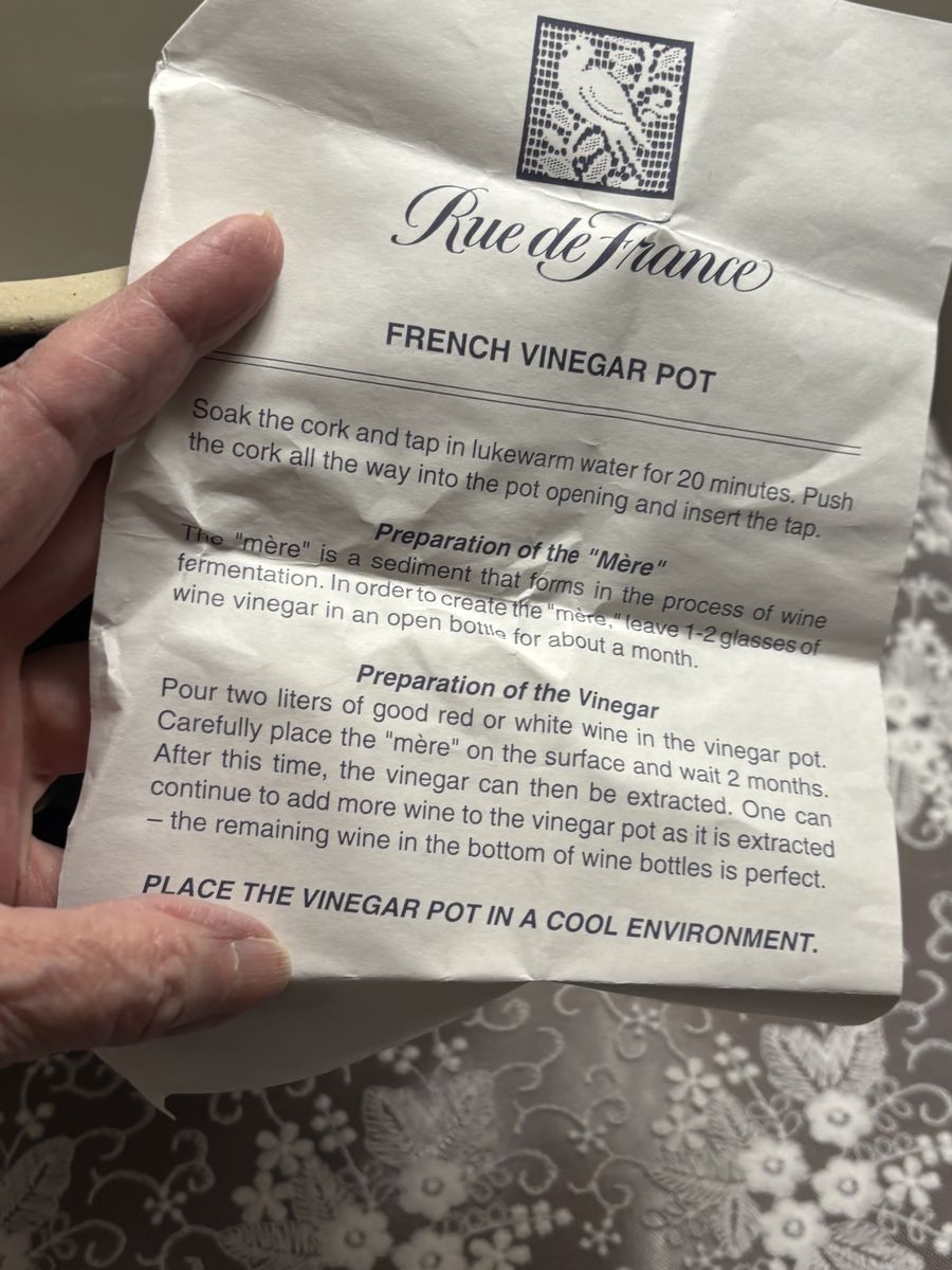 French Vinegar Pots are meant to contain the leftover wine remnants, which are simply poured into the vessel and allowed to turn into vinegar. (And then of course, that wine vinegar is fabulous with olive oil and crusty bread...)