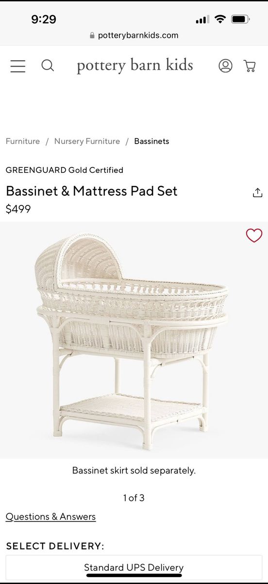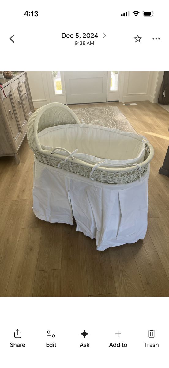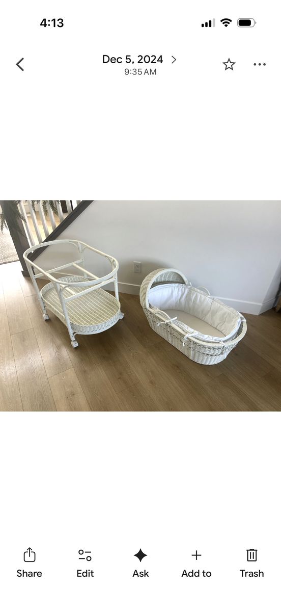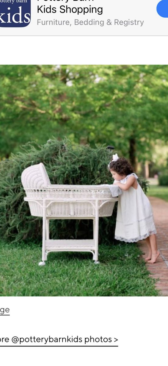 VenmoWicker baby bassinet with wheels. Love the classic and vintage feel of this. Bassinet can be removed from base and moved separately. We used it next to our bed before we were ready to transition to the nursery.