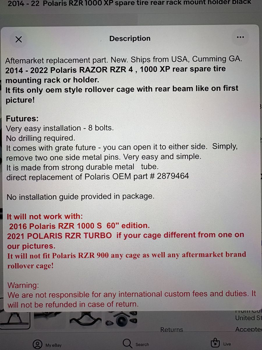 Spare tire mount for a Polaris RZR 1000 XP 2014-2022.