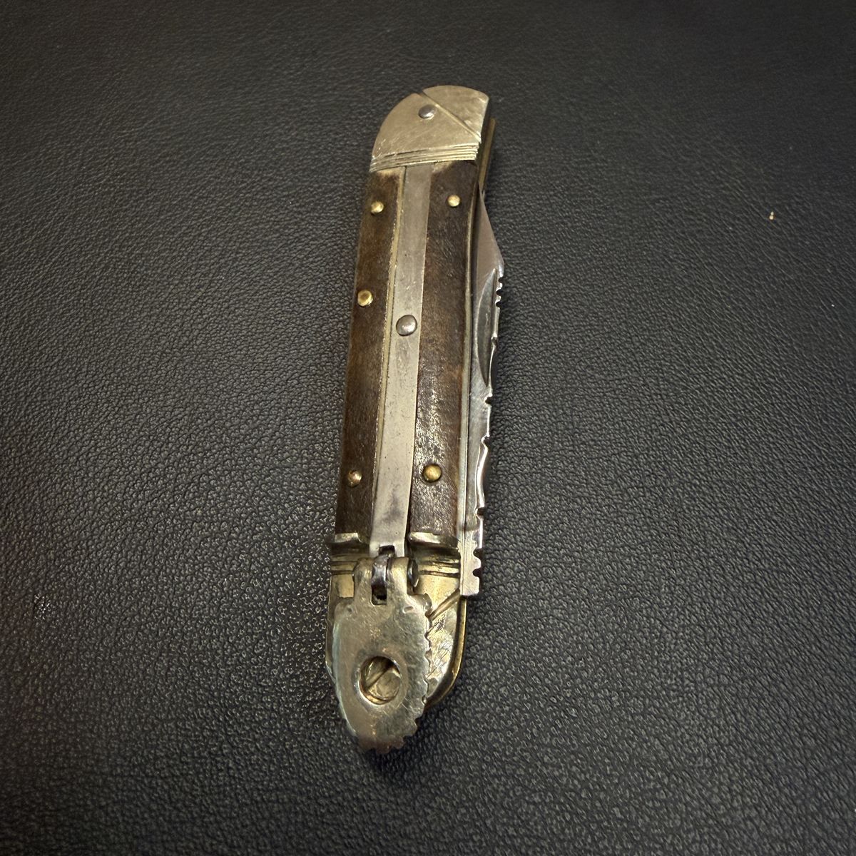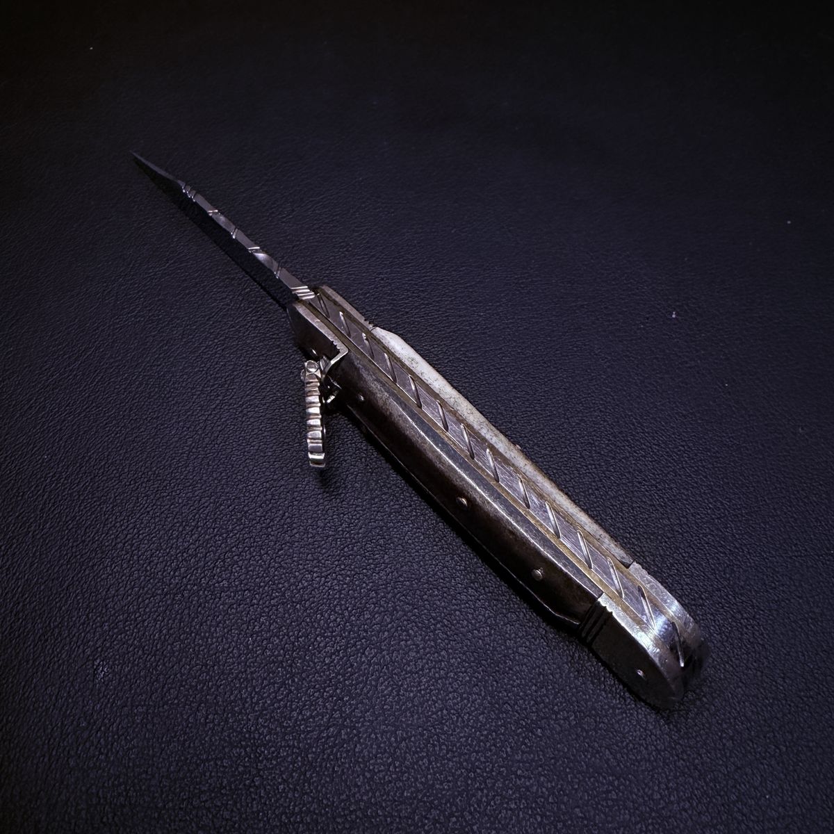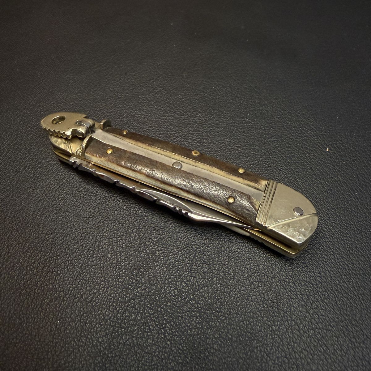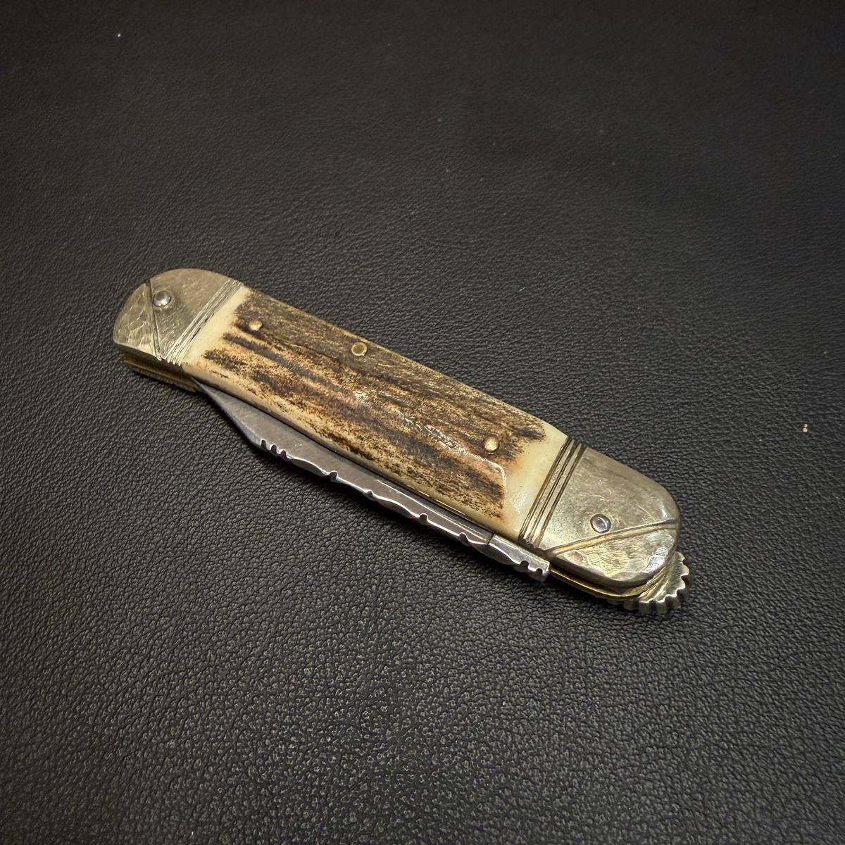 Details • Lever lock automatic mechanism • Natural stag / antler handle scales • Decorative filework along the blade spine • Brass pins with metal bolsters • Vintage construction