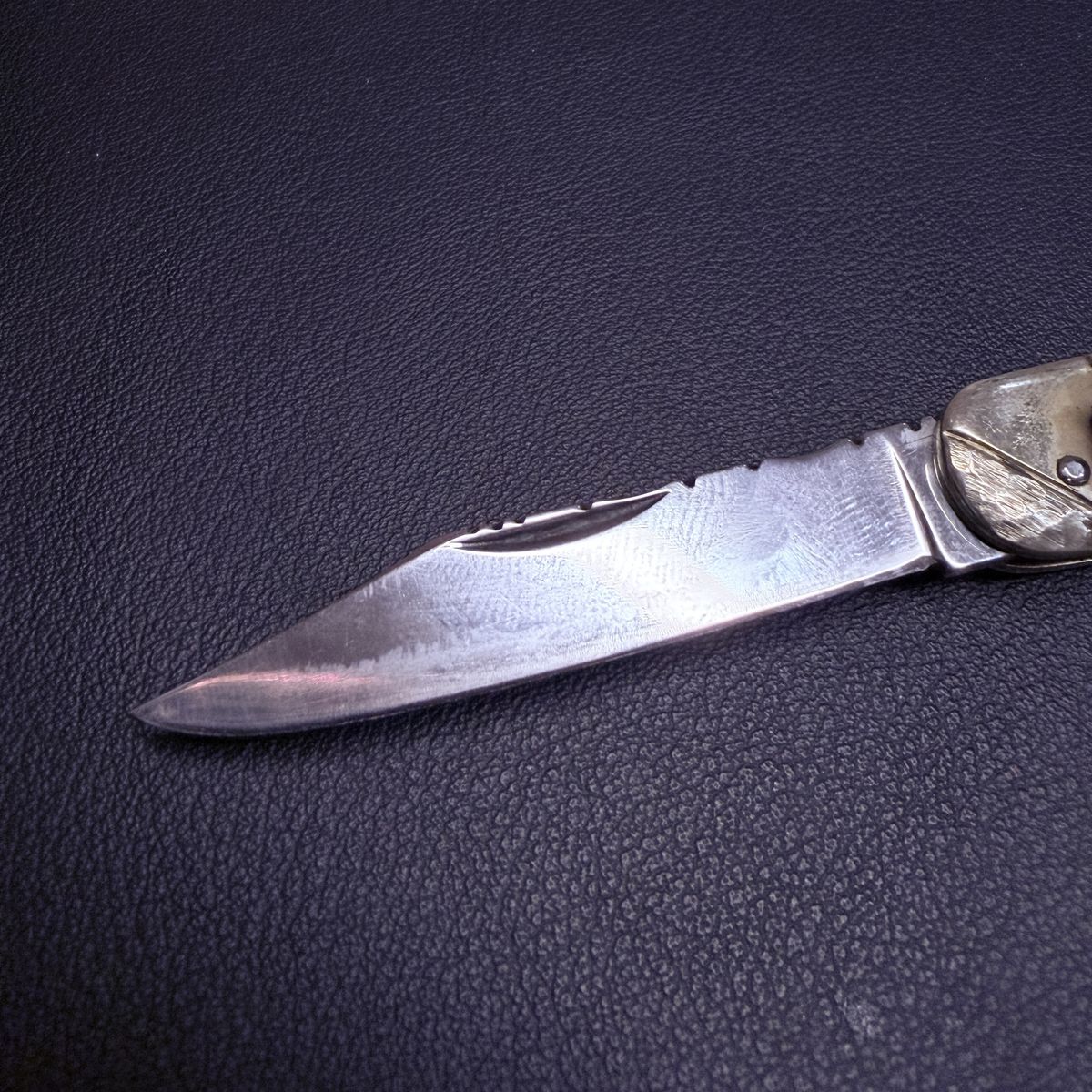 The blade spine has decorative filework detailing, giving the knife a unique custom look.