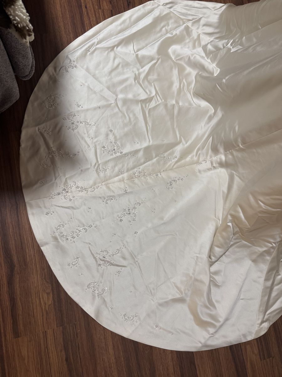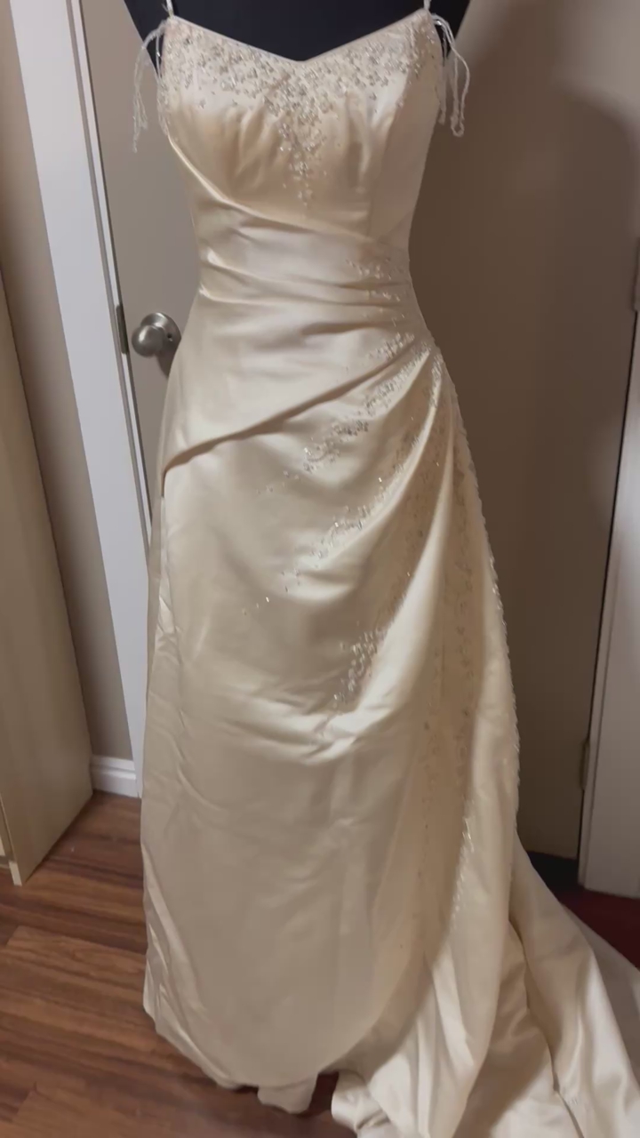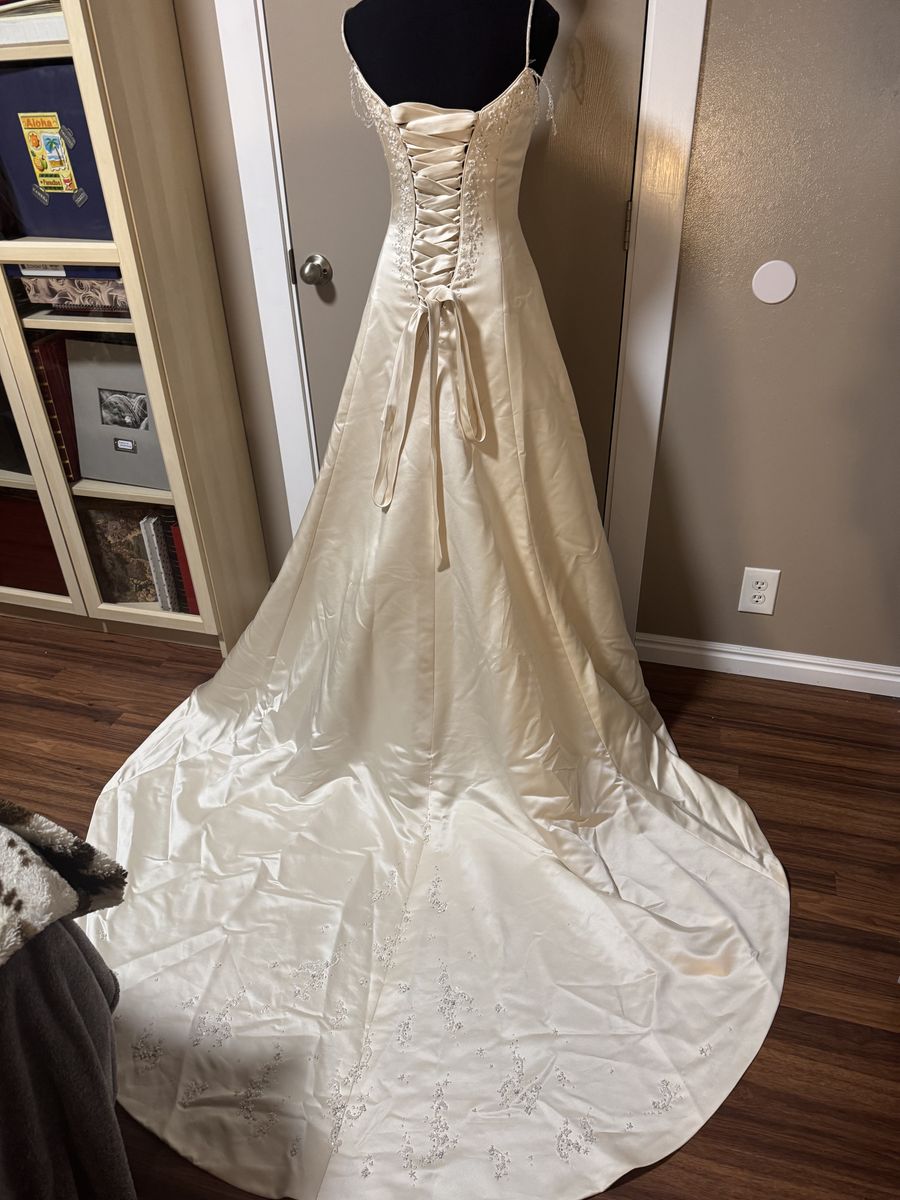 Fits my mannequin 34 inch chest 35 inch hips maybe size 4 has long train in back. Gently used, in great condition, dress is 52 1/2 inches from the chest in front.