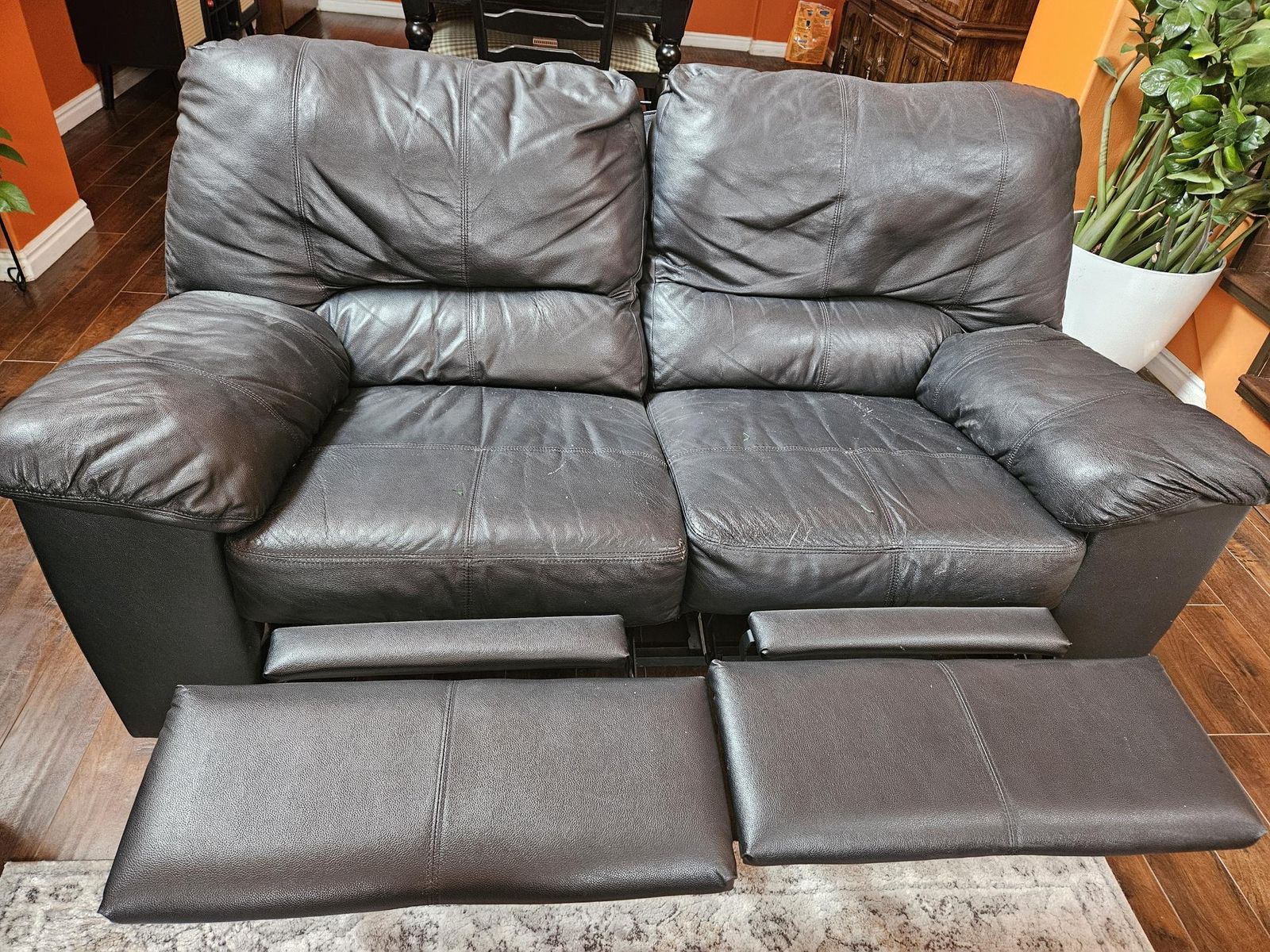 Faux Leather Black Manual Recliner sofa and loveseat set. It was in formal living room and rarely used. Looking to down size. The recliners work great and definitely a steal. If interested please call or text 408 761 9429. Pick up in South Jordan. Cash only. I will not ship. Thanks for looking.