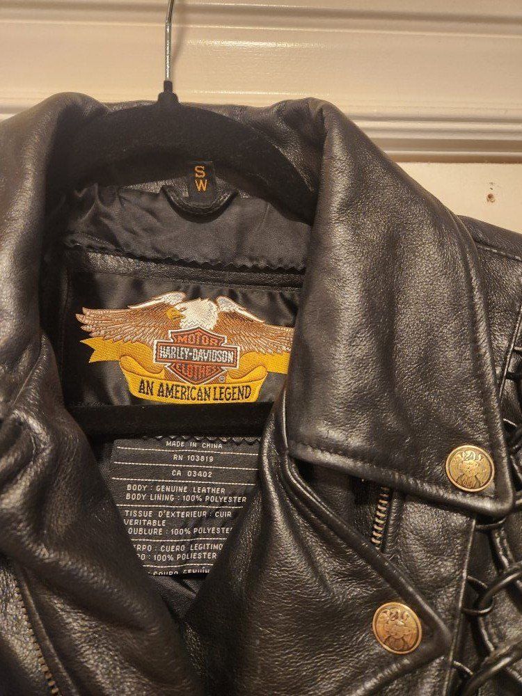 PRICE JUST LOWERED!! Harley-Davidson women's black leather motorcycle jacket, specifically a vintage style known for its distinctive lace-up (braided) detailing on the front and back. Worn maybe twice. Size women's small. $300 OBO.