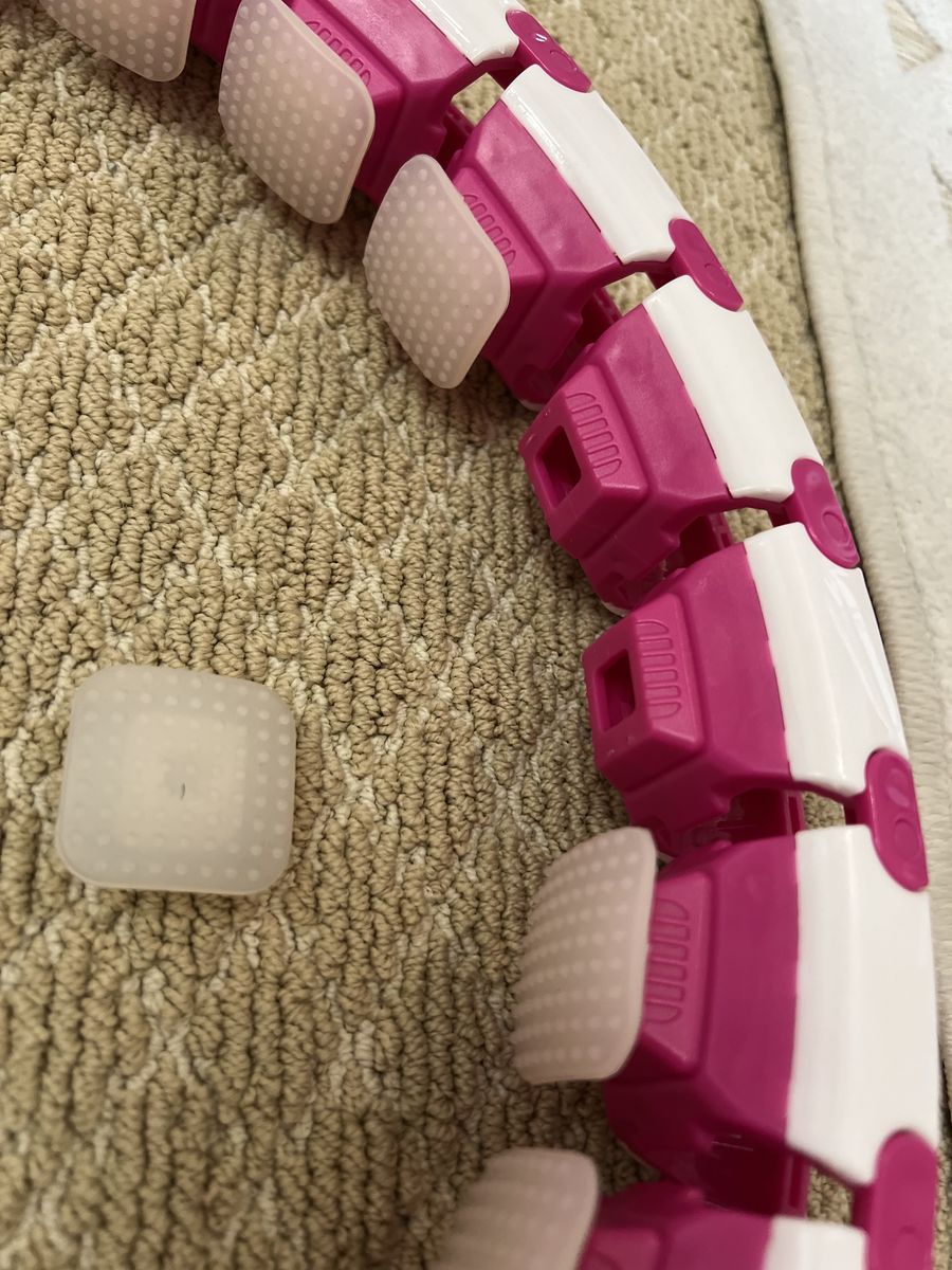 This weighted hula hoop is a great workout while watching T.V! It has a weighted ball that you swing around and the hoop is adjustable. Unfortunately, 4 plastic peices fell out I still have one. (not entirely sure how to get them back in) It feels just fine without it and those peices can be removed. Asking for 7$