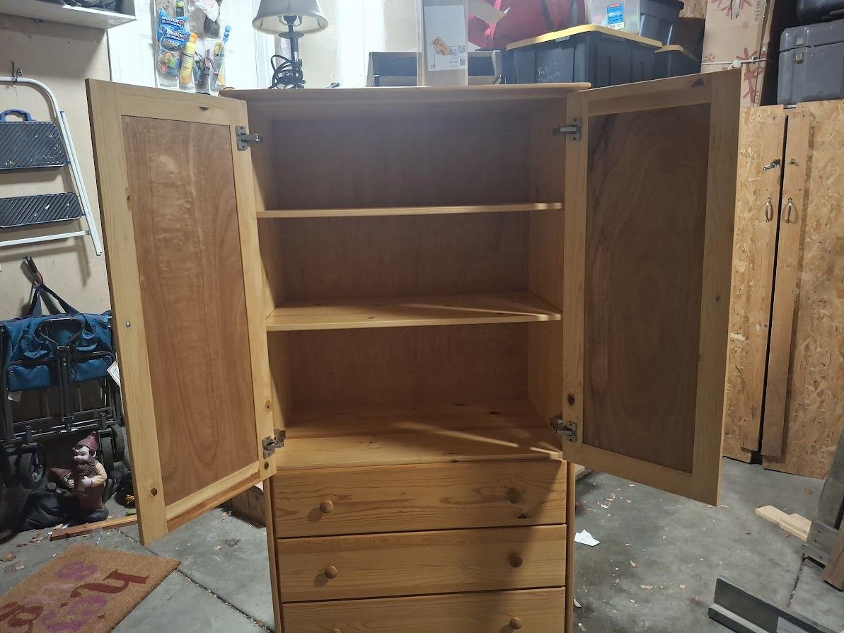 VenmoSolid wood armoire with 3 deep drawers, 68" H x 36" W x 20.5" D, shelf space measures 38" H x 36" W x 20.5" D. Texts or KSL Messages preferred.