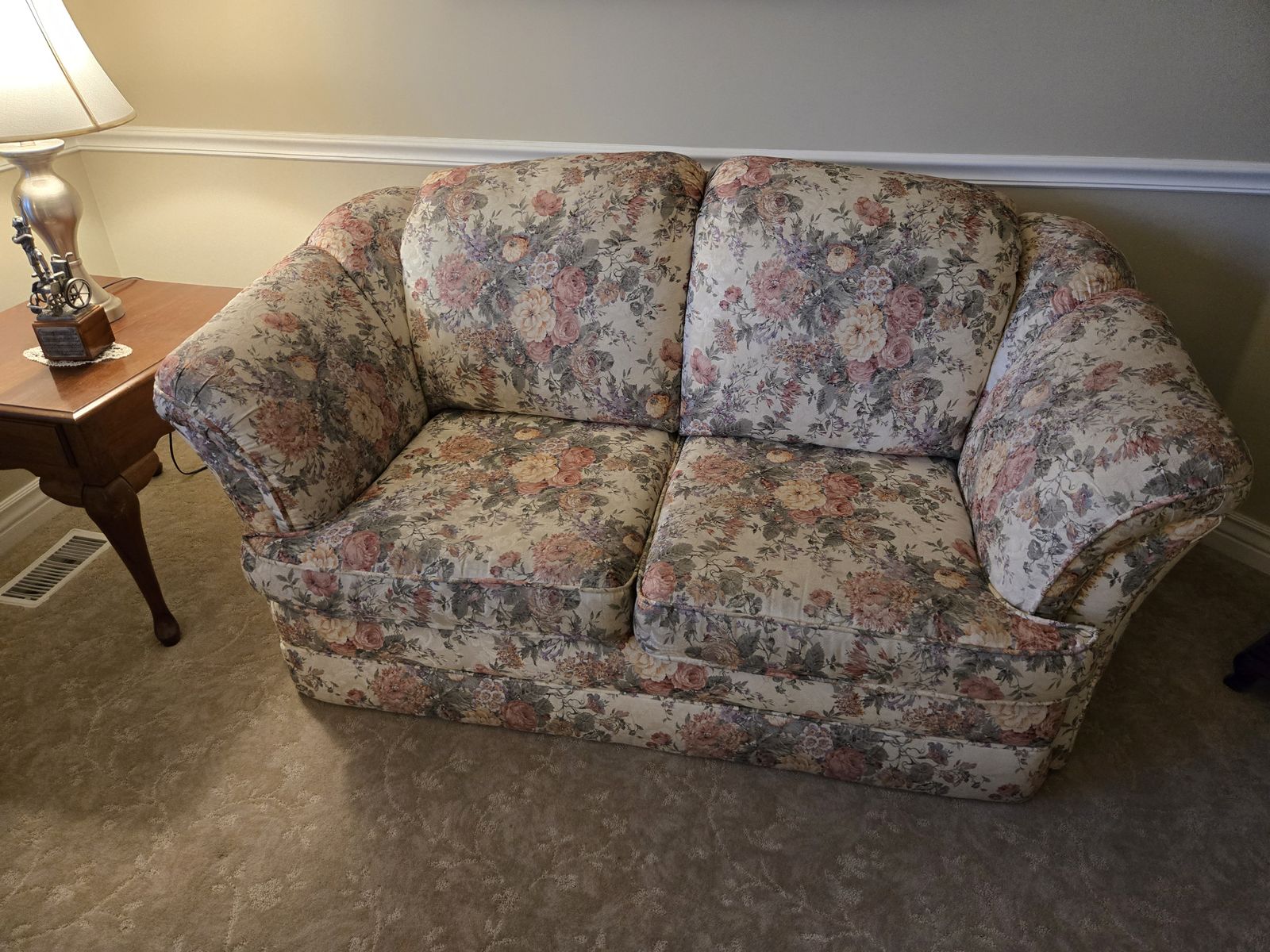 VenmoBeautiful floral fabric sofa and loveseat set in a classic traditional style. Both pieces are used but in good condition, with no tears or rips in the fabric. The cushions are comfortable and the pattern adds a warm, timeless look that works well in a home.