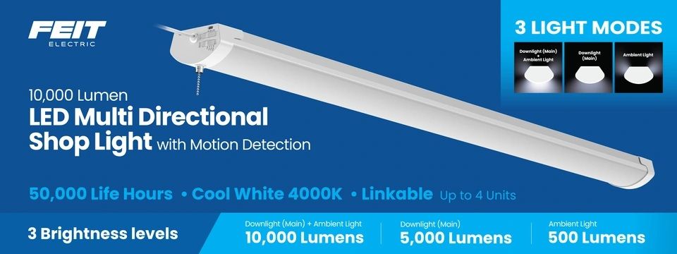 We have a small number of these FEIT SHOP840/3WY/MOT/RP 10,000 Lumen Multi-Directional Shop Lights with Motion Detection 1806331 #104692 available. These shop lights come to us in various conditions from New to Lightly Used. They come in or out of boxes. We have inspected and tested any opened or out of box units to make sure that it is in good working condition.