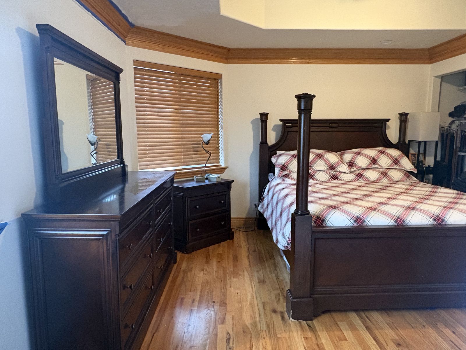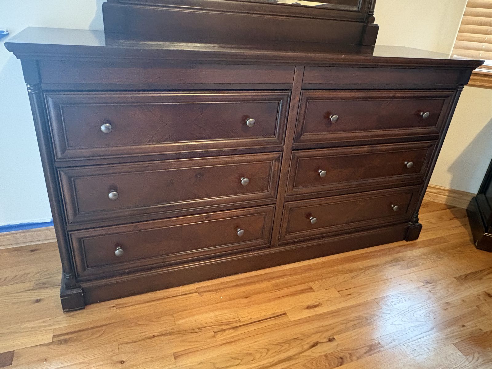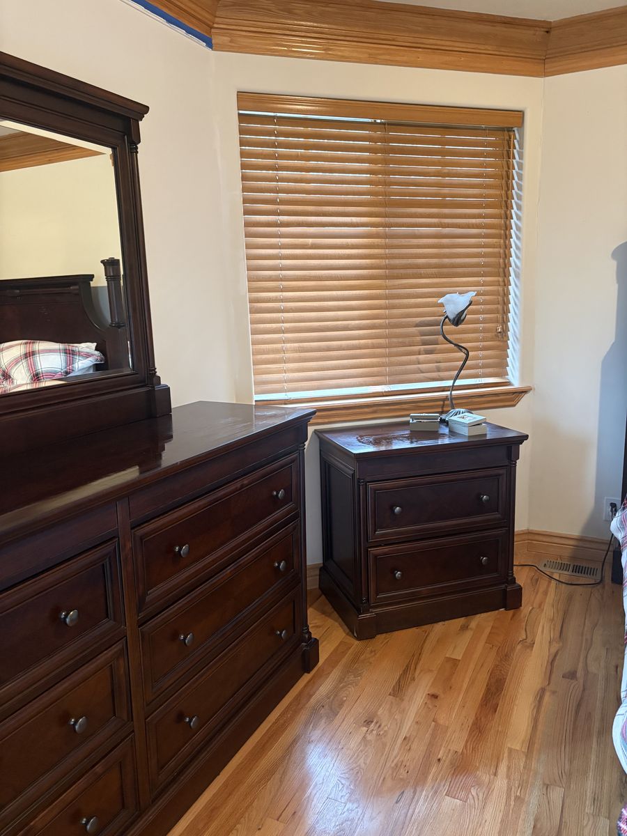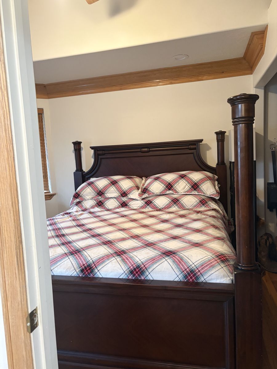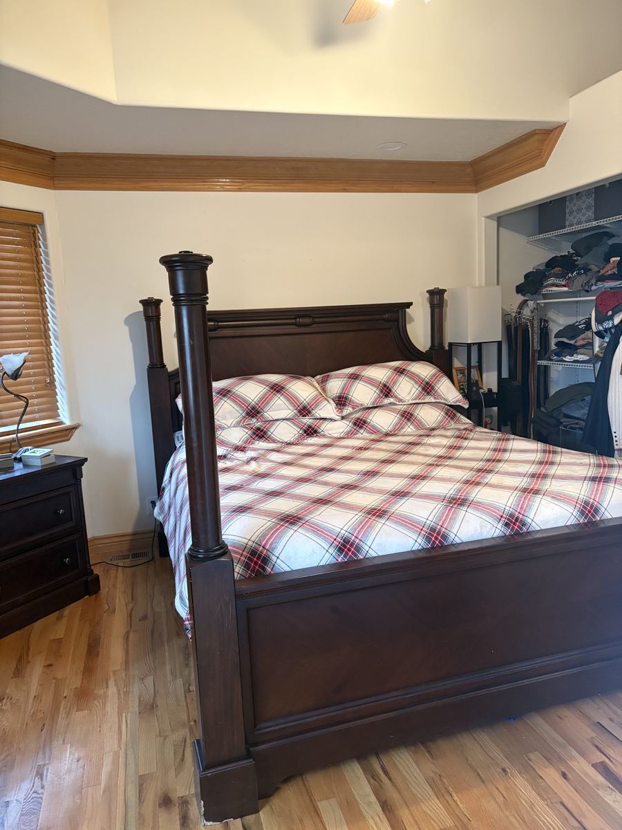 ApplePayThis is a high quality dark wood California King set. All three pieces included plus an Intellabed mattress if you want it. Minor water damage to bottoms of each piece.