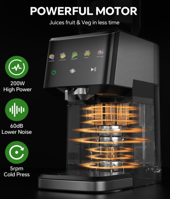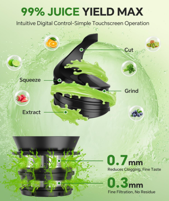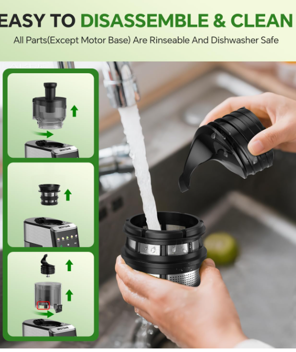 ZelleUltra Slow 55 RPM Masticating Technology- Our professional juicer machine uses slow squeezing extraction to minimize heat buildup and oxidation, preserving up to 90% more nutrients, enzymes and natural flavors compared to centrifugal juicers. It can also reduce the noise of the juicers.Perfect for making healthy juices that last longer. Extra Large 5.12" Wide Feed Chute- Fits whole fruits like apples, oranges and vegetables including carrots, cucumbers. The time can be shortened through the efficiency of juicing. Dual-Strainer Anti-Clog System & High Yield- Features double-layer 0.1mm fine mesh filters that extract up to 99% juice yield from all produce types including tough leafy greens, wheatgrass, ginger and hard root vegetables with minimal foam or pulp residue. 3-Step Quick Assembly & Easy Cleaning- Designed for convenience with only 3 main components to assemble. Includes a premium cleaning brush and food pusher. Most removable parts are dishwasher safe, the included cleaning brush helps you clean even the smallest corners,making cleanup effortless after making celery juice or other healthy drinks. Commercial-Grade Heavy Duty Construction- Built with durable BPA-free materials and 250W high-torque motor for continuous juicing. Features advanced cooling vents to prevent overheating, making this the perfect juicer for daily use in busy households.
