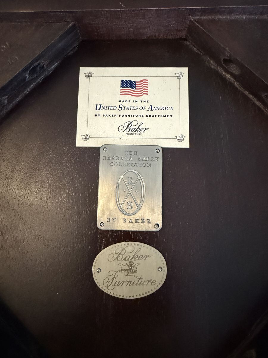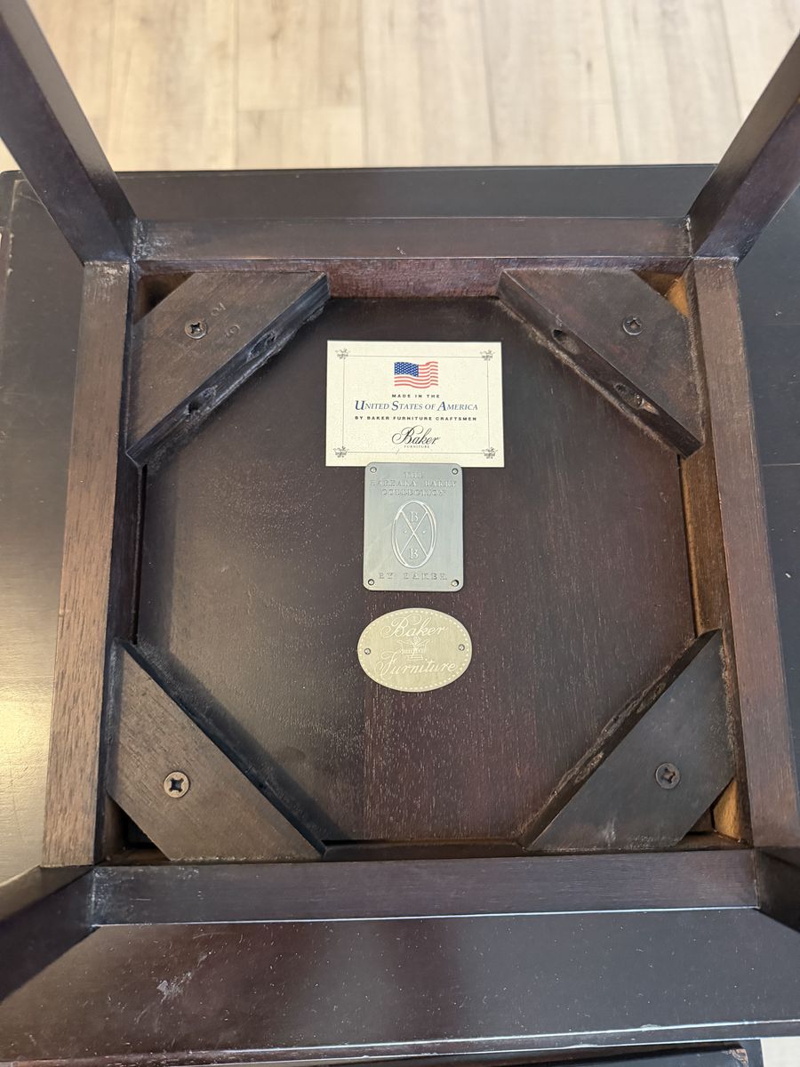 Dimensions 14.5ʺW × 14.5ʺD × 28.75ʺH Styles Contemporary Table Shape Square Brand Baker Furniture Company Designer Barbara Barry Period Late 20th Century Country Of Origin United States Item Type Vintage, Antique or Pre-owned Shop Sustainably with Chairish Materials Mahogany Condition Good Condition, Original Condition Unaltered, Some Imperfections Color Brown