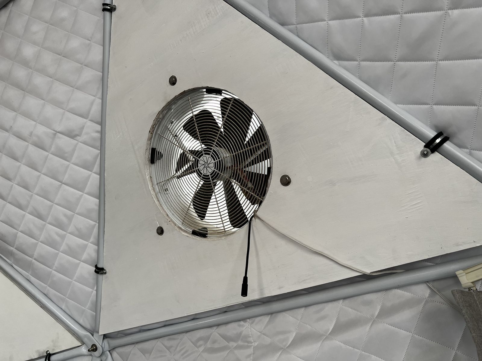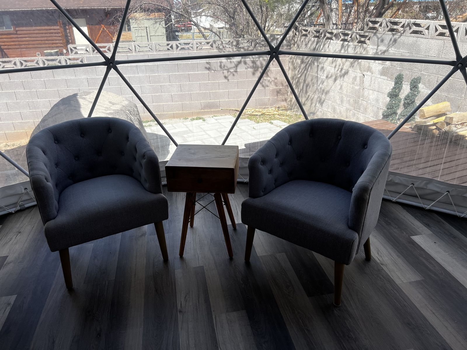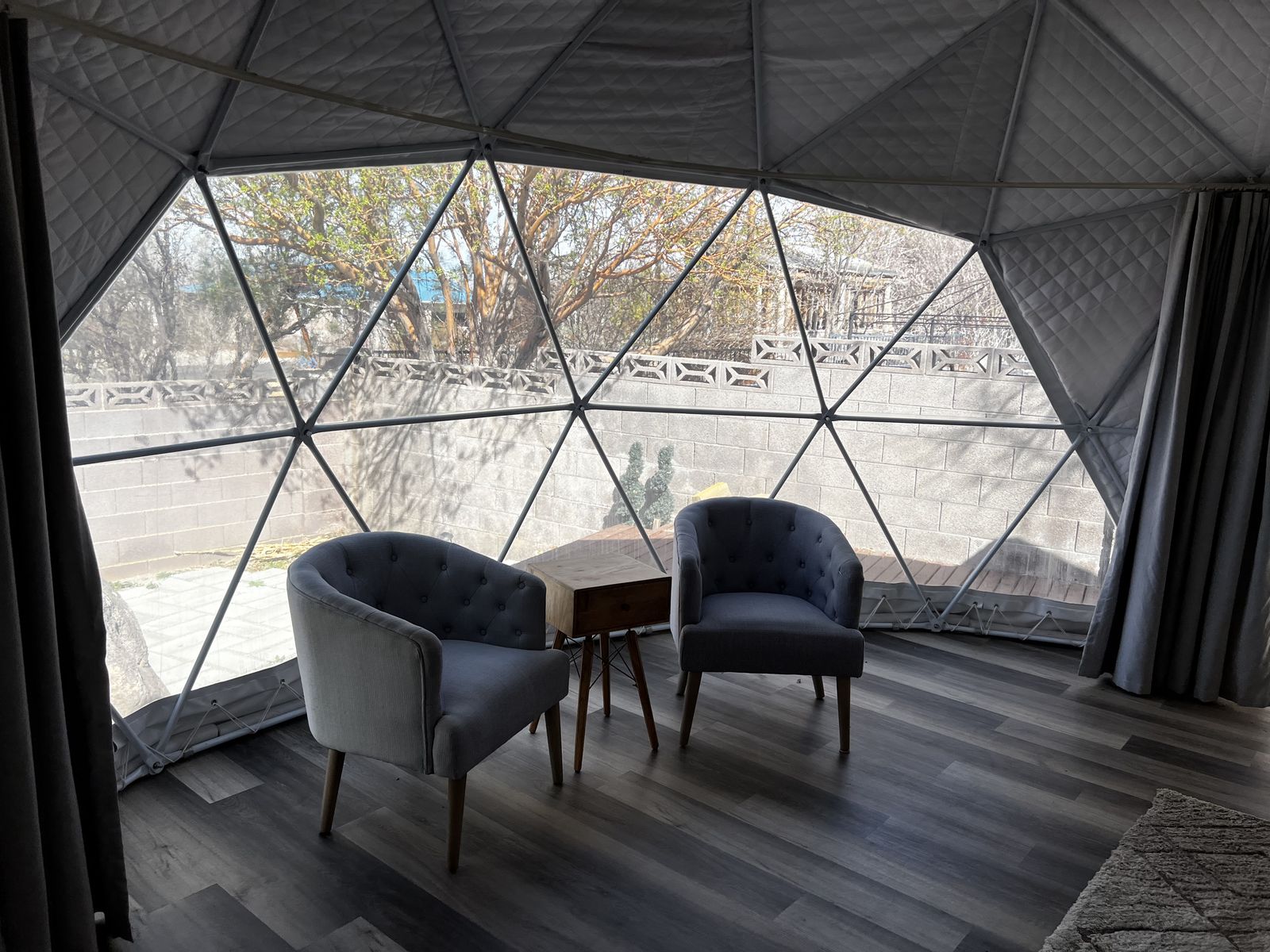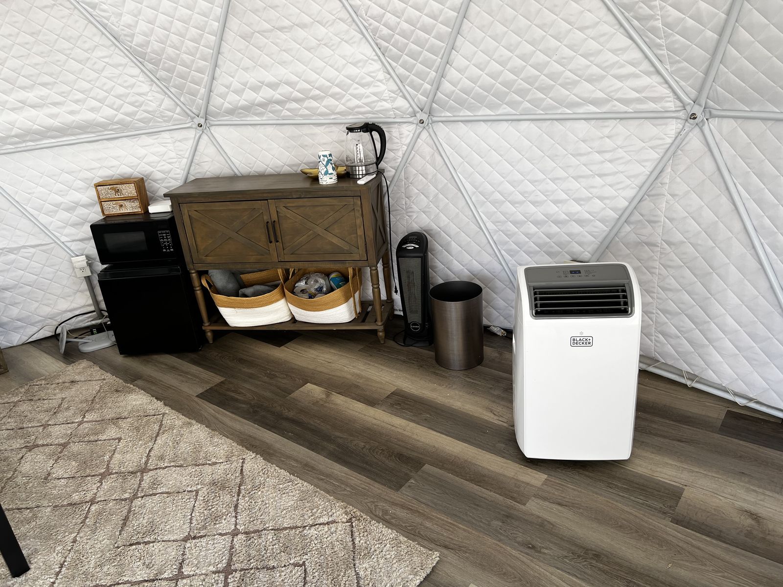 It comes with the dome, the furniture, the AC unit, and a couple of heaters. It has a solar powered vent fan and a place where you could pipe a chimney up and out for a wood burning stove if you wanted.