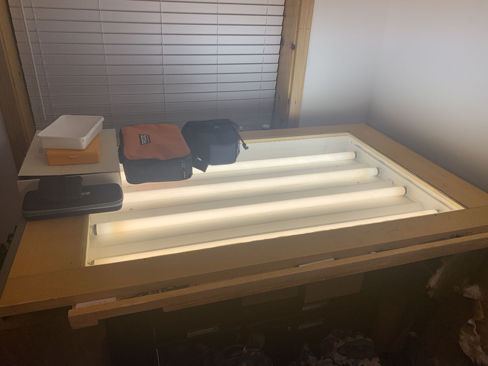 VenmoLight table. Approx 39x62 inch table top. Can raise and lower. Has two light brightness settings. Bottom has tree drawers and large open storage space. Works great. Nice and sturdy.
