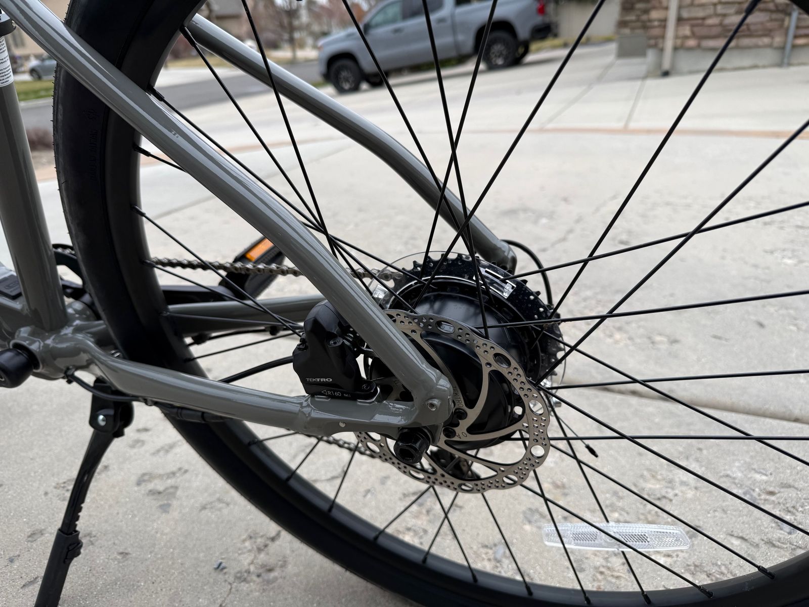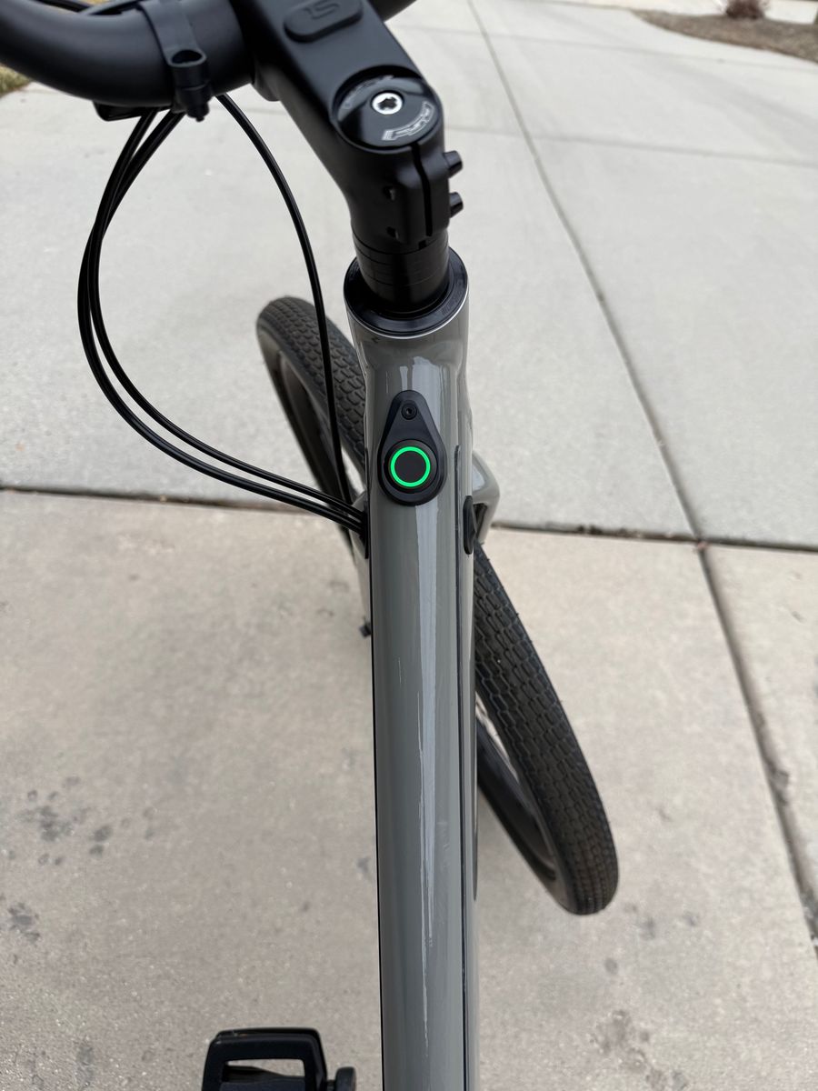 E) Integrated wheel sensor helps track your (like speed, distance, and calories burned), registers your bike, reminds you of needed service, and more, all through the free Cannondale App.