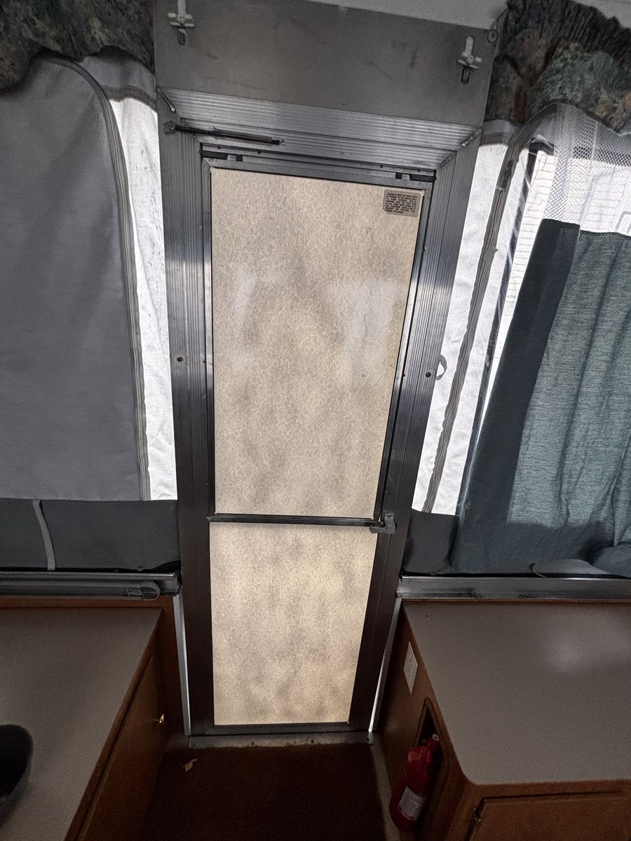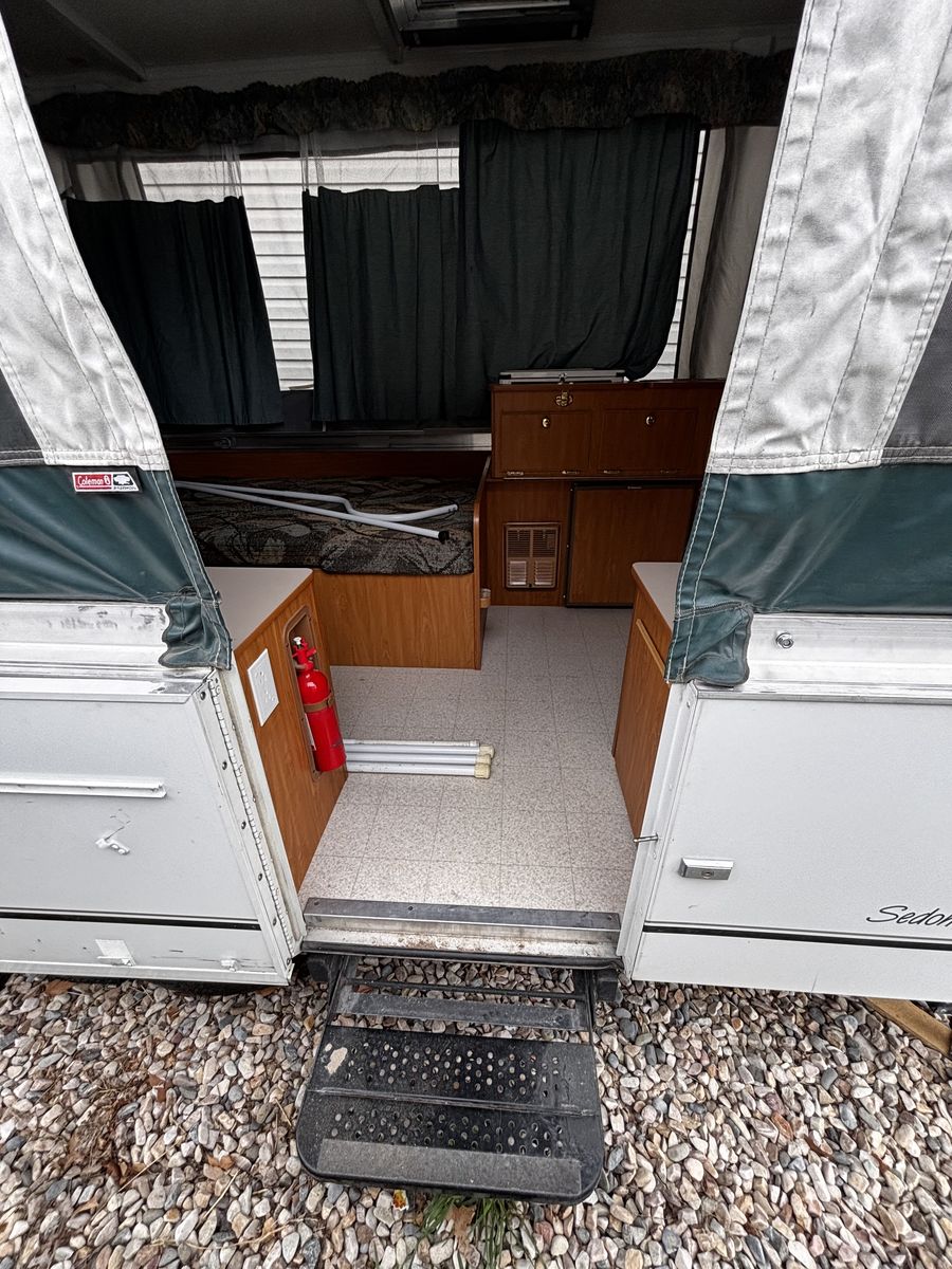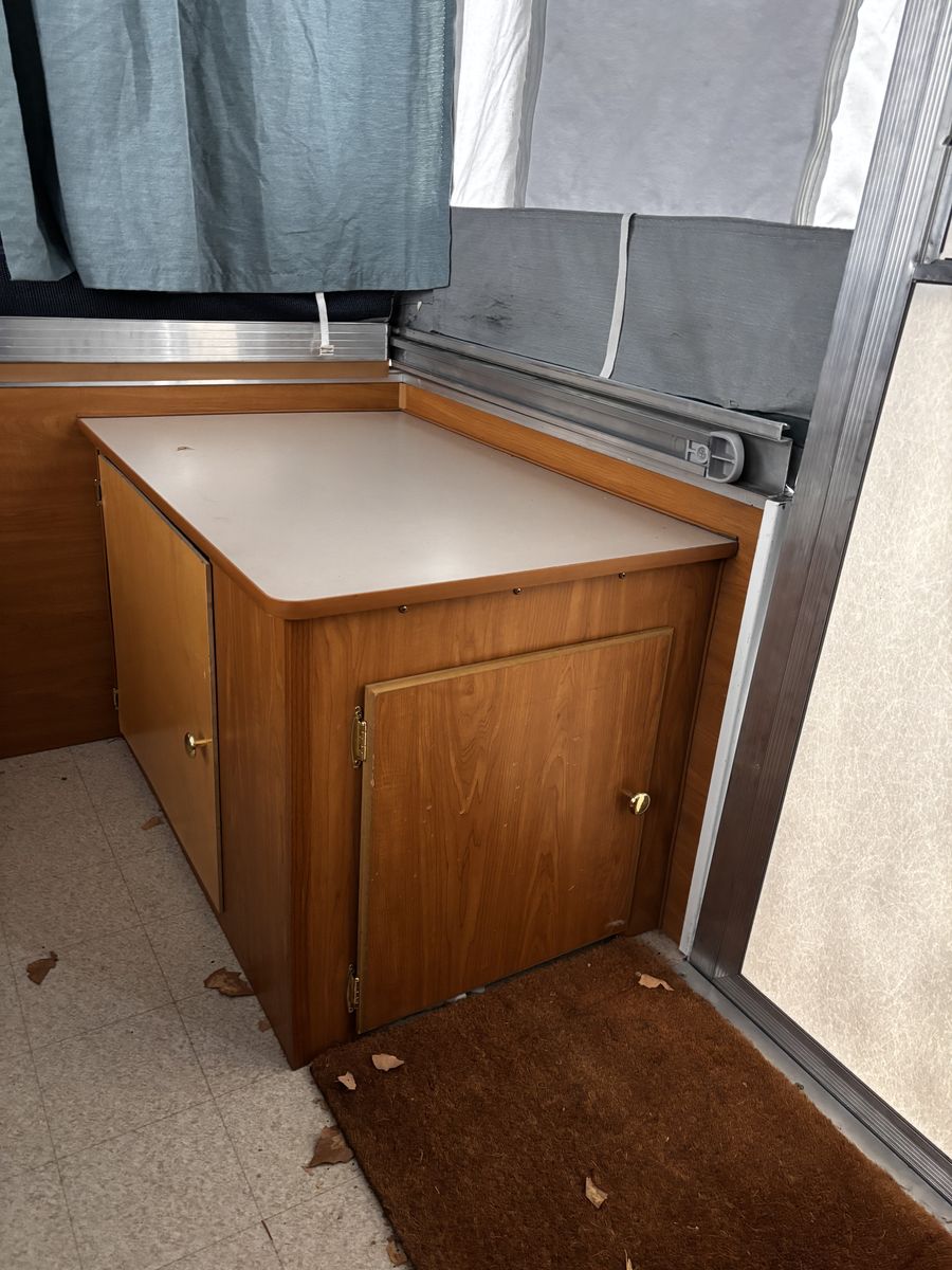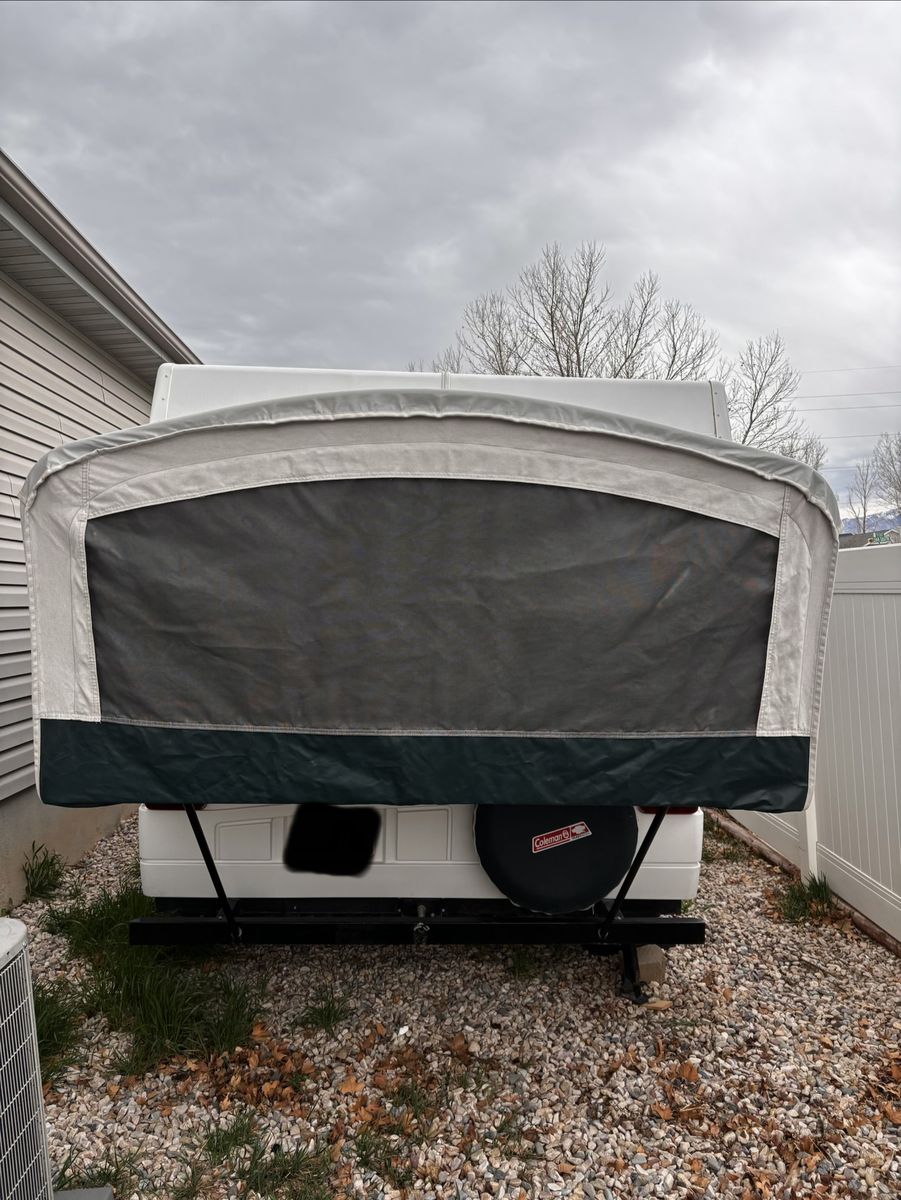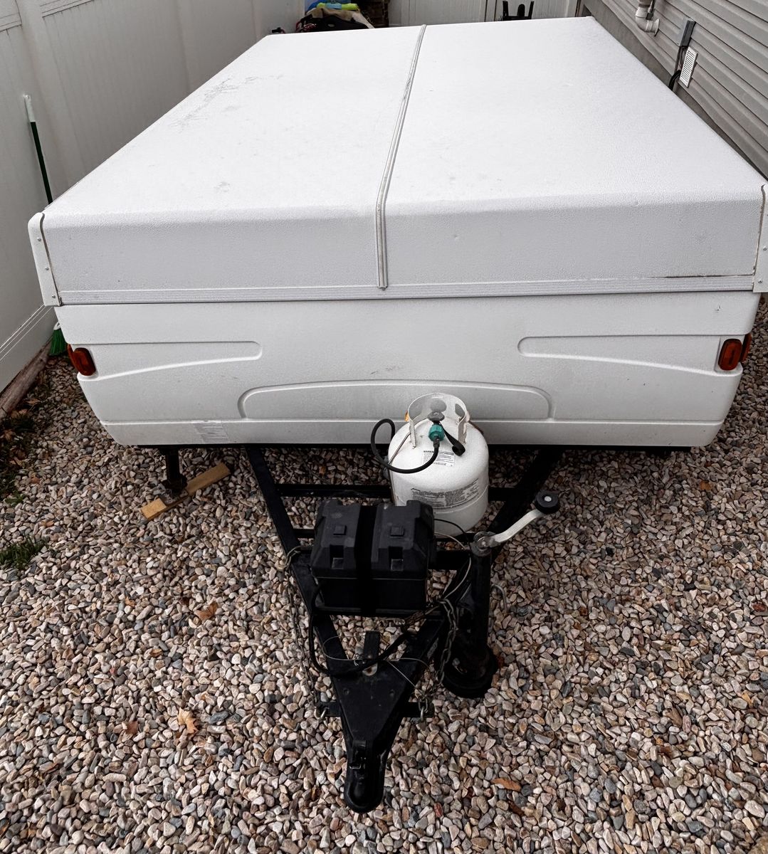 Features: -Propane furnace heater -Fridge -Two-burner stove (indoor or outdoor) -Sink and hand-pump faucet -King bed / Full bed / Convertible Full bed (lounge area) -Outdoor attached lighting -Awning + poles -1-year old batter -Full propane tank -Tires new within two years -Absolutely no rips, tears, or holes in the plastics, ceiling, floor, or canvas -All zippers and curtains work -Never smoked in; non-shedding dog only for one year -Lift / takedown crank system works flawlessly -Spare tire -7-pin trailer hookup -No signs of leaks in the ceiling. Roof top in great condition, no need for new seals