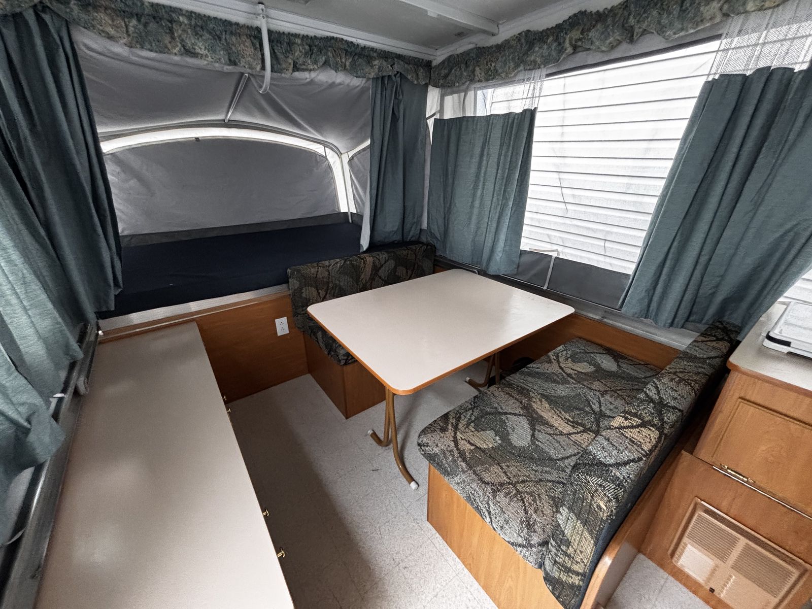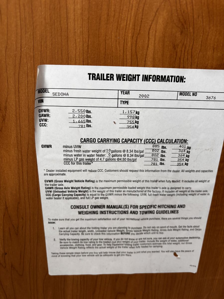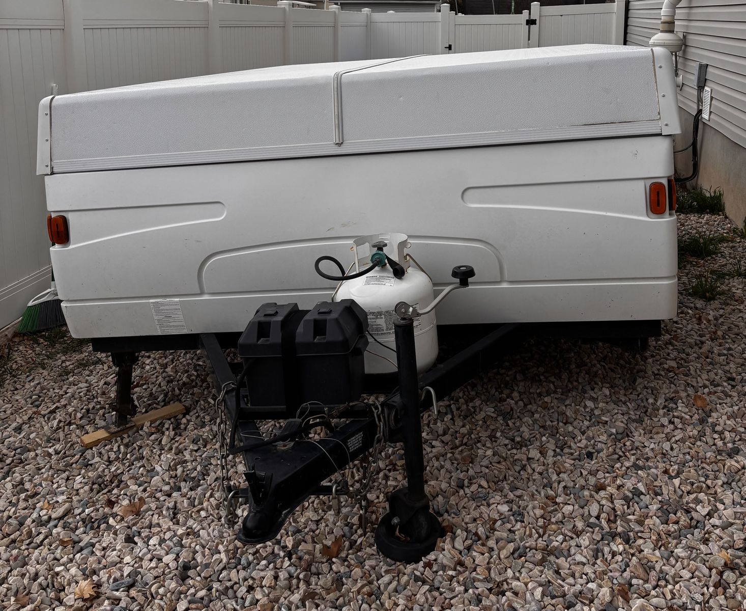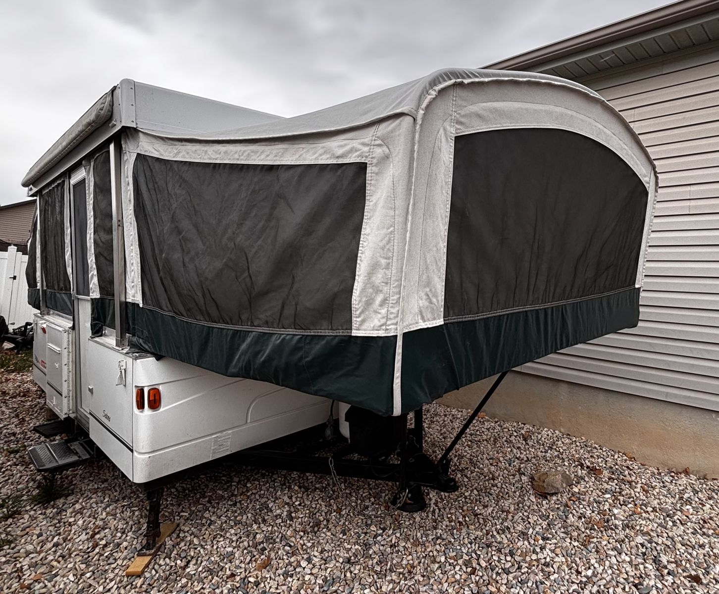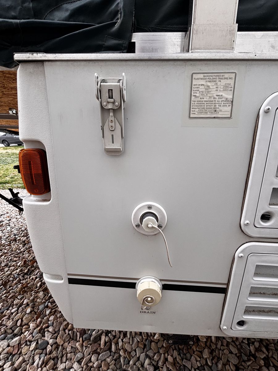 Features: -Propane furnace heater -Fridge -Two-burner stove (indoor or outdoor) -Sink and hand-pump faucet -King bed / Full bed / Convertible Full bed (lounge area) -Outdoor attached lighting -Awning + poles -1-year old batter -Full propane tank -Tires new within two years -Absolutely no rips, tears, or holes in the plastics, ceiling, floor, or canvas -All zippers and curtains work -Never smoked in; non-shedding dog only for one year -Lift / takedown crank system works flawlessly -Spare tire -7-pin trailer hookup -No signs of leaks in the ceiling. Roof top in great condition, no need for new seals