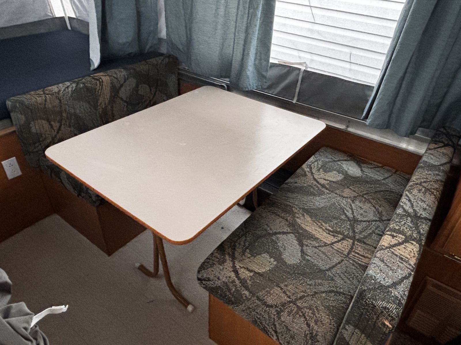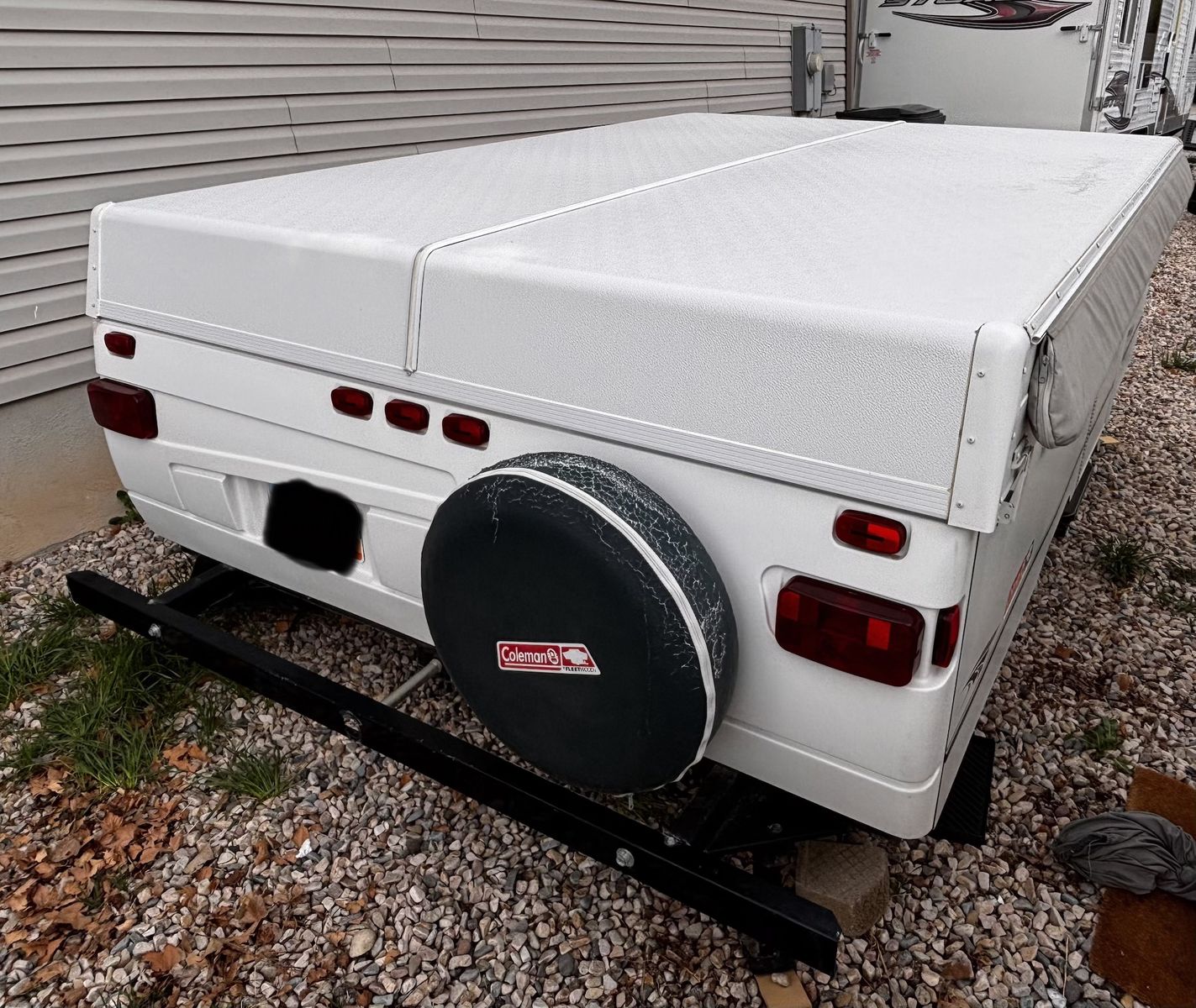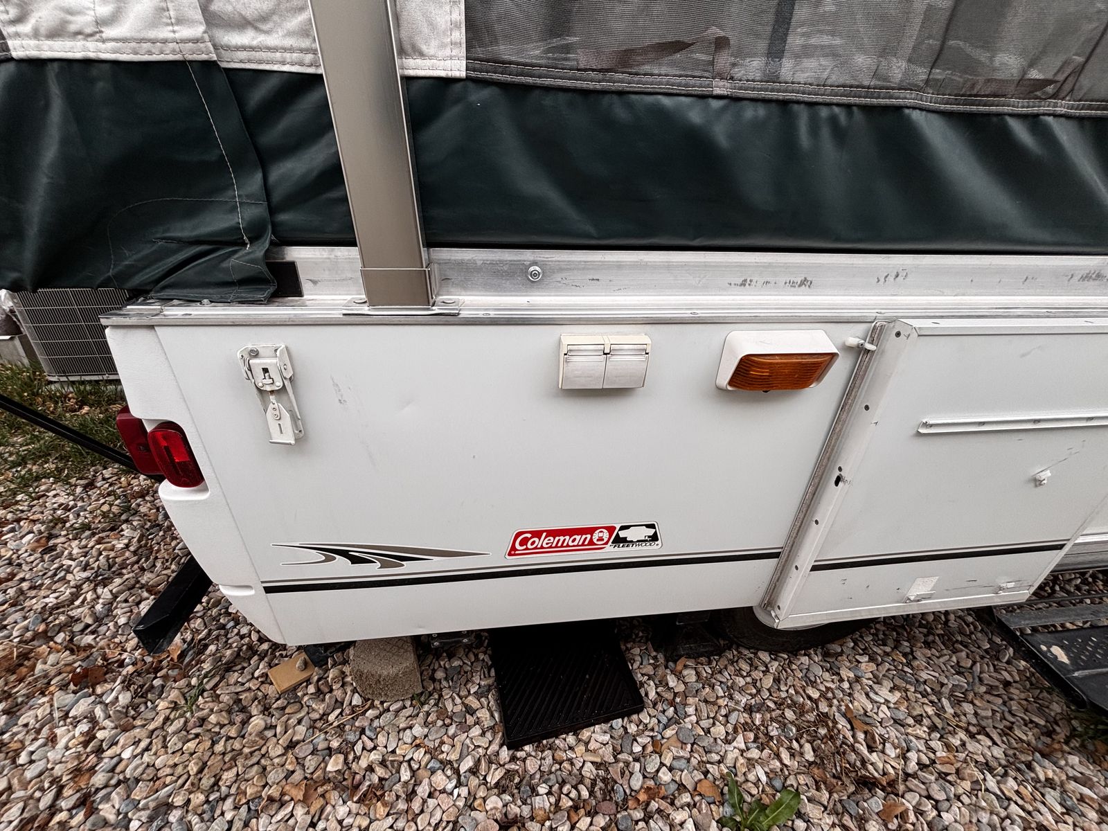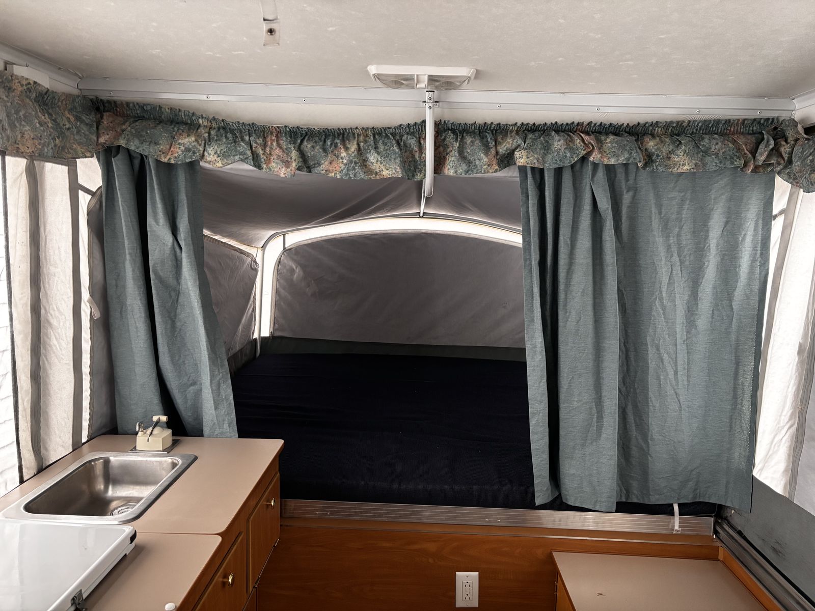 Features: -Propane furnace heater -Fridge -Two-burner stove (indoor or outdoor) -Sink and hand-pump faucet -King bed / Full bed / Convertible Full bed (lounge area) -Outdoor attached lighting -Awning + poles -1-year old batter -Full propane tank -Tires new within two years -Absolutely no rips, tears, or holes in the plastics, ceiling, floor, or canvas -All zippers and curtains work -Never smoked in; non-shedding dog only for one year -Lift / takedown crank system works flawlessly -Spare tire -7-pin trailer hookup -No signs of leaks in the ceiling. Roof top in great condition, no need for new seals