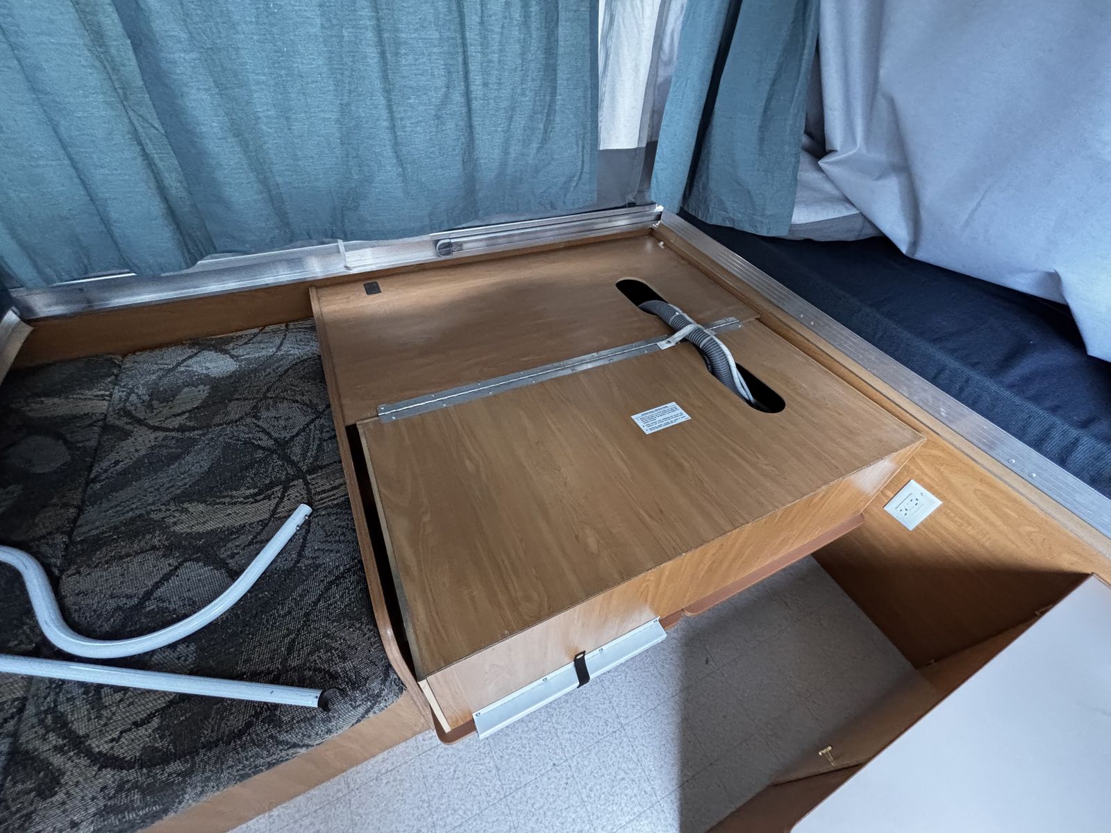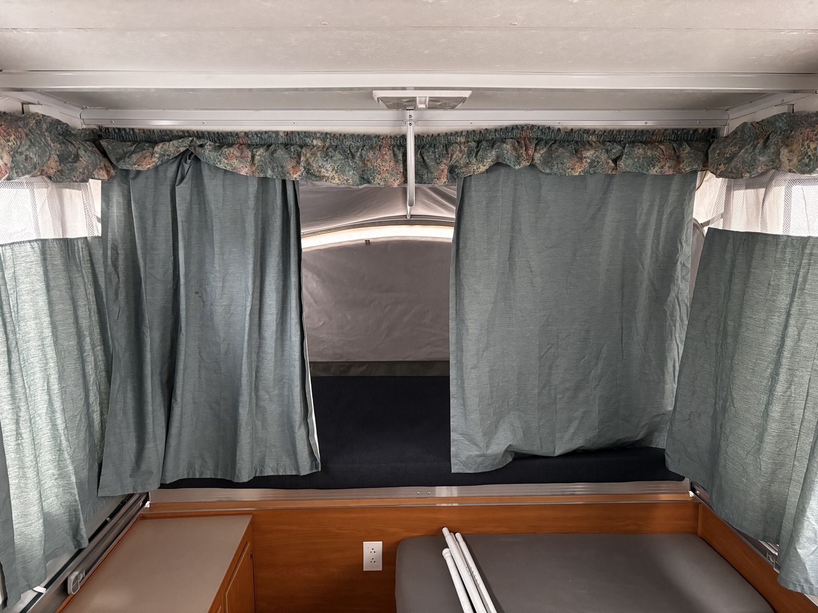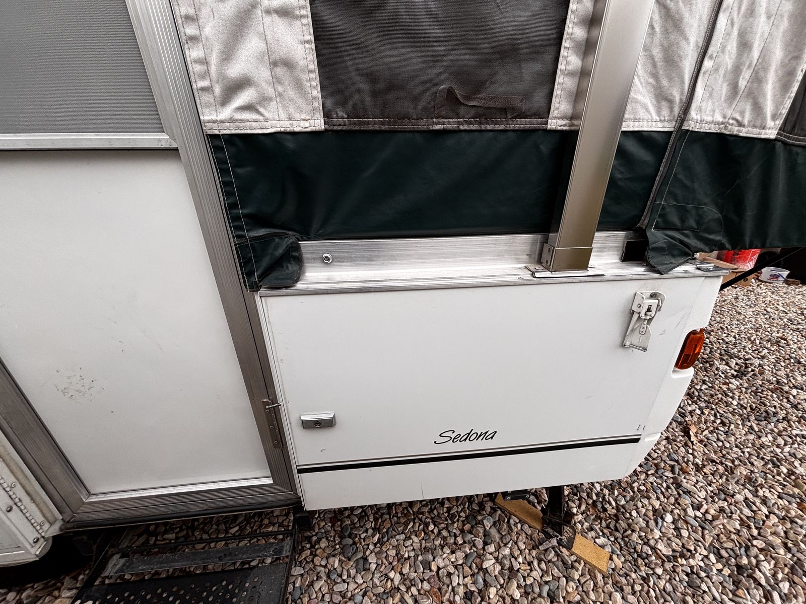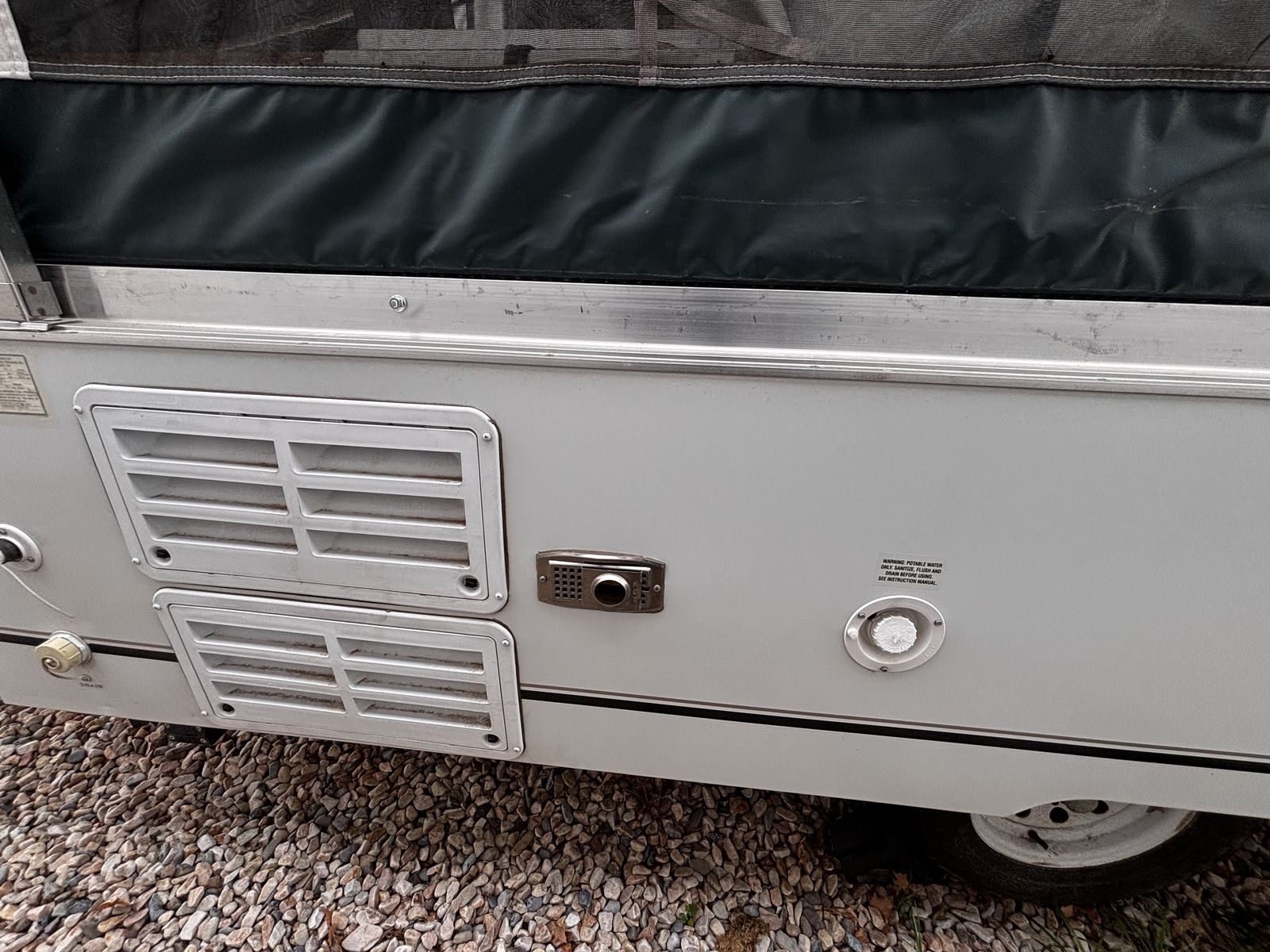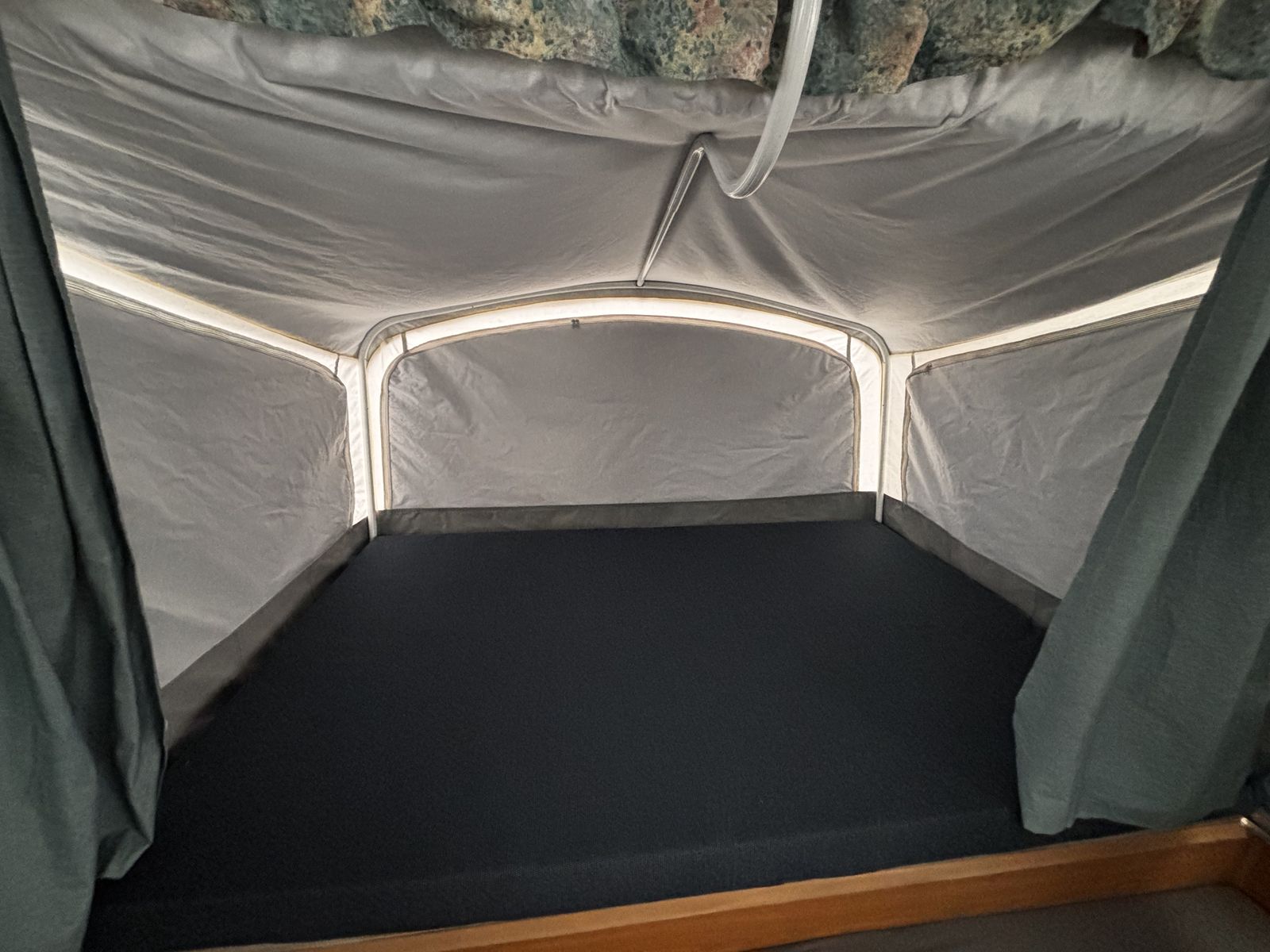 Features: -Propane furnace heater -Fridge -Two-burner stove (indoor or outdoor) -Sink and hand-pump faucet -King bed / Full bed / Convertible Full bed (lounge area) -Outdoor attached lighting -Awning + poles -1-year old batter -Full propane tank -Tires new within two years -Absolutely no rips, tears, or holes in the plastics, ceiling, floor, or canvas -All zippers and curtains work -Never smoked in; non-shedding dog only for one year -Lift / takedown crank system works flawlessly -Spare tire -7-pin trailer hookup -No signs of leaks in the ceiling. Roof top in great condition, no need for new seals