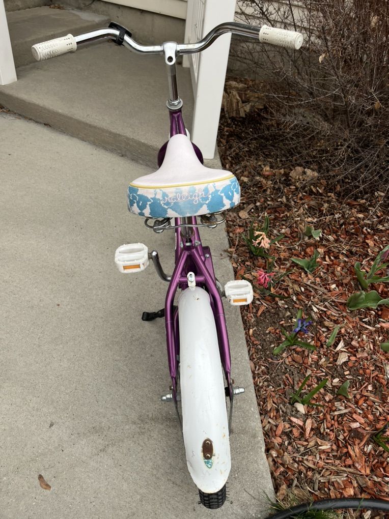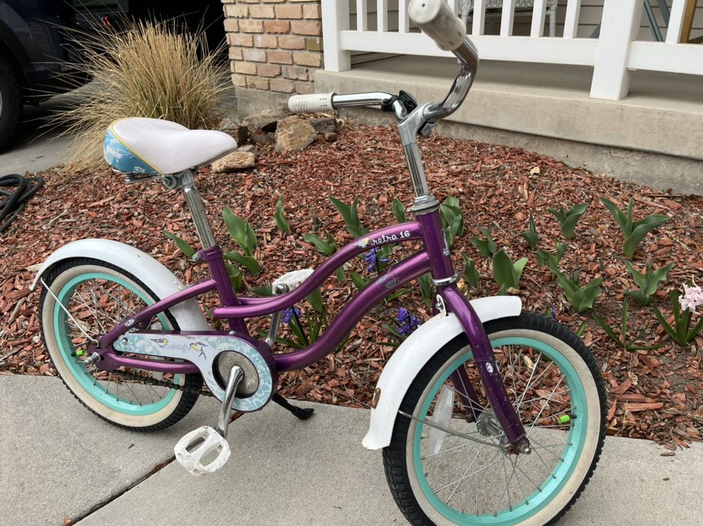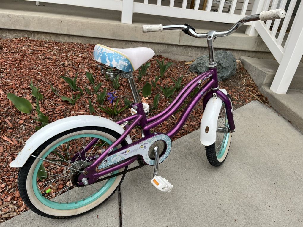 16” wheels, retro style cruiser Kickstand Purple and teal with white fenders and comfy seat.