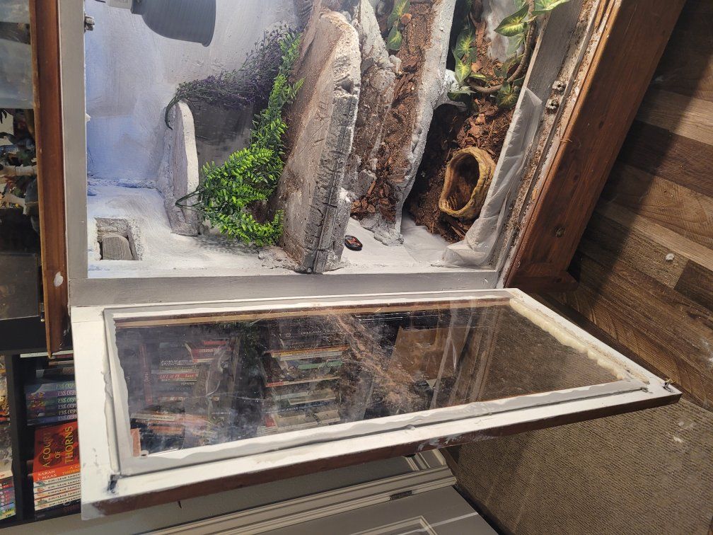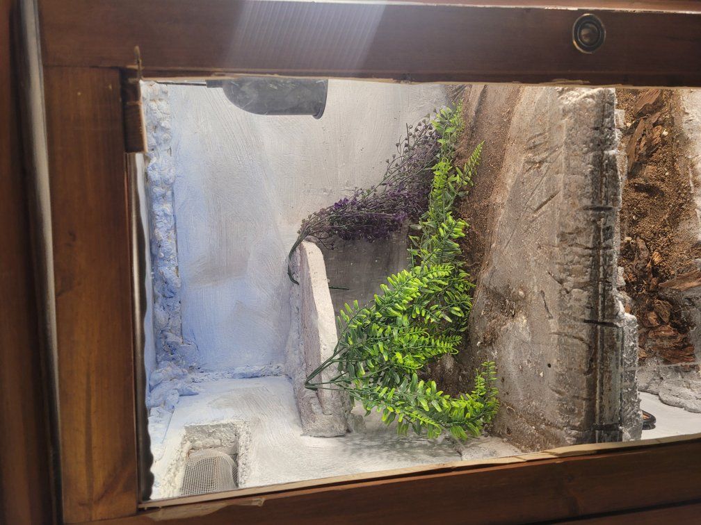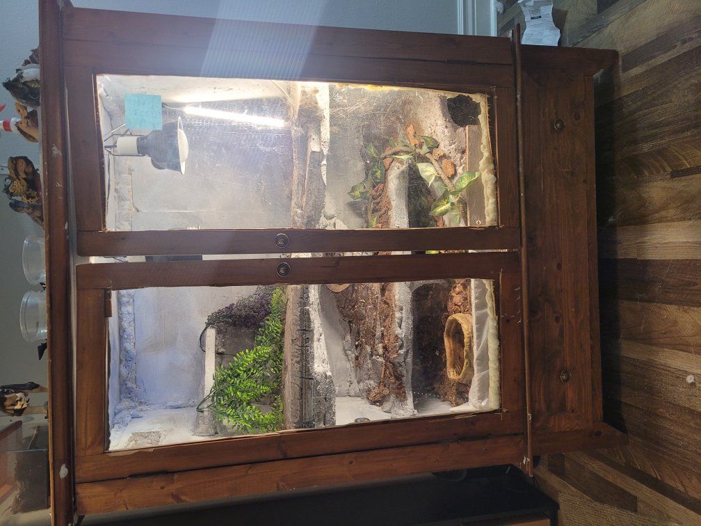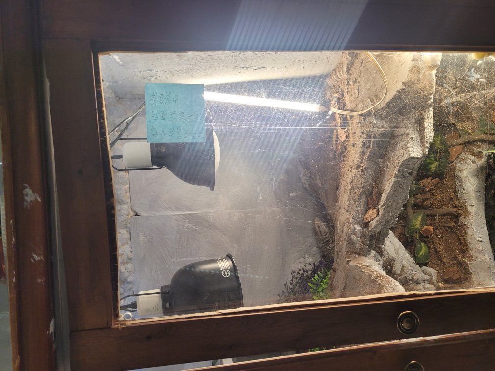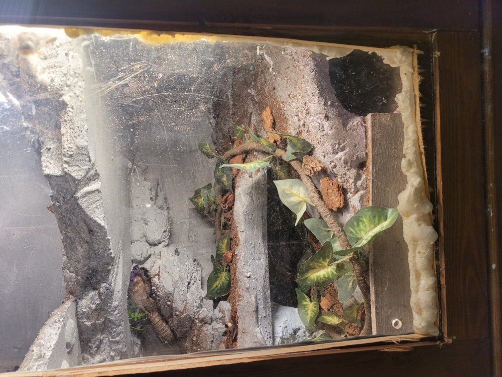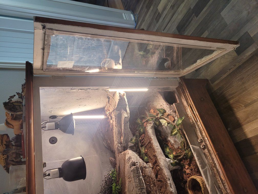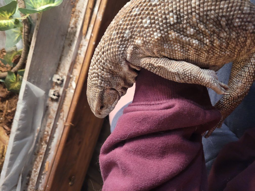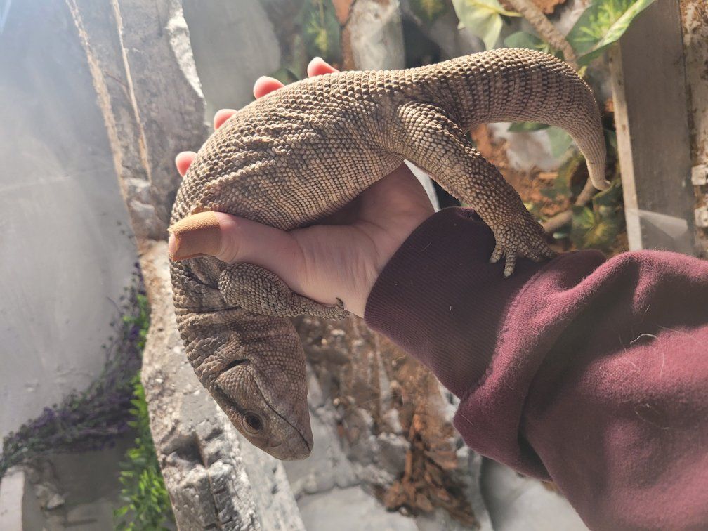 Zellemale savannah, I don't remember how old he is. puffs and whips a bit when you get him out but he hasn't bitten, just a bit defensive. once he's out he tries to get away but after a few minutes he settles down. I'm able to tong feed him and he'll crawl out onto my arm for a roach. he's missing the tip of his tail and a few claws but otherwise is in great shape. $100 for just the lizard.