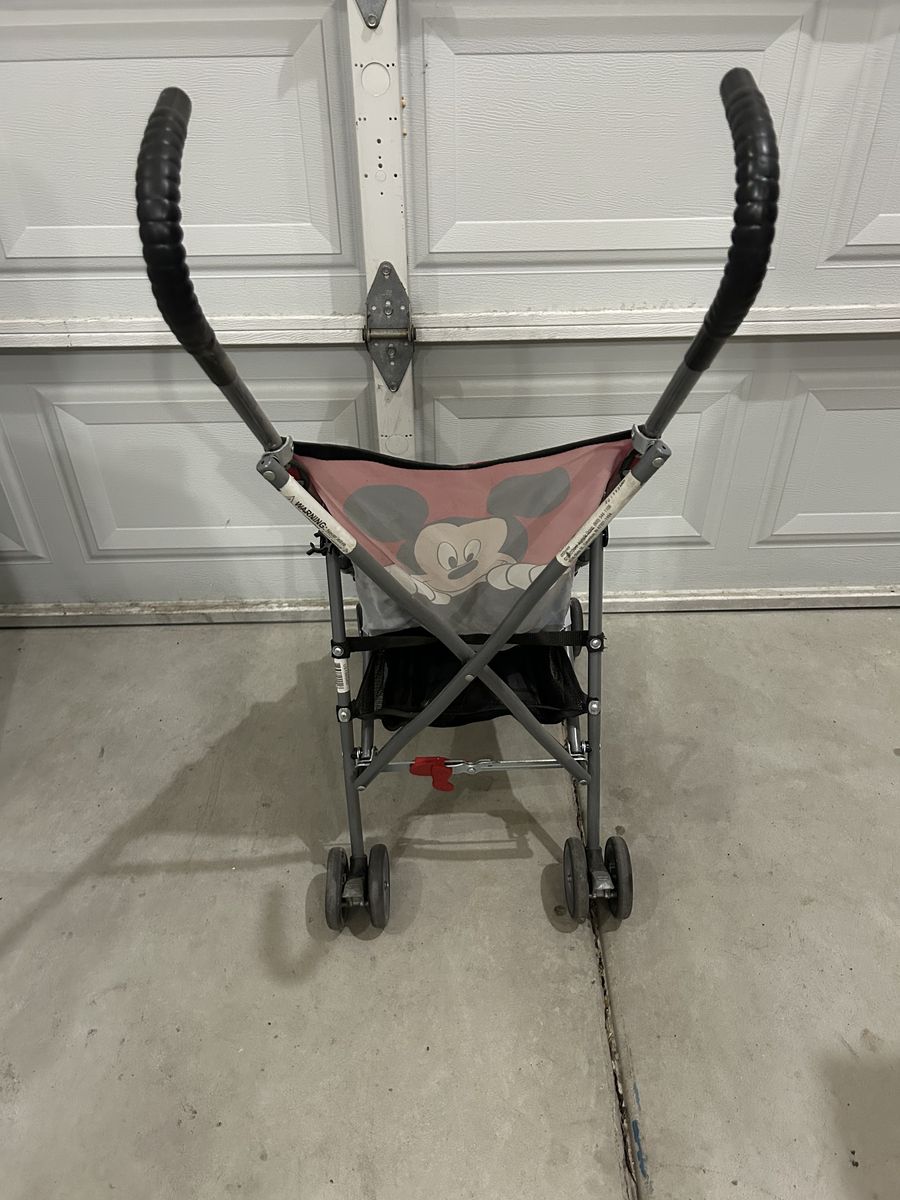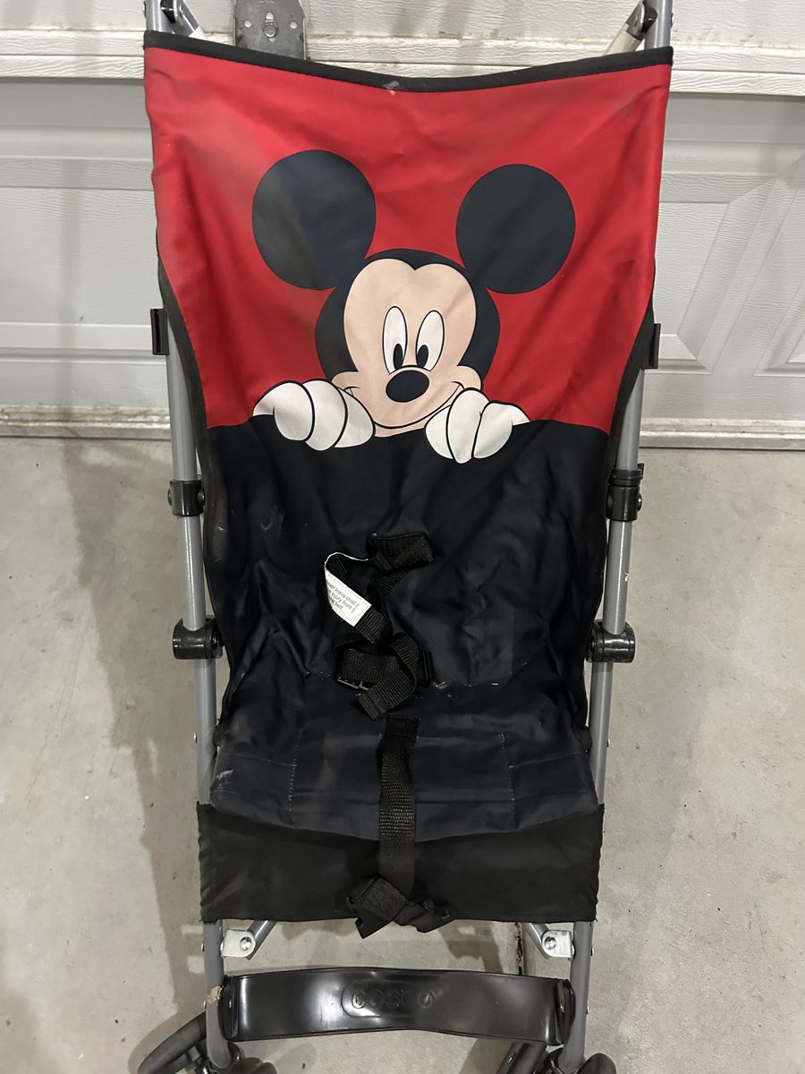 Selling this mickey mouse stroller in good condition. Only issues is the foot rest is a little bent but still works. Folds up for easy storage, and a little dusty from sitting in the garage.