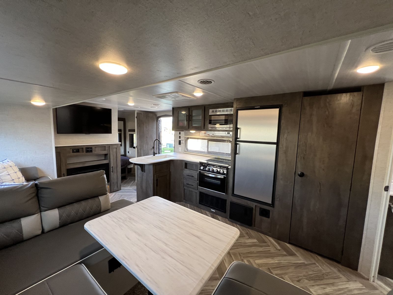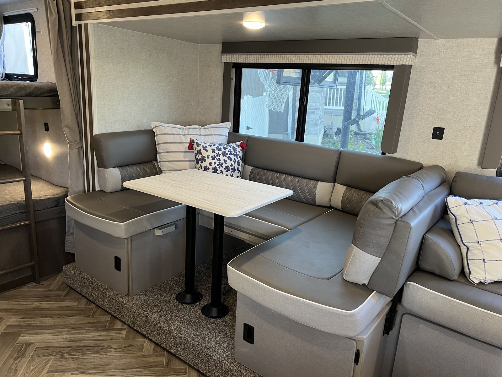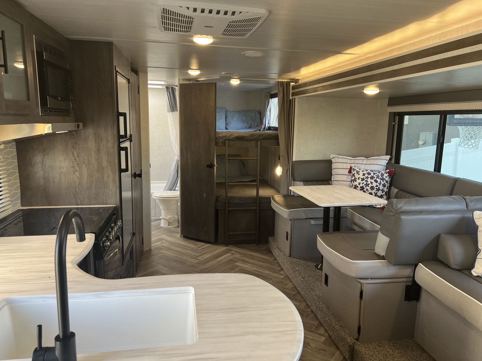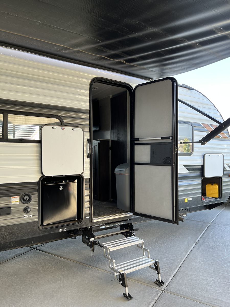 Sleep up to 10 in this thoughtful layout with versa lounge seating. Private queen bedroom in addition to double bunks, fireplace, large pantry, and plenty of storage. Outdoor griddle and mini fridge. Power patio awning, power stabilizer jacks, power tongue jack, and large power slide-out. Wired for solar, Original owner, no pets, well maintained in clean, excellent condition!