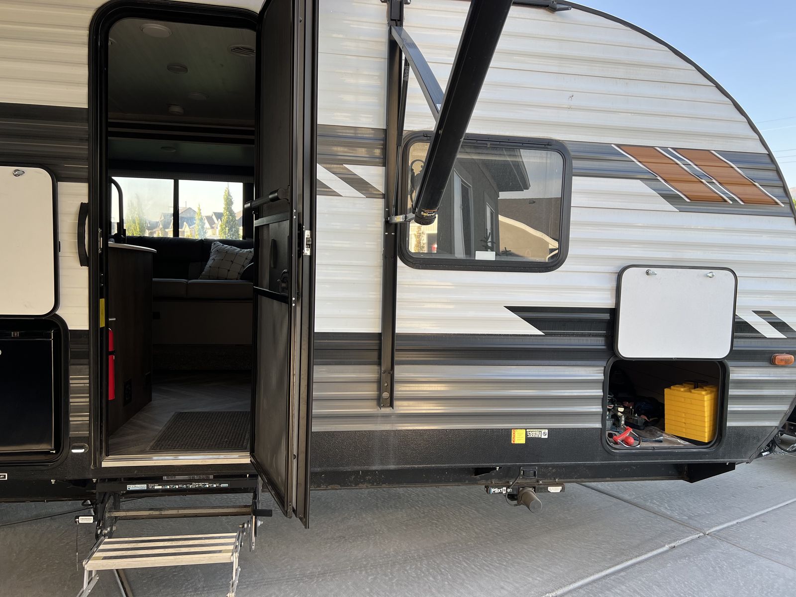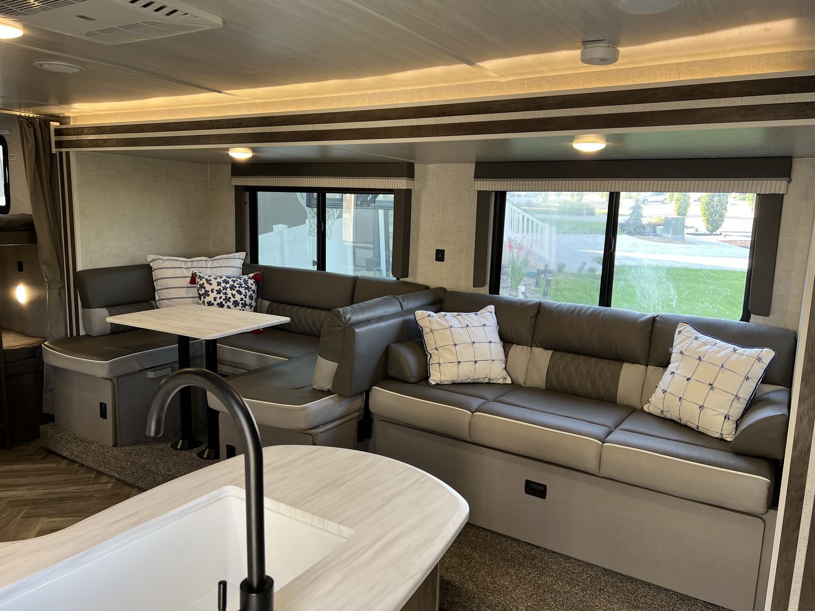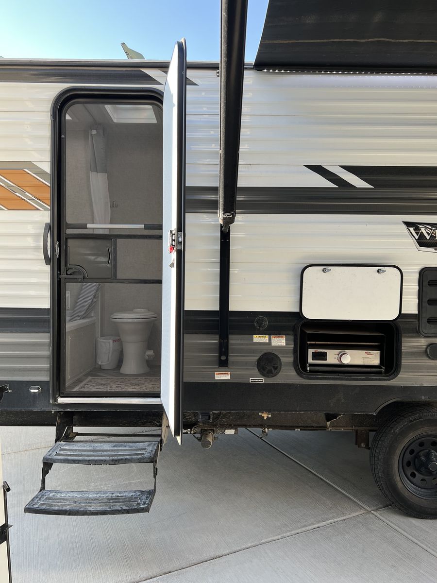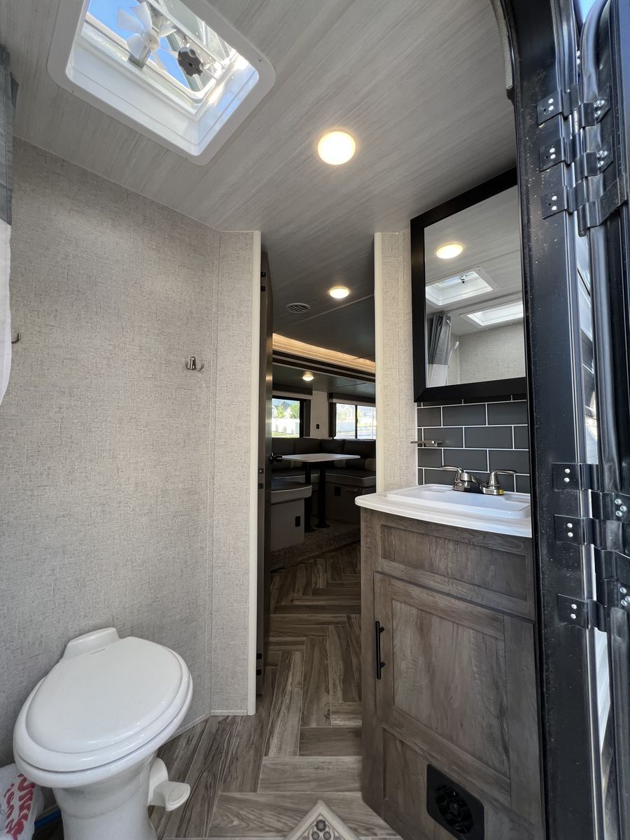 Sleep up to 10 in this thoughtful layout with versa lounge seating. Private queen bedroom in addition to double bunks, fireplace, large pantry, and plenty of storage. Outdoor griddle and mini fridge. Power patio awning, power stabilizer jacks, power tongue jack, and large power slide-out. Wired for solar, Original owner, no pets, well maintained in clean, excellent condition!