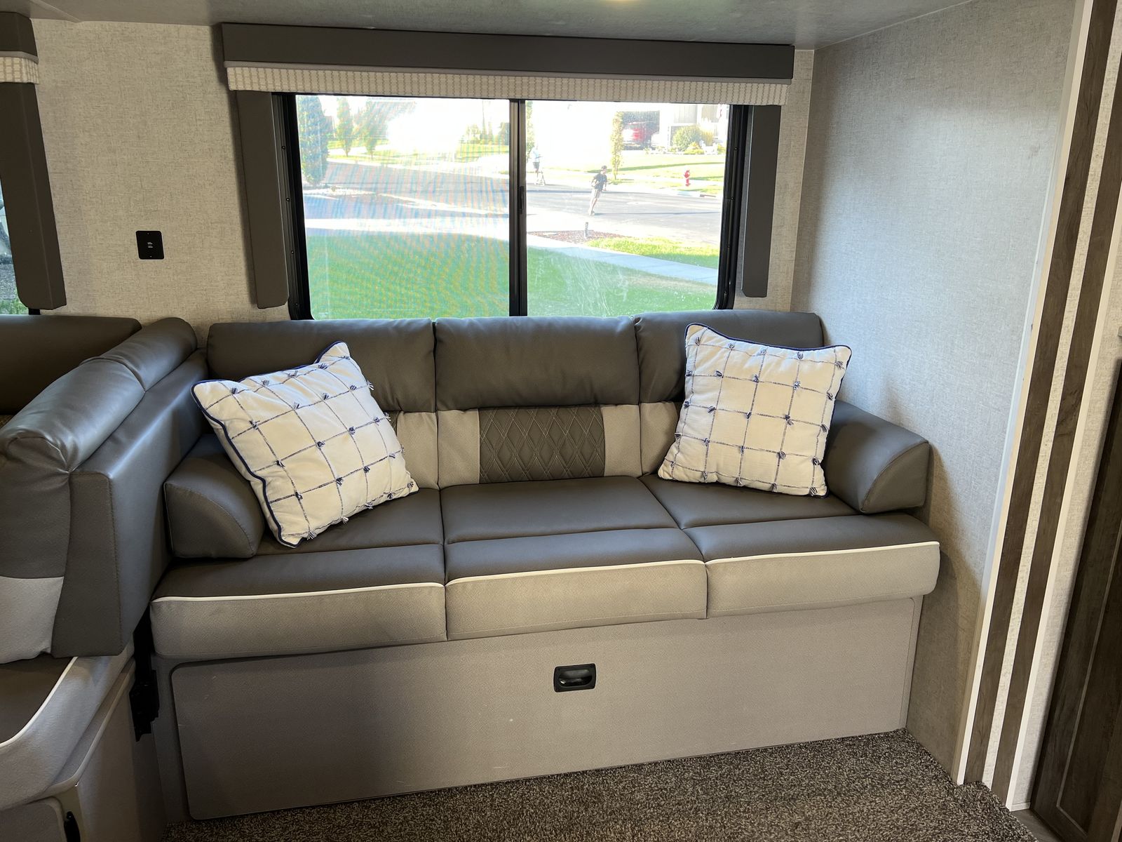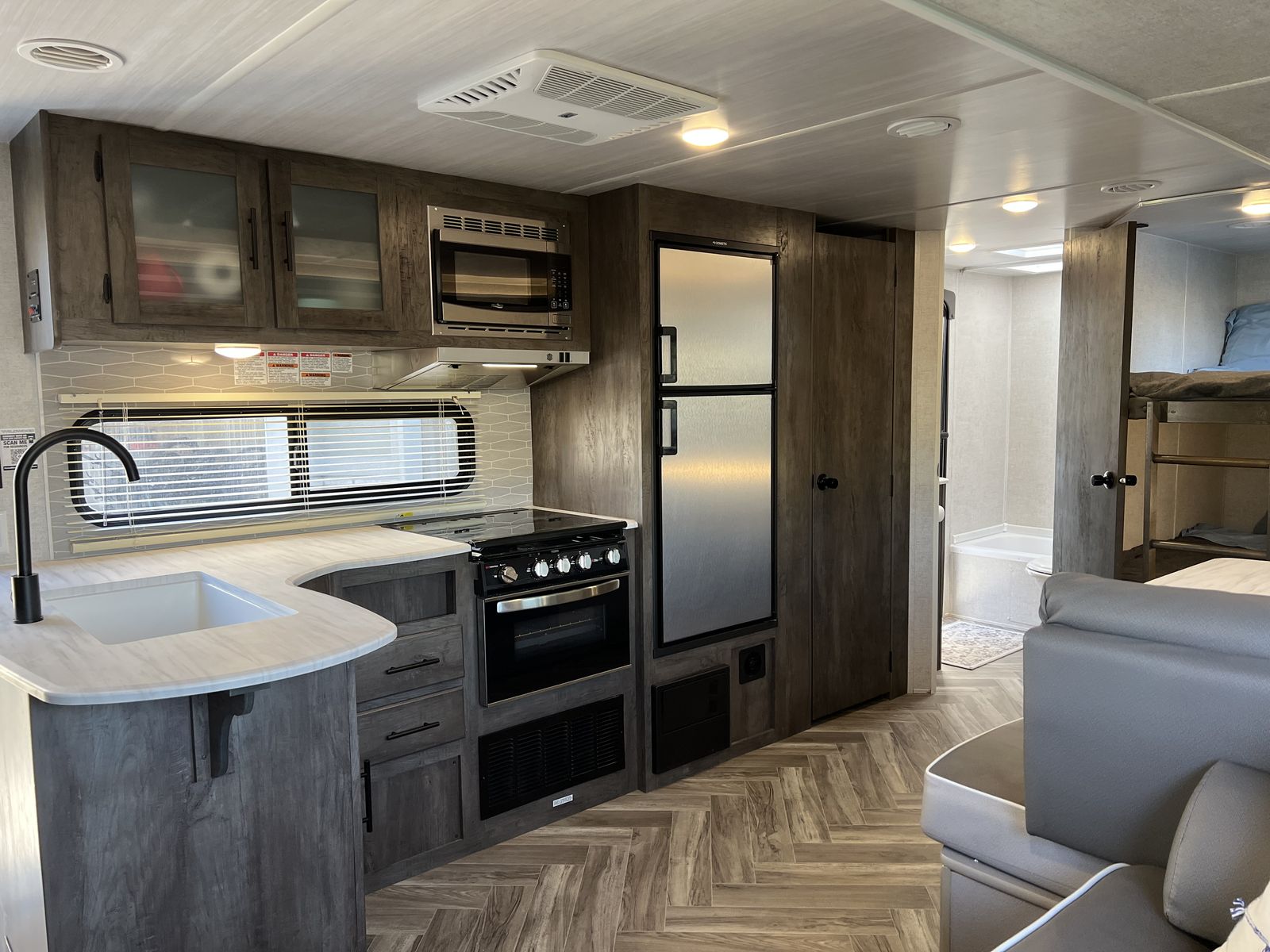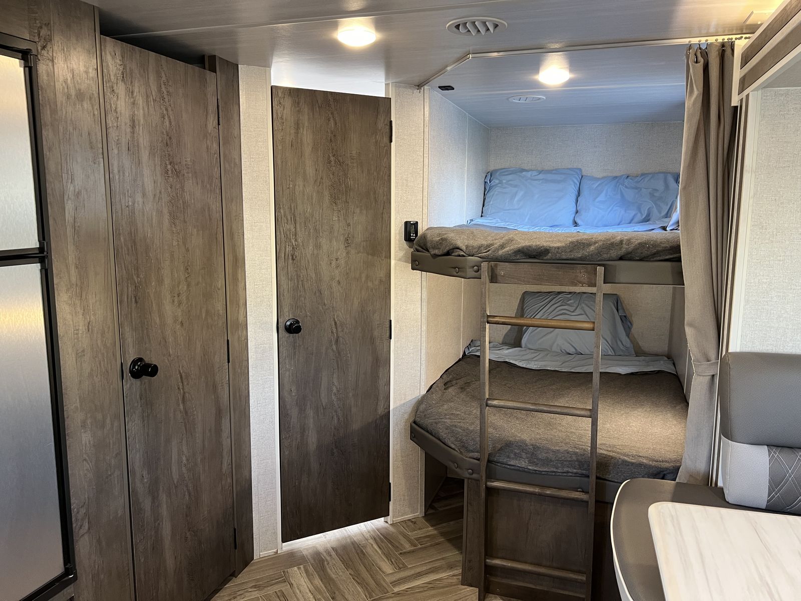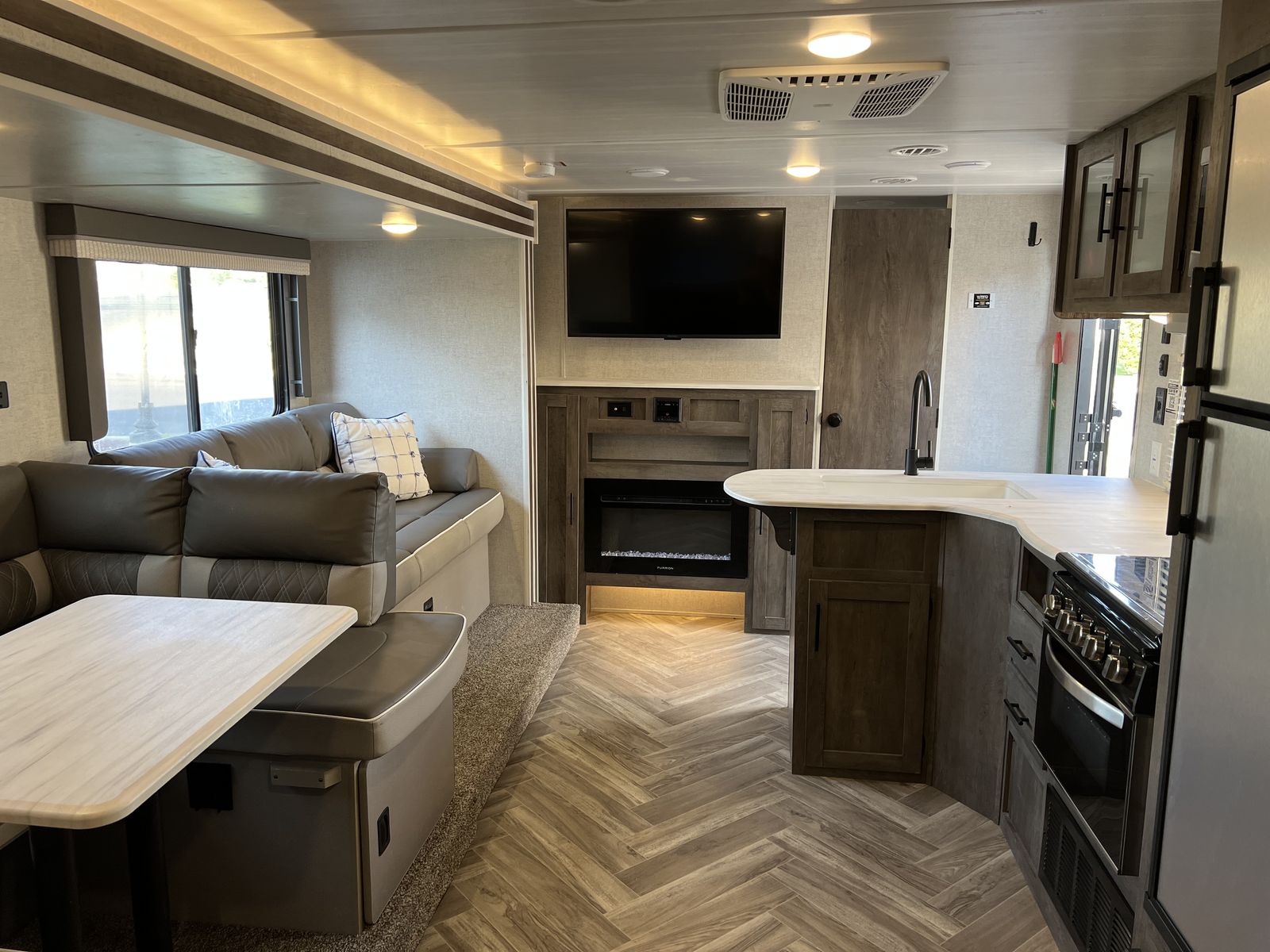 Sleep up to 10 in this thoughtful layout with versa lounge seating. Private queen bedroom in addition to double bunks, fireplace, large pantry, and plenty of storage. Outdoor griddle and mini fridge. Power patio awning, power stabilizer jacks, power tongue jack, and large power slide-out. Wired for solar, Original owner, no pets, well maintained in clean, excellent condition!