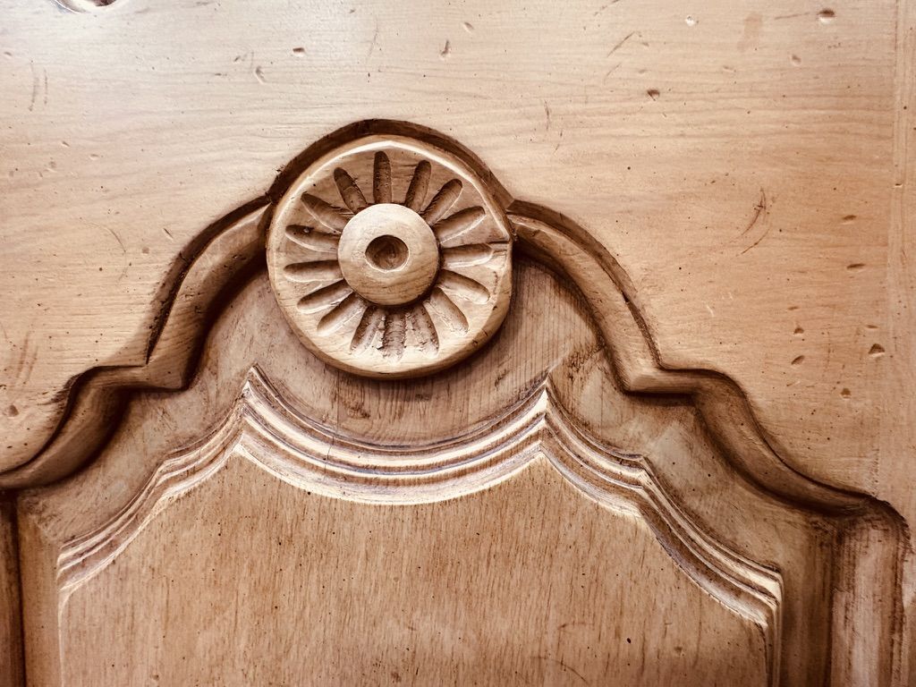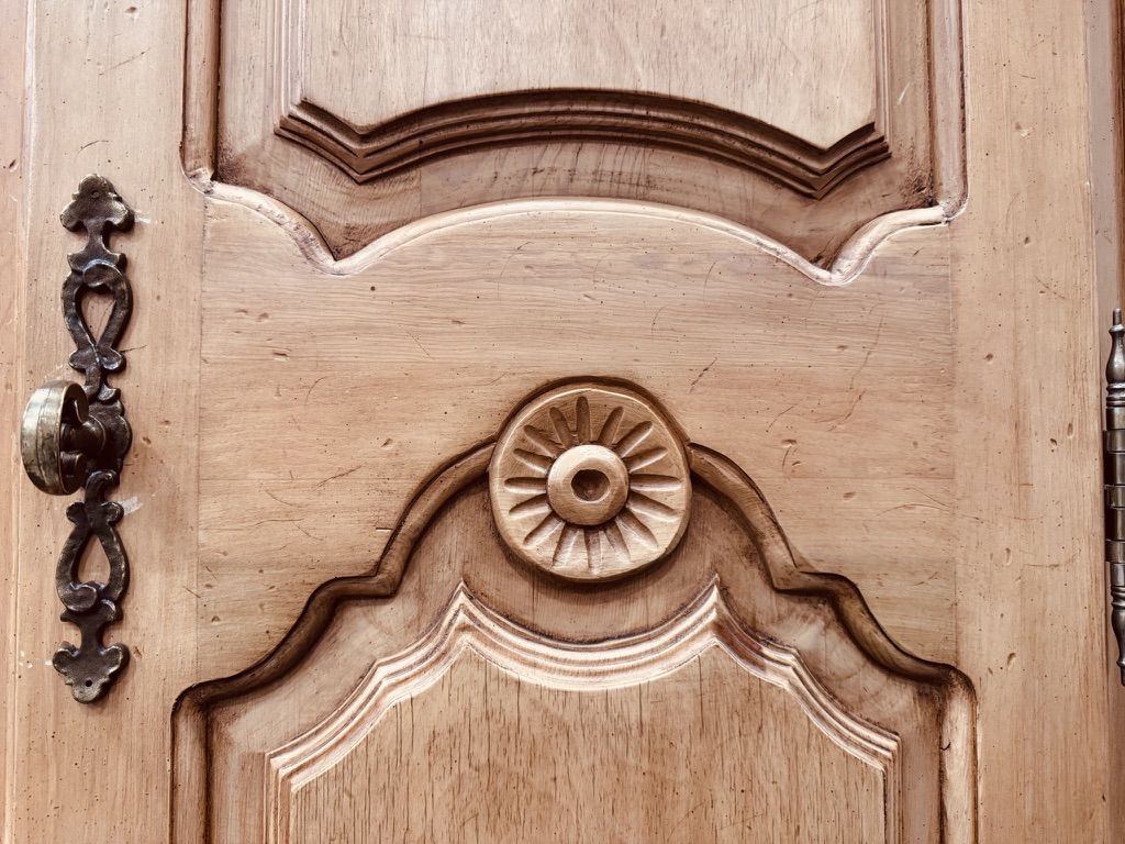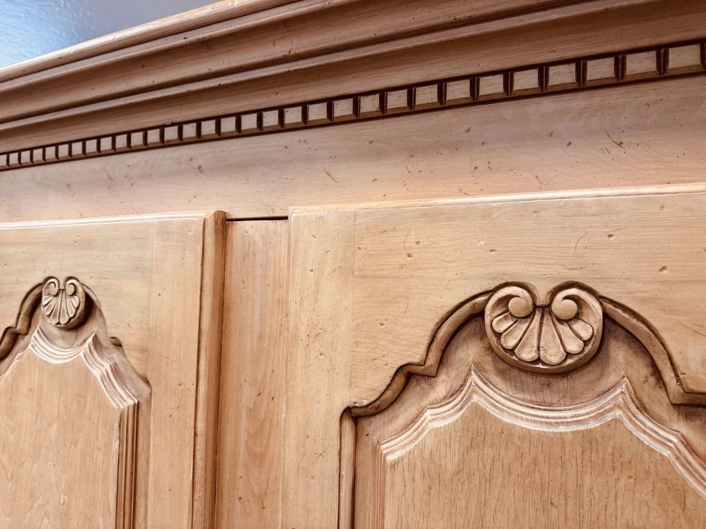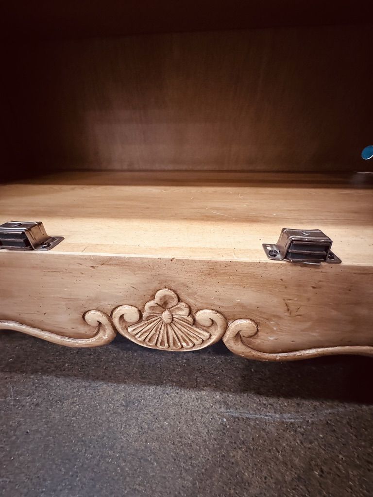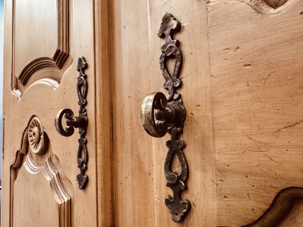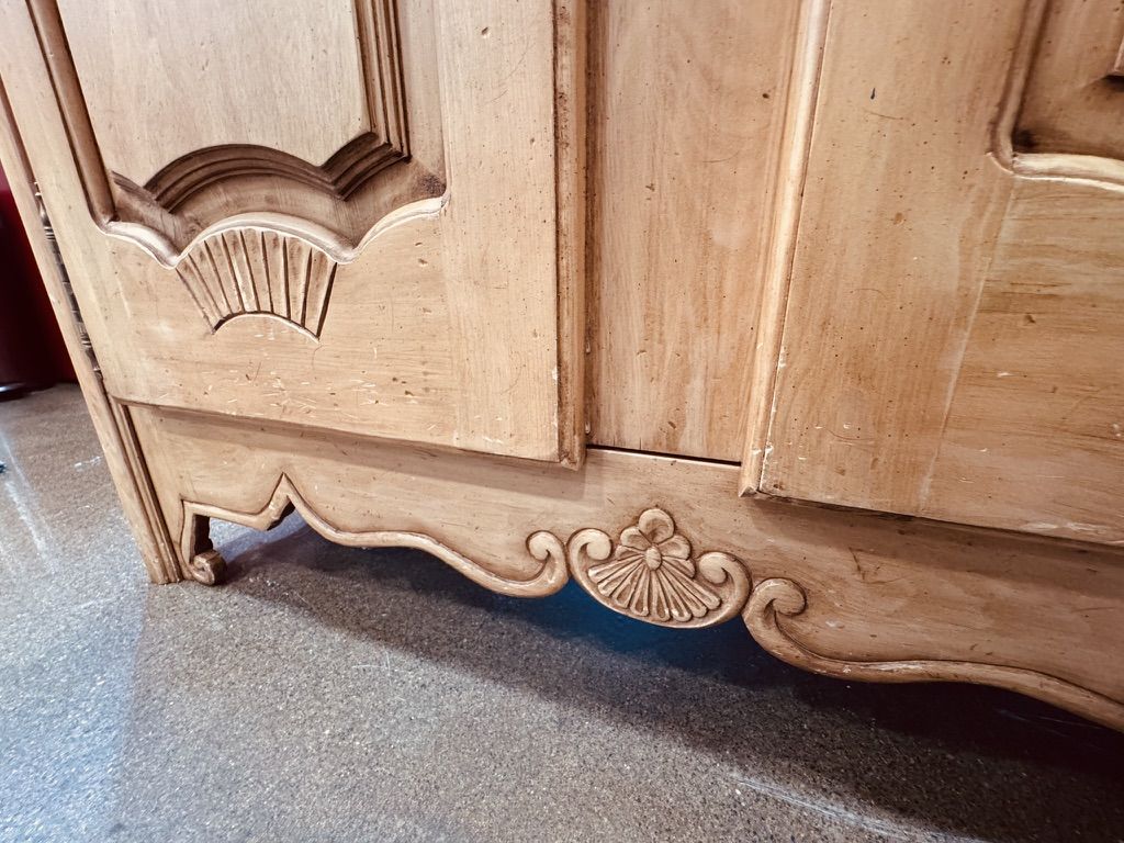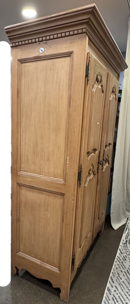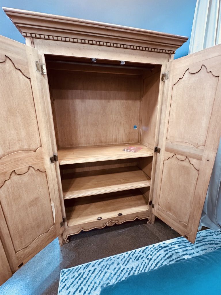 Sometime in the mid-to-late 1900s: A wardrobe is built. Real hardwood. Intricate carved details on every surface. Crown molding with a dentil pattern across the top. Ornate dark metal hinges and handles. Carved legs. Someone, somewhere, took their time making this thing and they were proud of it. This was not IKEA. This was a statement. This was furniture with opinions.