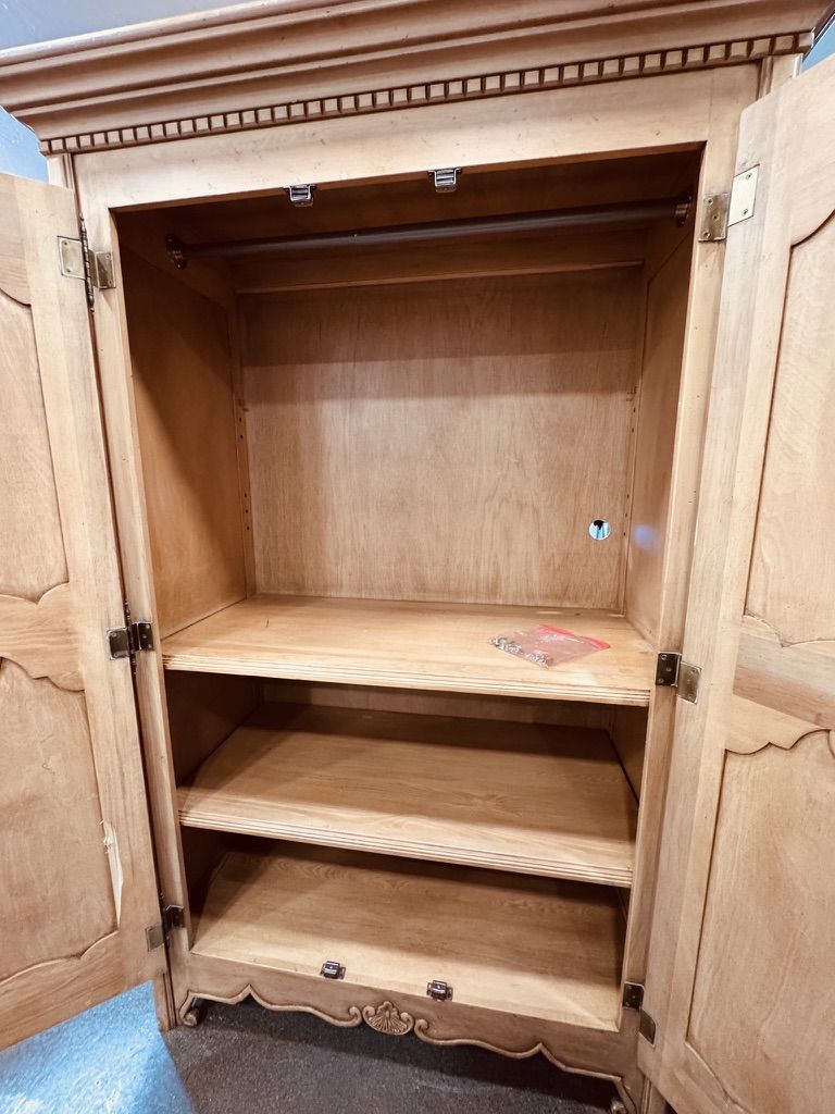 This morning: I measure it. 77 inches tall. 50 inches wide. 22 inches deep. It has a clothing bar that was added along the way, plus four adjustable shelves inside, making it somehow even more useful than it was when it started. The carved details are still crisp. The hardware is still ornate. The legs are still proud. This piece of furniture is in better shape than I am and it's at least as old as I am.