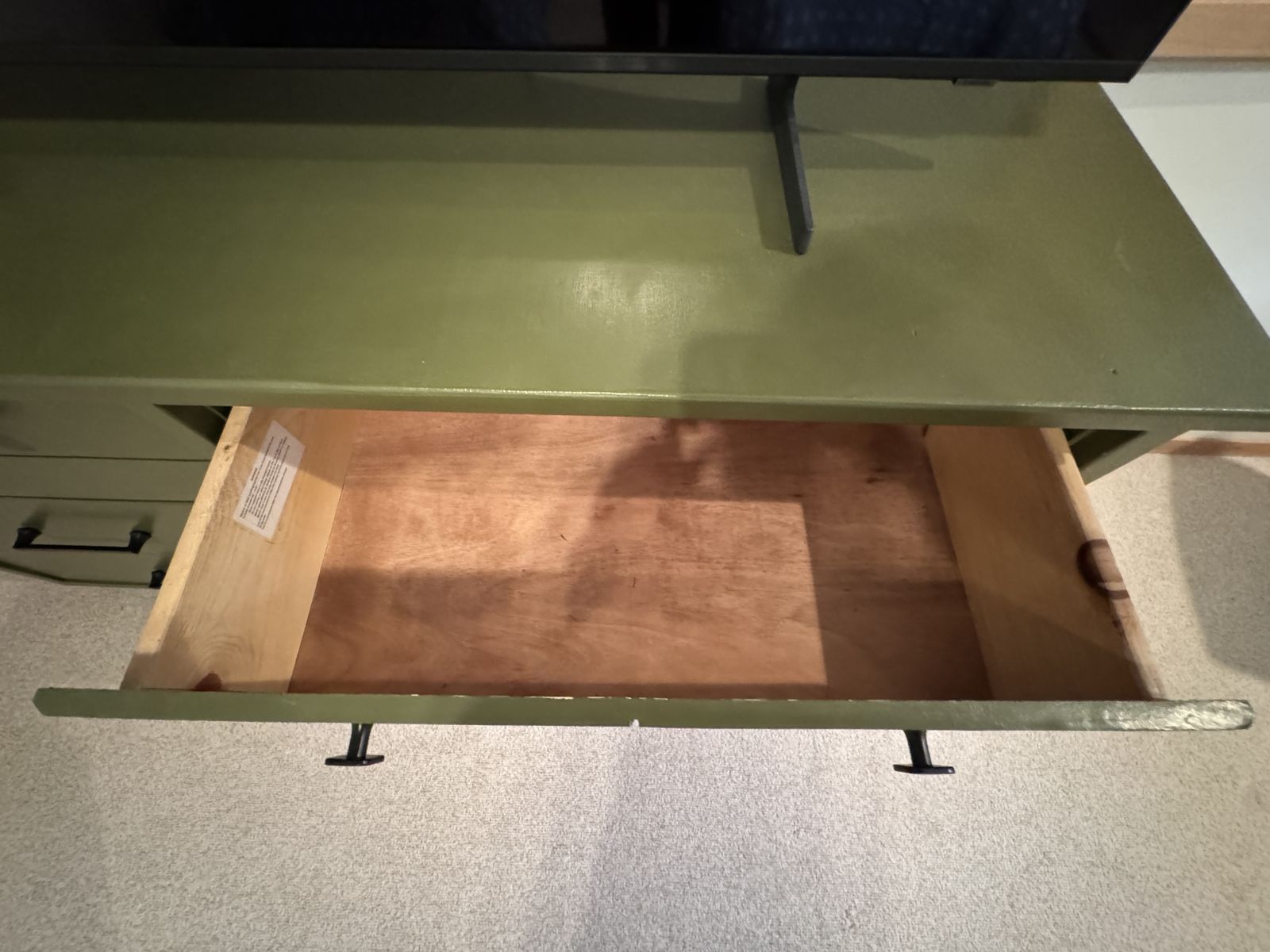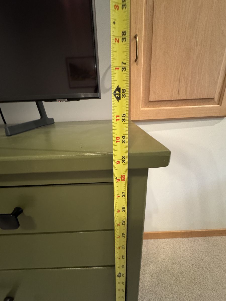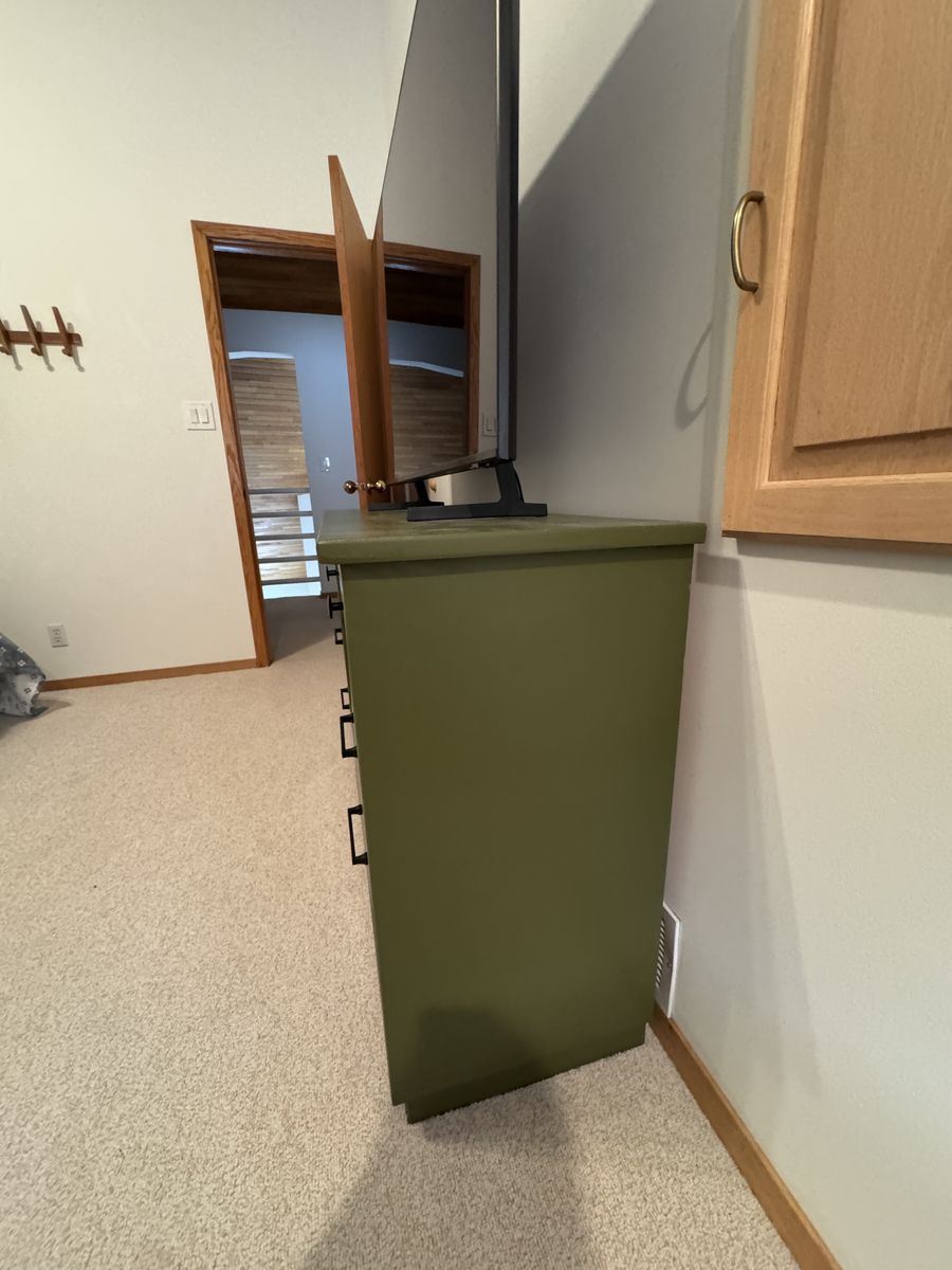 ZelleOlive Green Dresser for bedroom with black hardware and 6 spacious drawers. Good condition. Rarely used as kept in a guest bedroom.