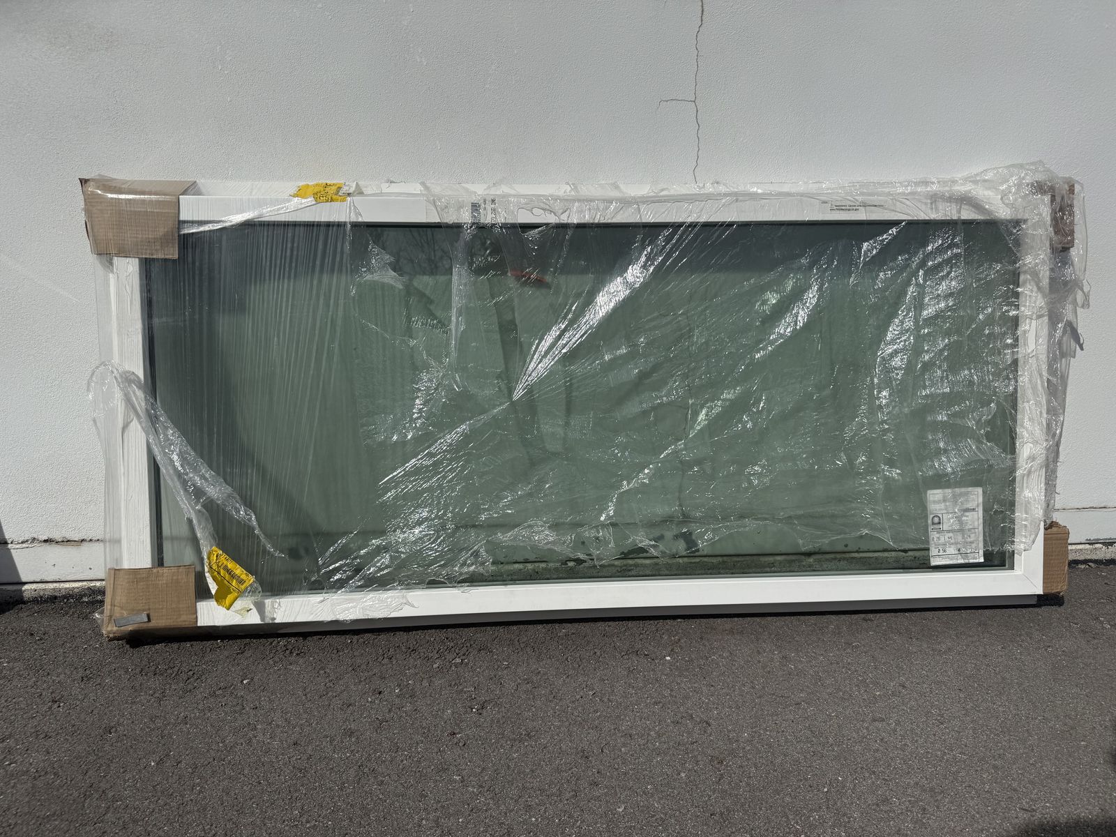 This window is brand new white vinyl picture window. This window does not operate. This window comes with an extruded flush fin as part of the frame and is great for retro Installation. Exact size is 68 1/8” x 30 7/8” Frame depth is 3 1/4”. This window is energy efficient double pane with low E with argon gas.