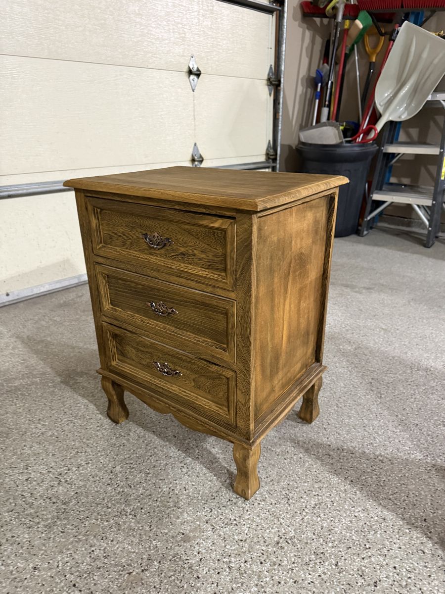 VenmoSolid wood 3-drawer nightstand in excellent condition. This piece has a classic design with decorative drawer pulls and a warm wood finish that works well with many bedroom styles.