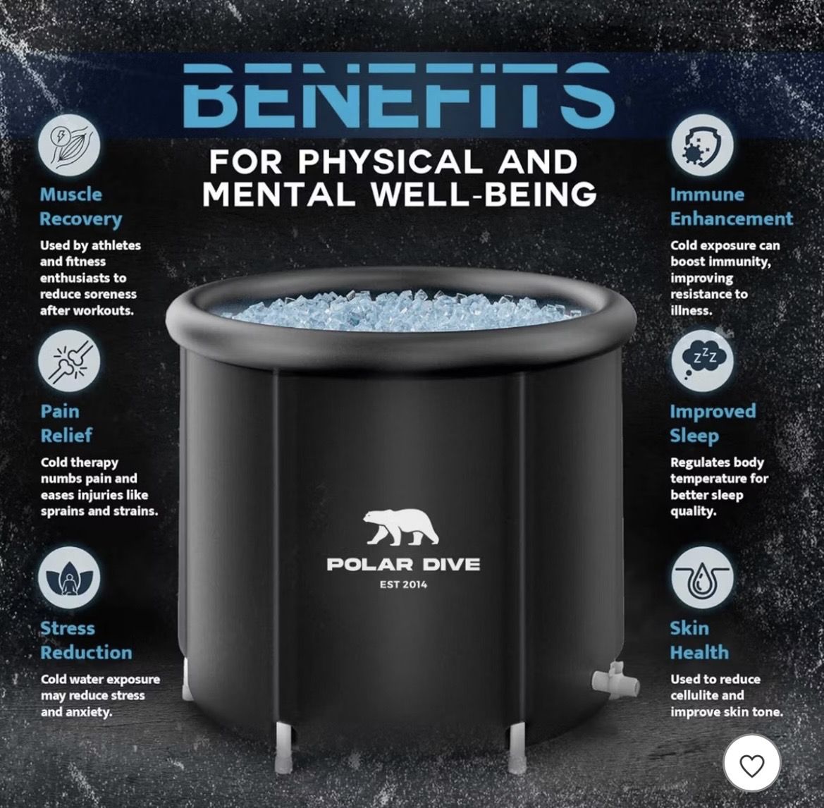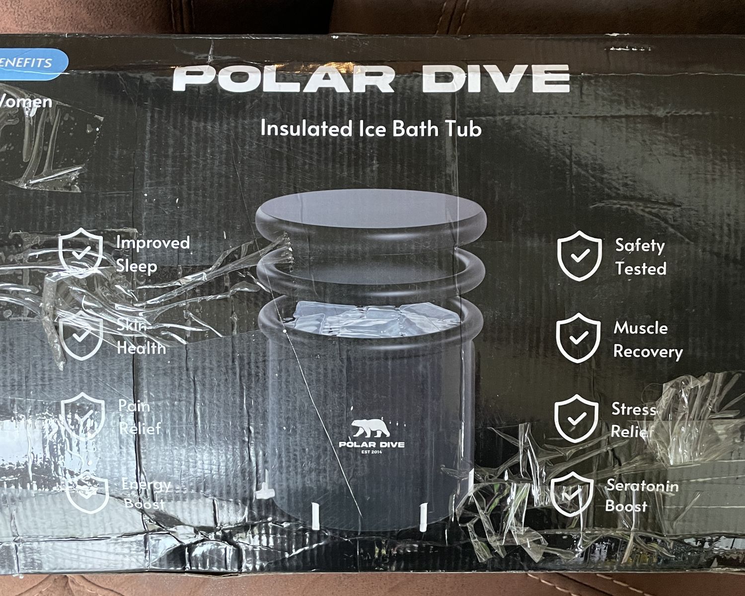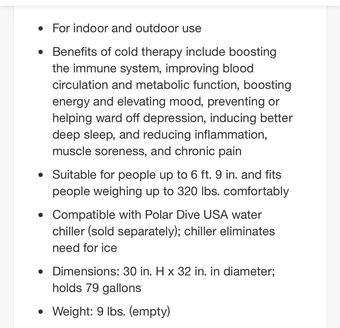 New Polar Dive insulated ice bathtub. For indoor and outdoor use Benefits of cold therapy include boosting the immune system, improving blood circulation and metabolic function, boosting energy and elevating mood, preventing or helping ward off depression, inducing better deep sleep, and reducing inflammation, muscle soreness, and chronic pain Suitable for people up to 6 ft. 9 in. and fits people weighing up to 320 lbs. comfortably Compatible with Polar Dive USA water chiller (sold separately); chiller eliminates need for ice Dimensions: 30 in. H x 32 in. in diameter; holds 79 gallons Weight: 9 lbs. (empty)