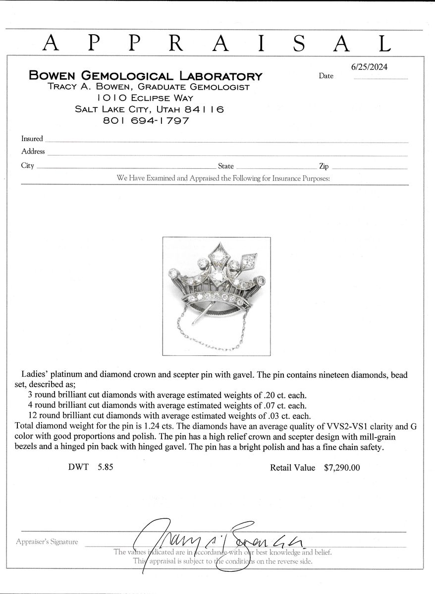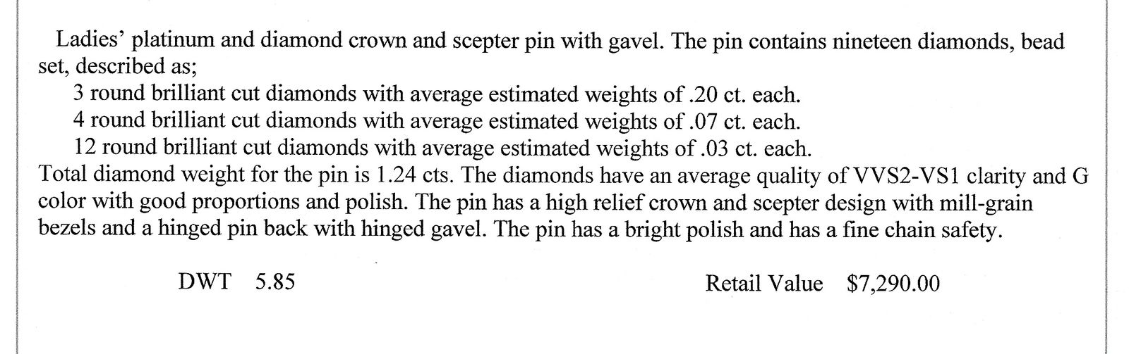 The accompanying appraisal (valued at $100-$150) documents the number, size and weights of the diamonds.
