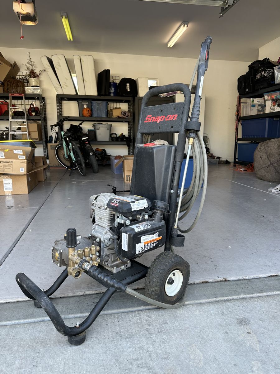 Snap-on heavy-duty gas pressure washer in good working condition. Starts up and runs strong. Commercial-quality unit — built much tougher than big box store models.