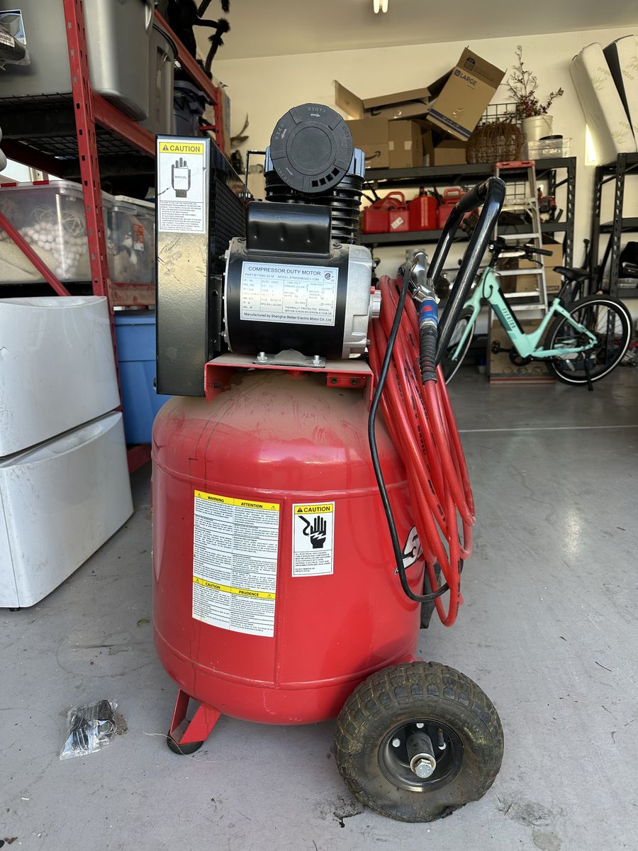 • Portable vertical tank with wheels • Heavy-duty motor • Great for garage, shop, or home projects • 110 V plug (see photo)