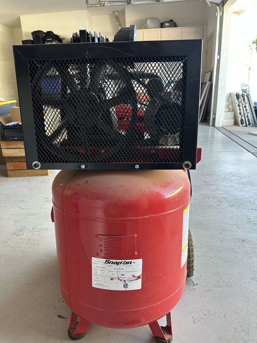 VenmoUsed Snap-on upright air compressor in good working condition. Runs strong and builds pressure as it should. Includes hose and fittings as shown in photos.