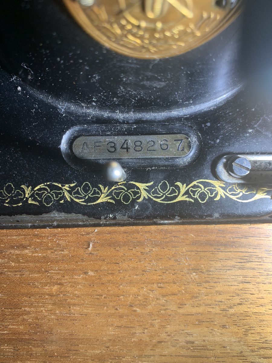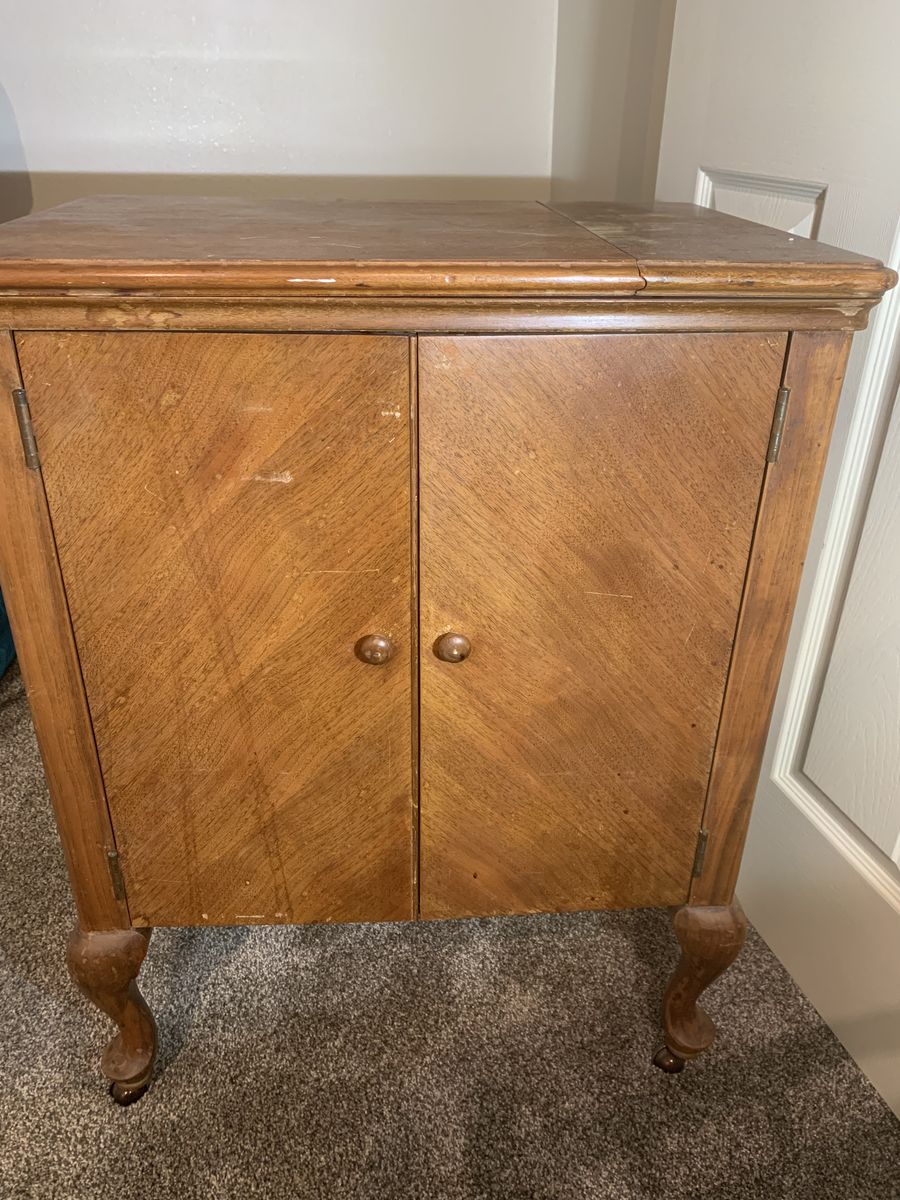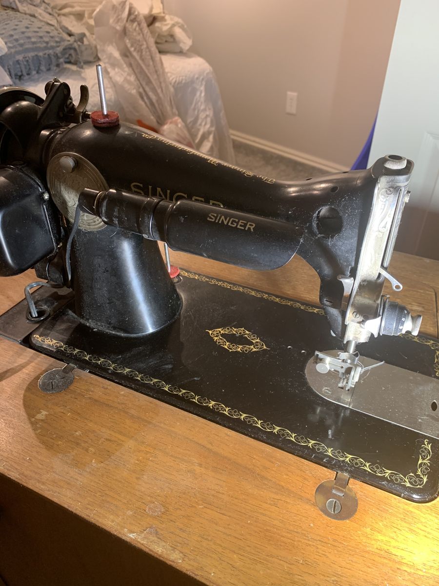 Singer sewing machine with cabinet. The machine works and was made around the 1940’s. Comes with the original manual. The sewing machine folds down into the cabinet so it can be hidden if desired.