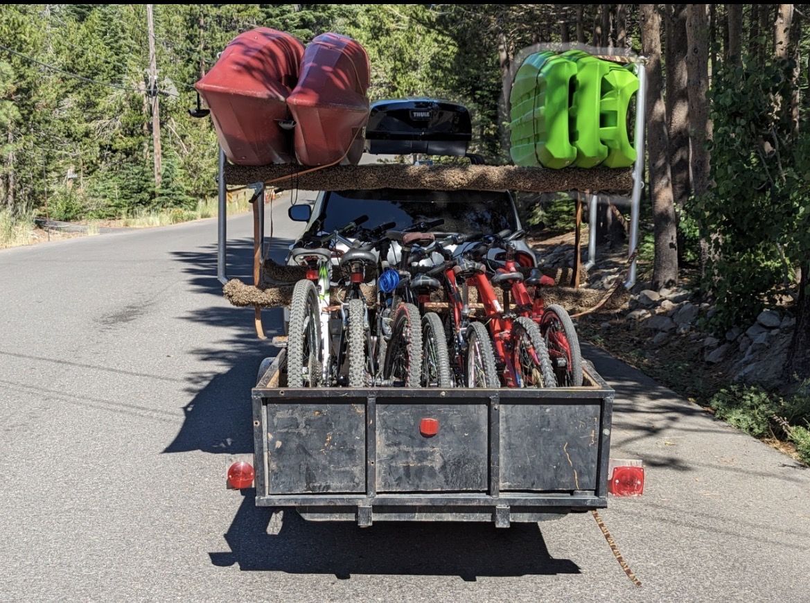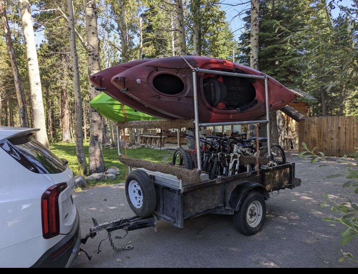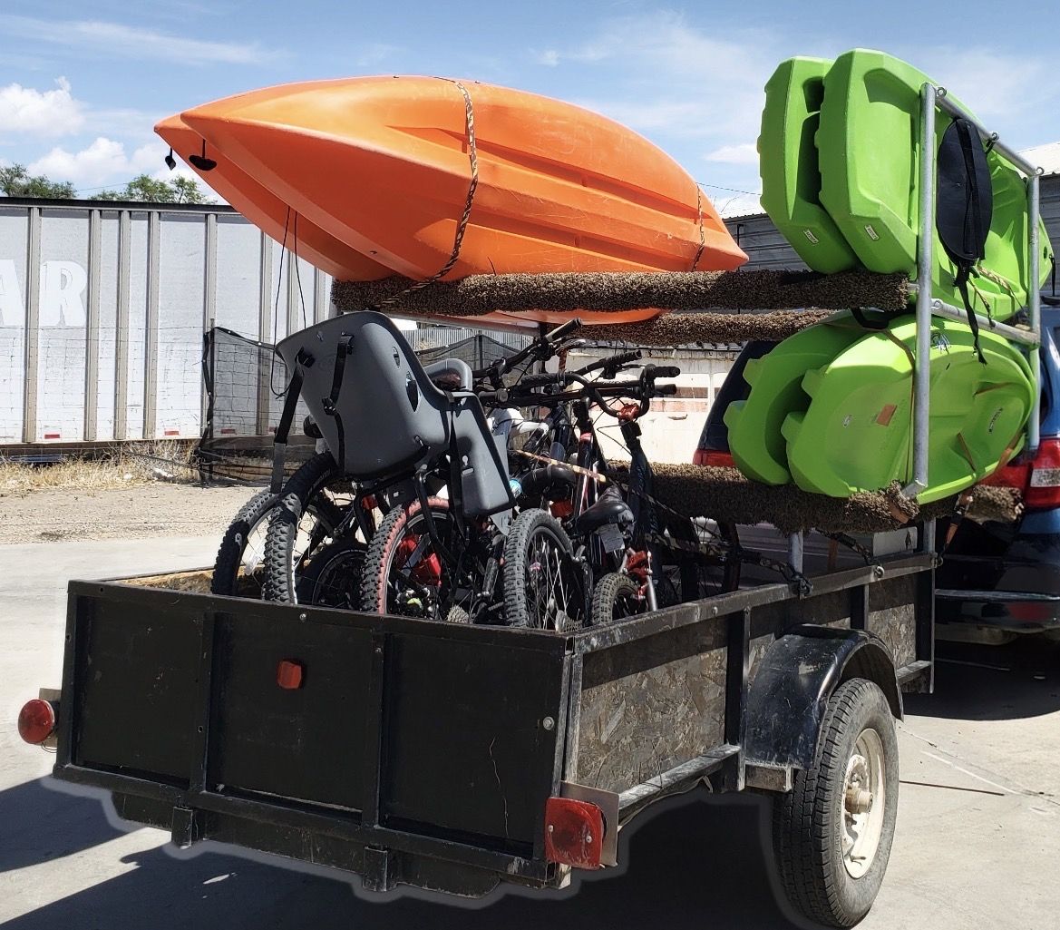 Can haul kayaks, bikes, coolers, tents. Has a large built in metal storage bin for oars, life jackets, etc