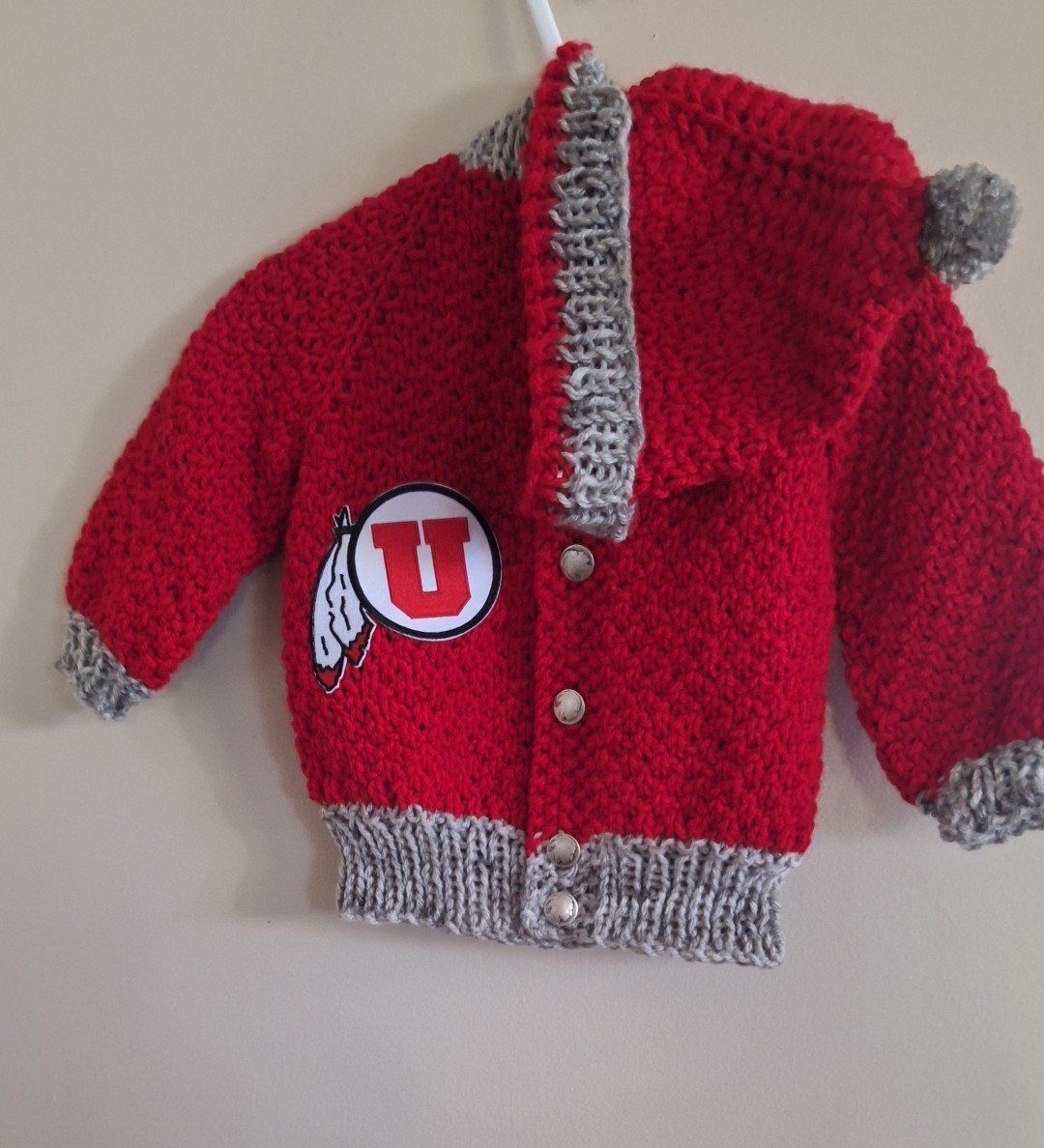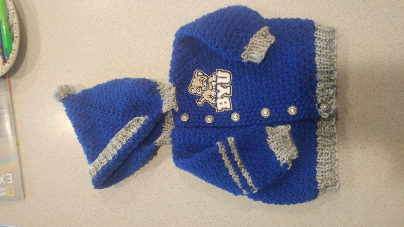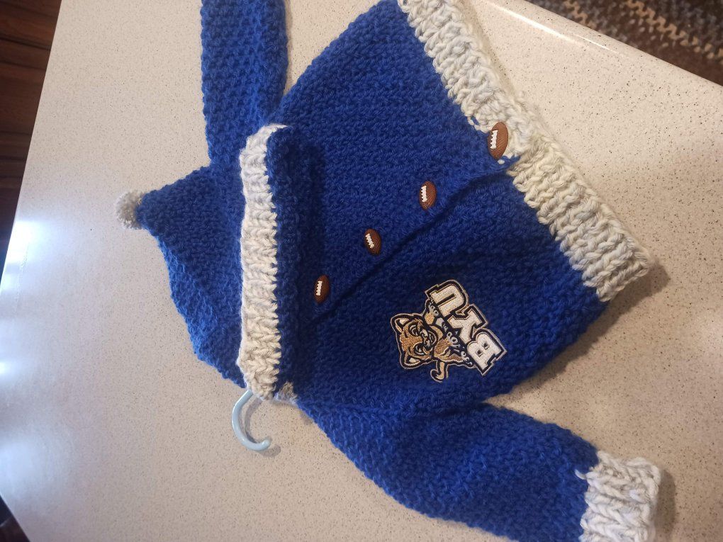 ZelleHand knit, one of a kind, hooded, button up, machine washable and very durable. Fits up to 18 months on average size baby.