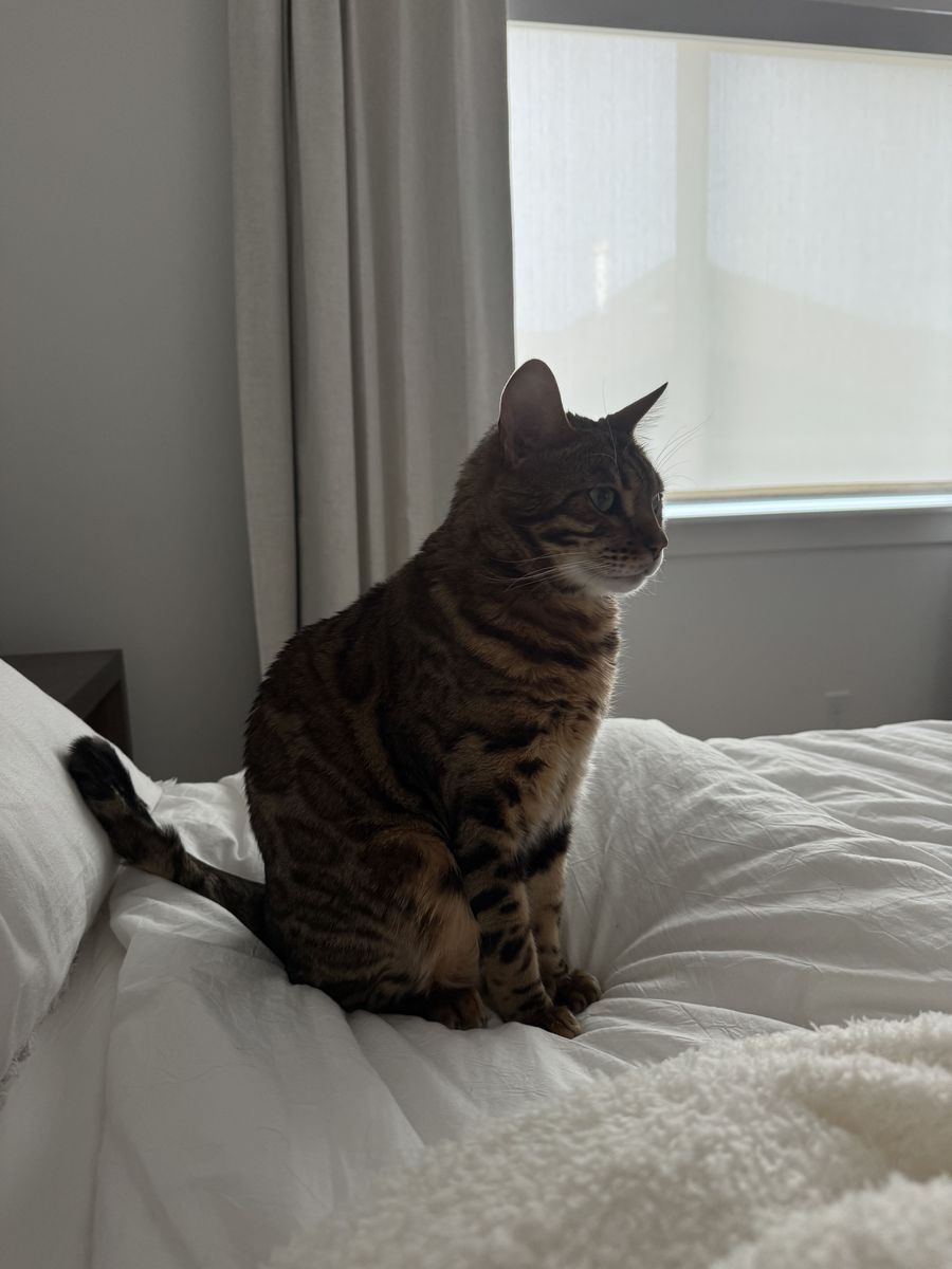 A beautiful, cuddly, and has been very good with my kids bengal cat. I am just struggling with him now being an outdoor/indoor cat, and has had some accidents in our new home.