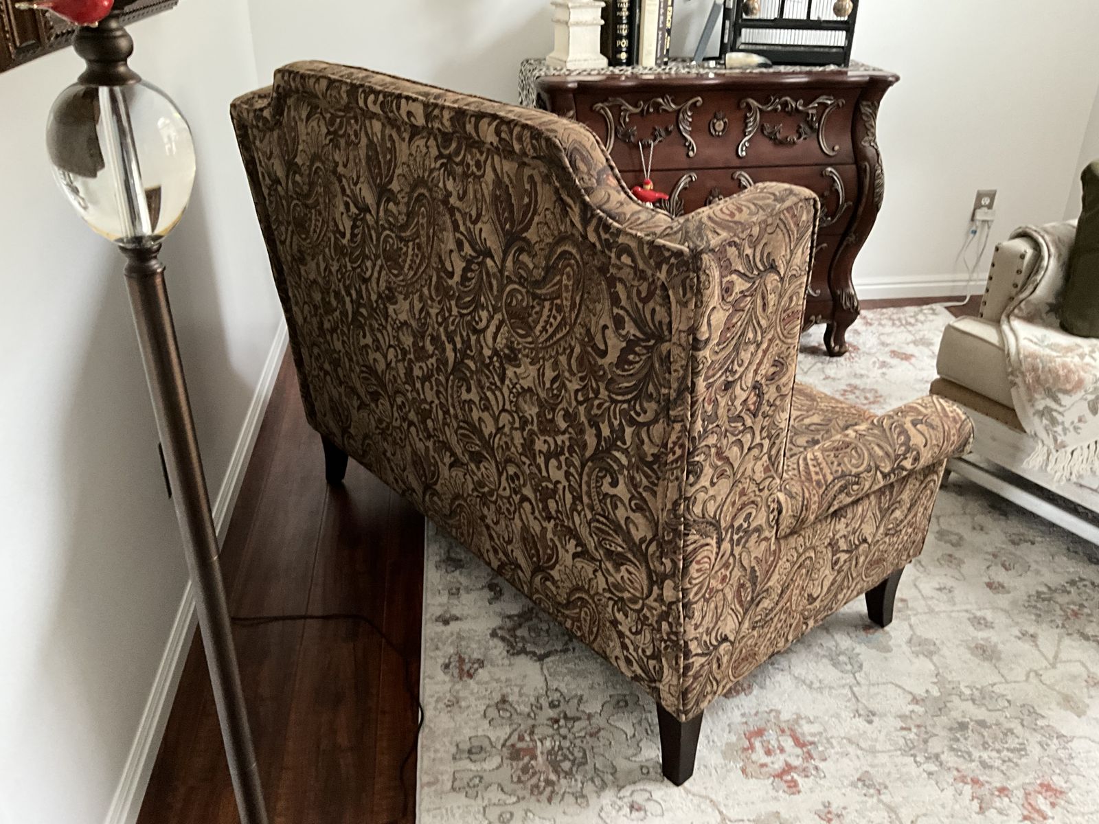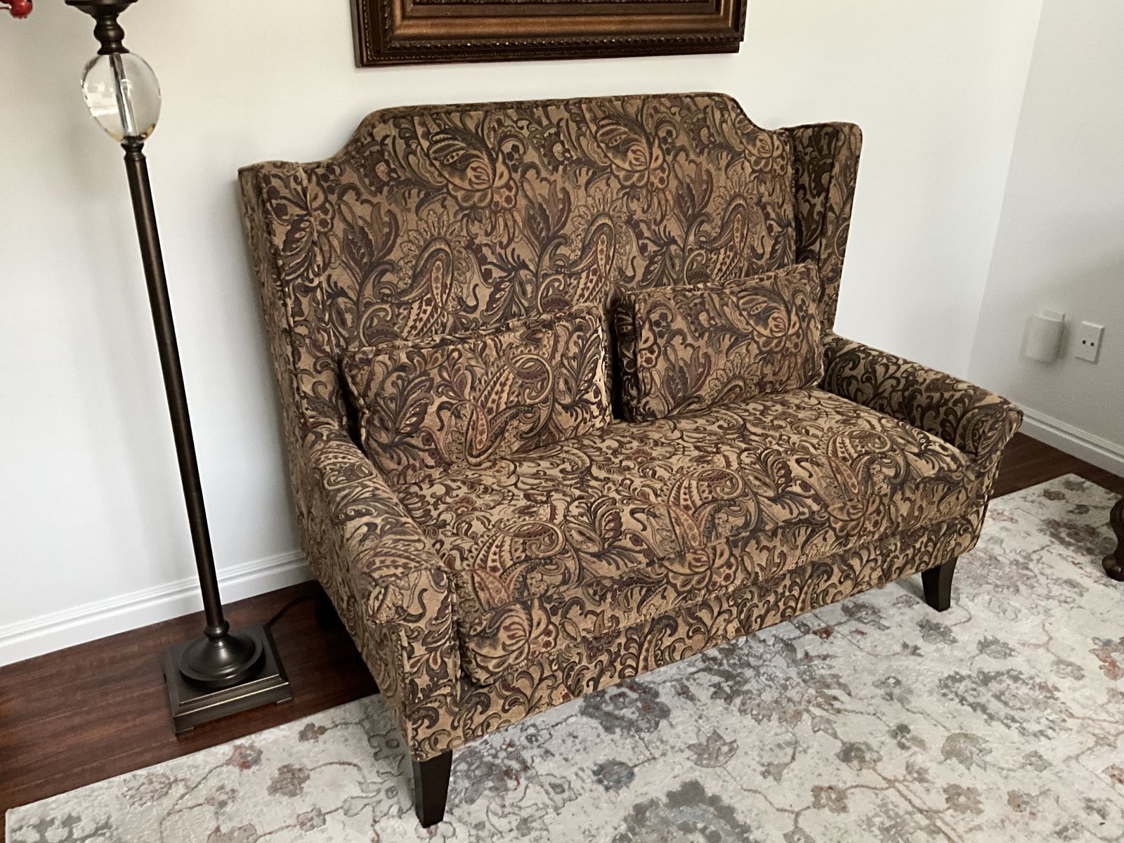 Beautiful neutral paisley print settee 54"W x 42"H x 30"D.