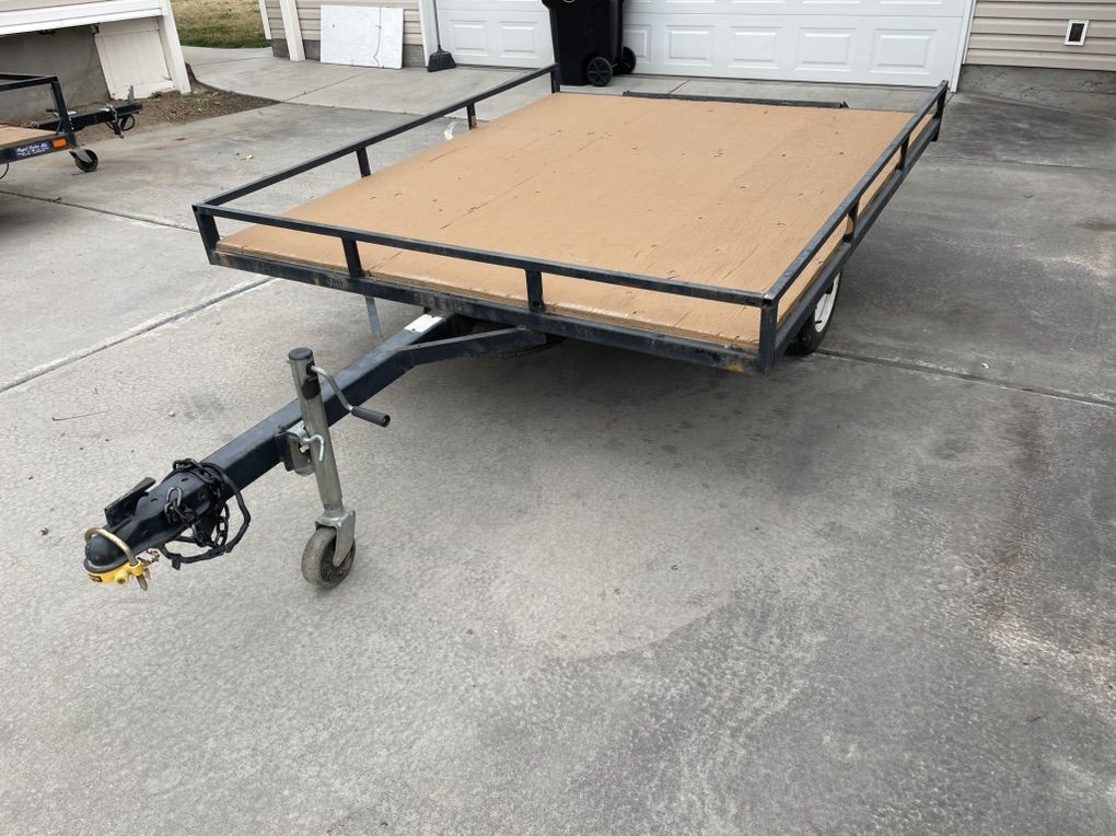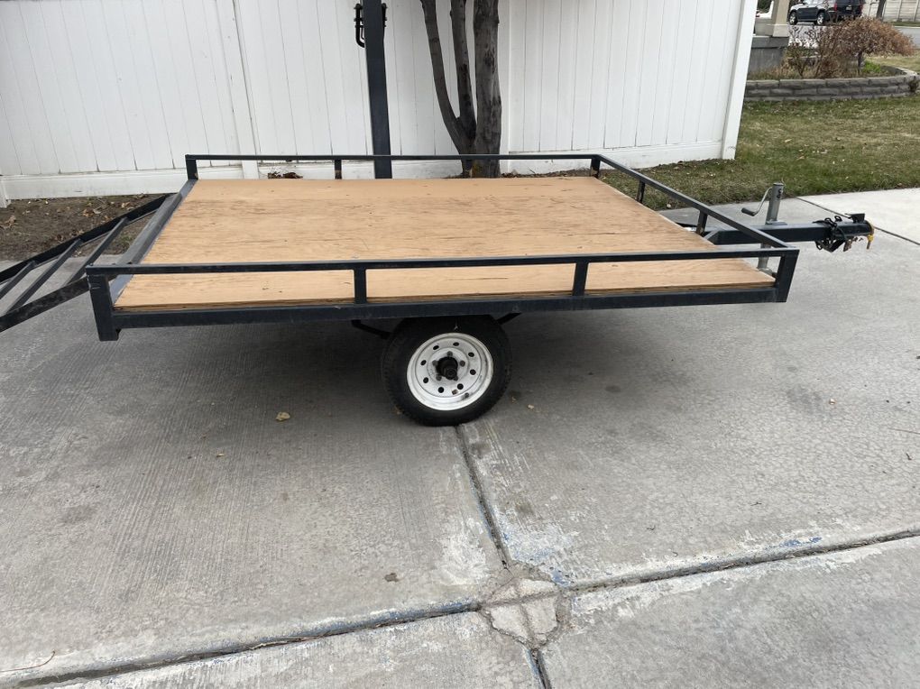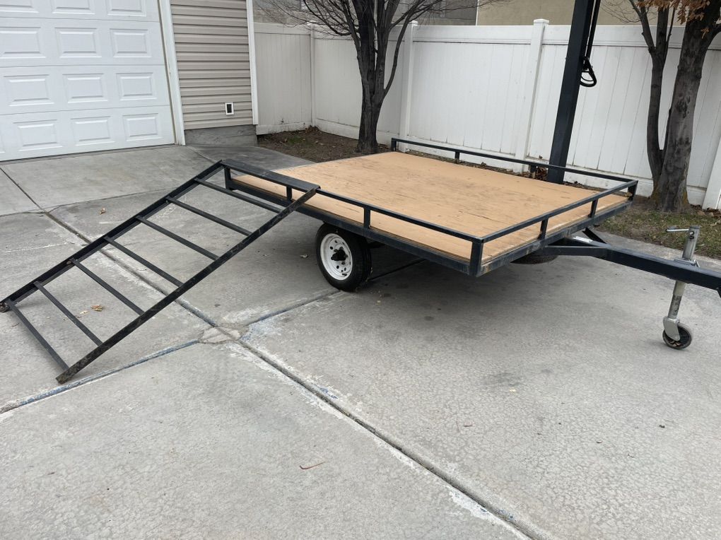 This trailer is in great condition. It is 7‘7“ long and 6‘2“ wide. The word deck is in great condition. I’ve always kept it painted. The ramp stores under the trailer for easy access and there is a spare tire great for hauling a four wheeler dirt bikes, or kayaks.